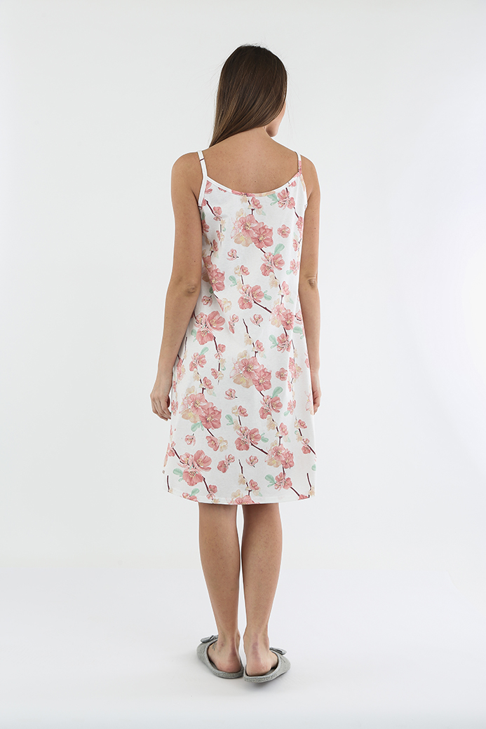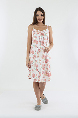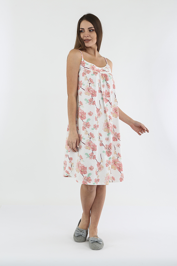 Женская сорочка из хлопкового трикотажа на бретелях. Длина миди и А-образный силуэт. Вырез горловины круглый. По переду – кокетка и изящный бантик. Низ полукруглой формы.
