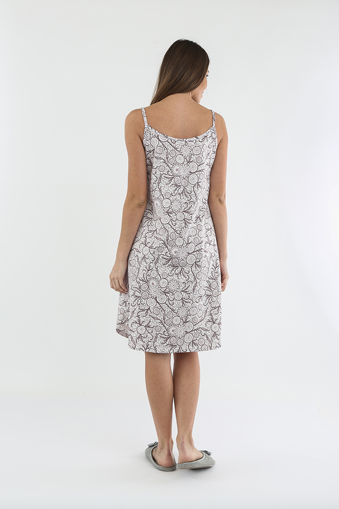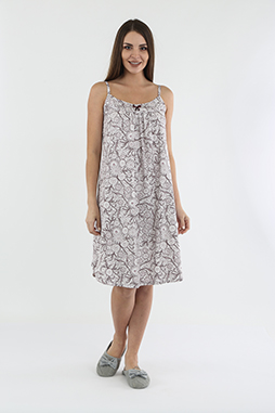 Женская сорочка из хлопкового трикотажа на бретелях. Длина миди и А-образный силуэт. Вырез горловины круглый. По переду – кокетка и изящный бантик. Низ полукруглой формы.