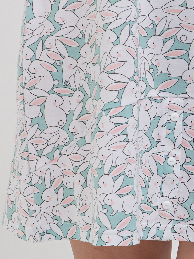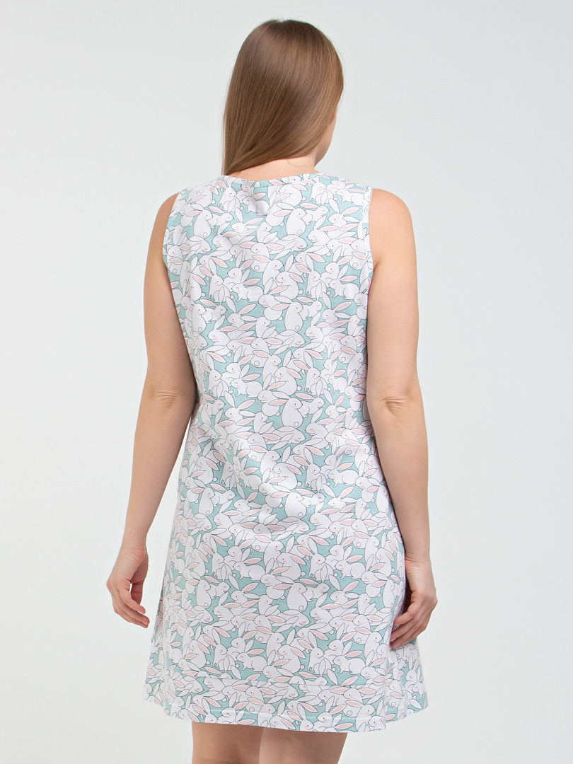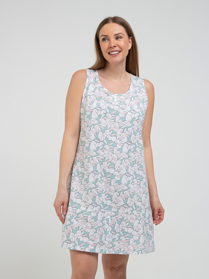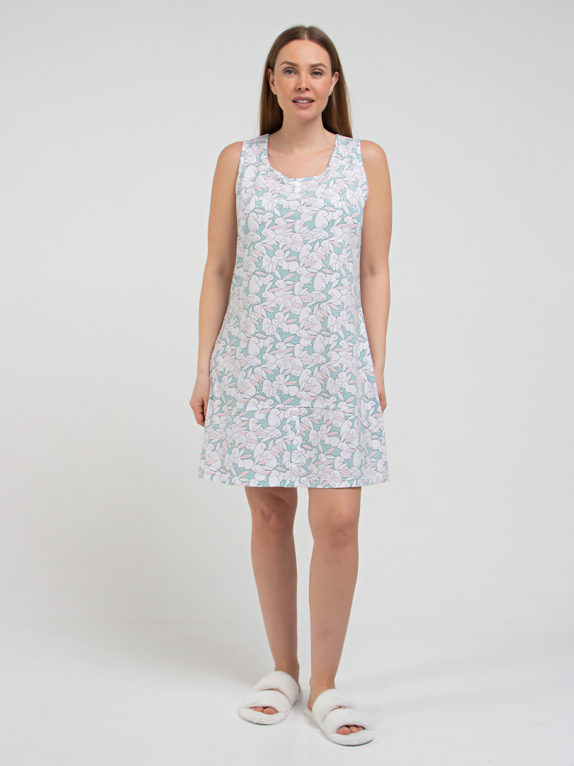 Сорочка женская из хлопкового набивного трикотажа полуприлегающего силуэта. Изделие без рукавов. Длина мини. Перед с кокеткой. На кокетке имитация застежки на планку с пуговицами. Кокетки и нижние части изделия выполнены из ткани-компаньона.