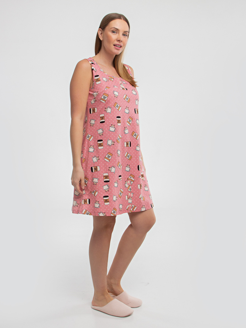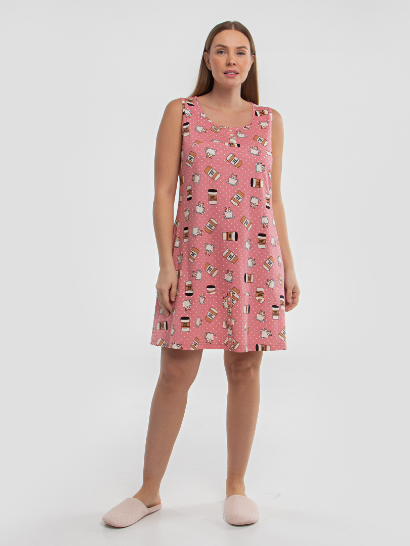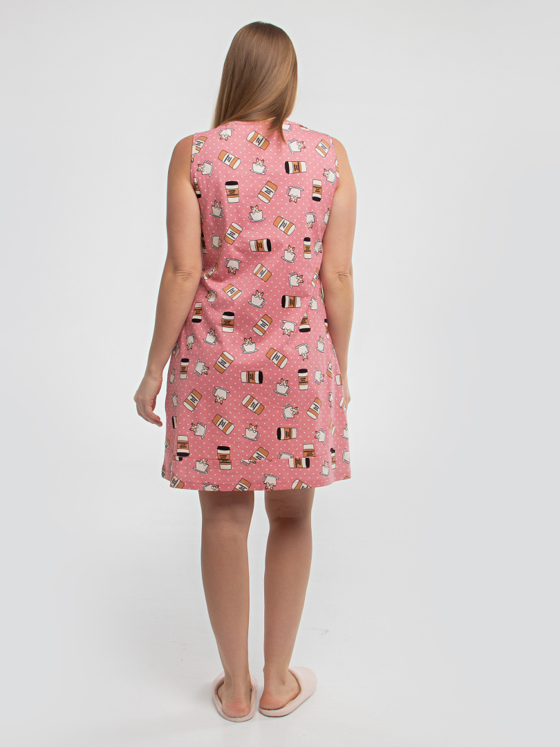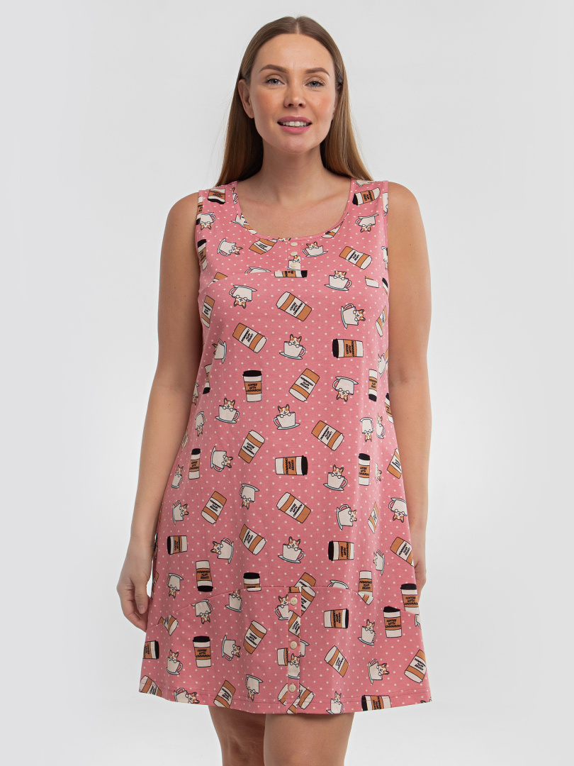 Сорочка женская из хлопкового набивного трикотажа полуприлегающего силуэта. Изделие без рукавов. Длина мини. Перед с кокеткой. На кокетке имитация застежки на планку с пуговицами. Кокетки и нижние части изделия выполнены из ткани-компаньона.