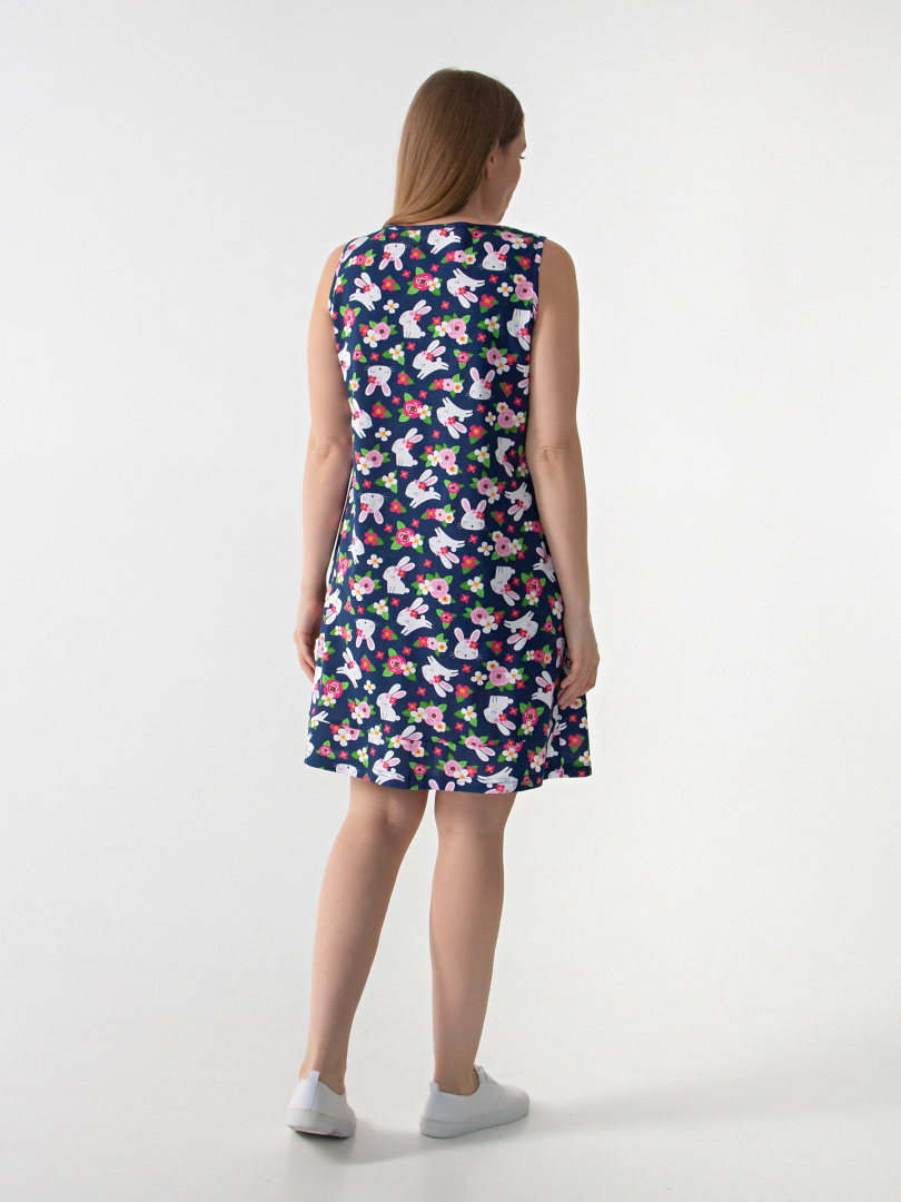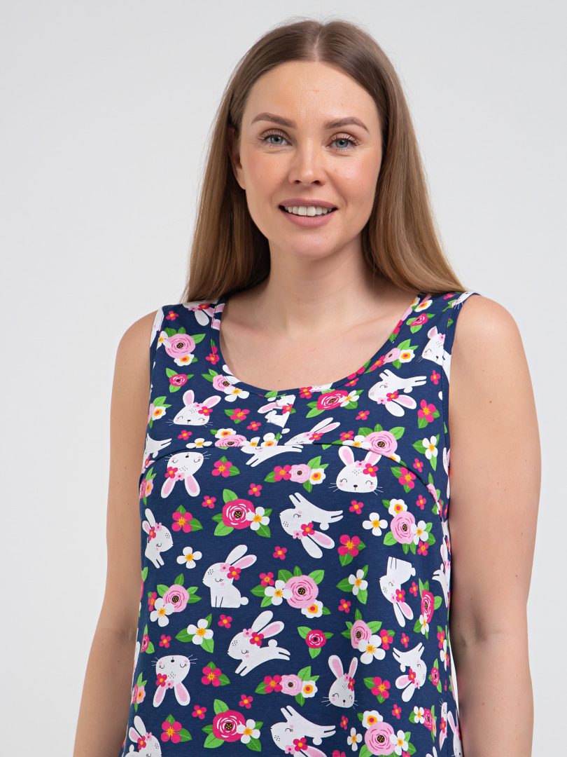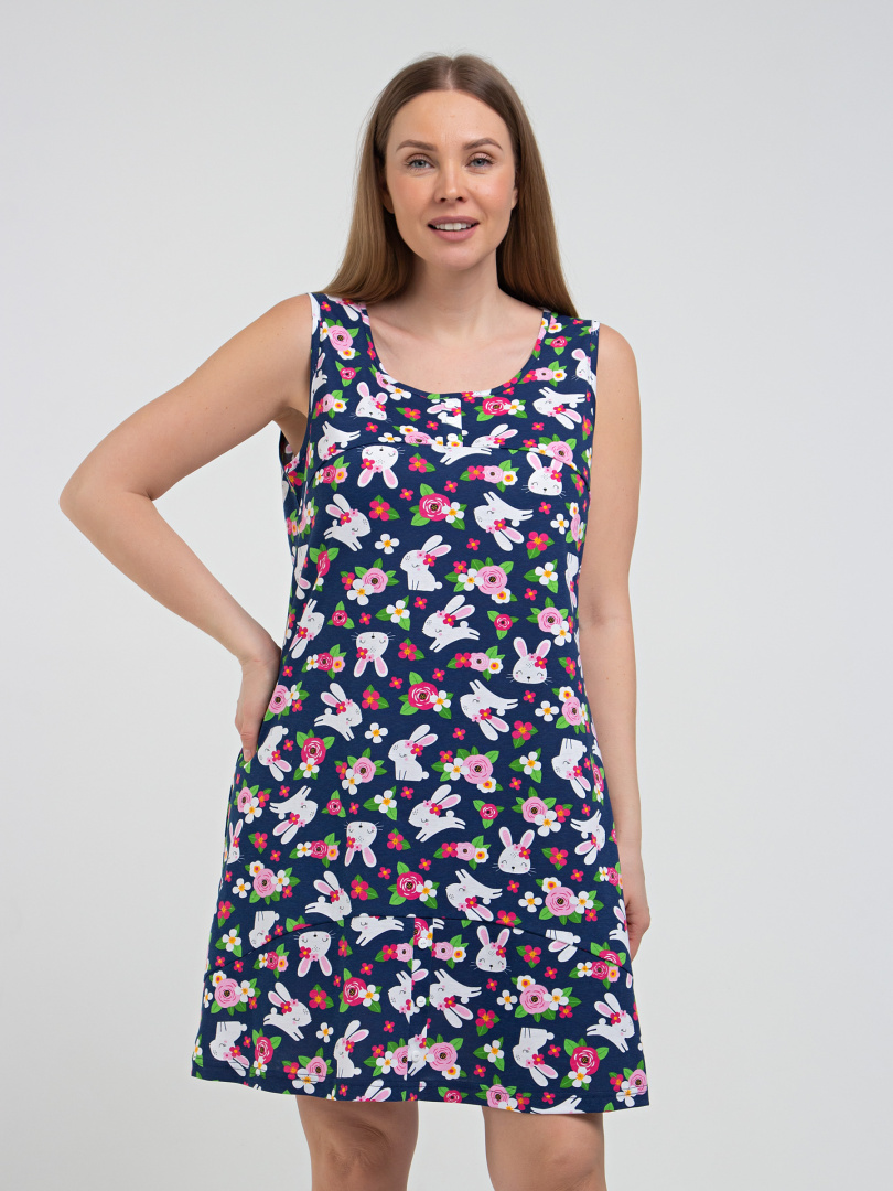 Сорочка женская из хлопкового набивного трикотажа полуприлегающего силуэта. Изделие без рукавов. Длина мини. Перед с кокеткой. На кокетке имитация застежки на планку с пуговицами. Кокетки и нижние части изделия выполнены из ткани-компаньона.