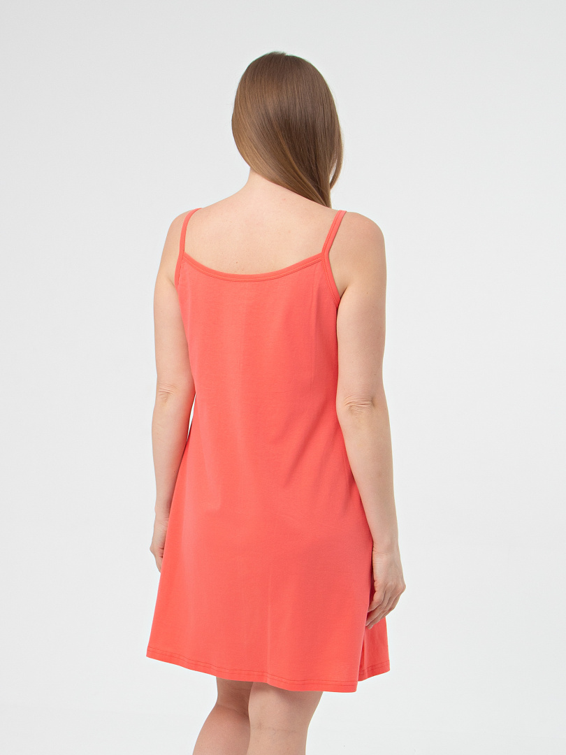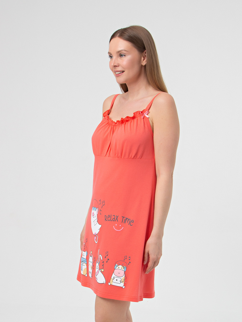 Миниатюрная женская сорочка из хлопкового трикотажа на бретелях. Длина мини и полуприлегающий силуэт. Лиф с кокеткой, присборенной под грудью и по горловине. Верхняя сборка выполнена с помощью мягкой резины. Перед декорирован контрастным принтом.