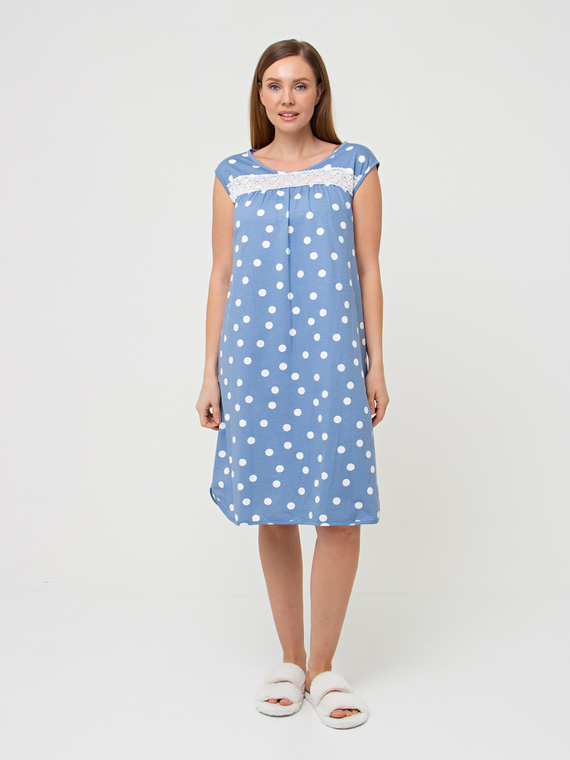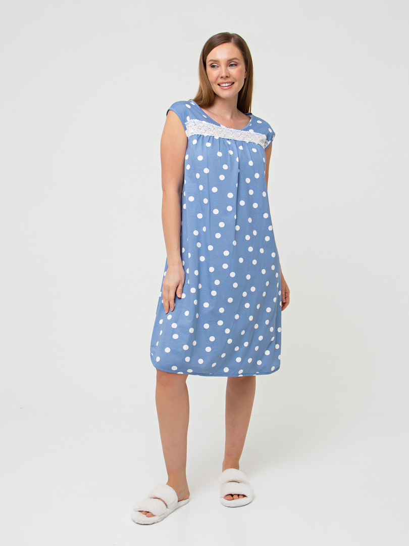 Сорочка женская из мягкого хлопкового набивного трикотажа А-образного силуэта. Длина миди. Лиф с кокеткой, декорированной кружевом. Модель без рукава очень удобная и комфортная для сна. Украшением этой сорочки является фигурная линия низа.