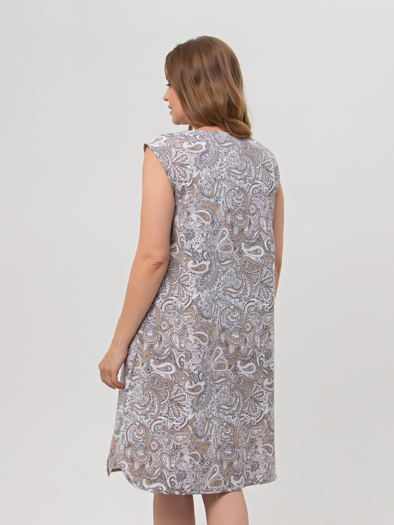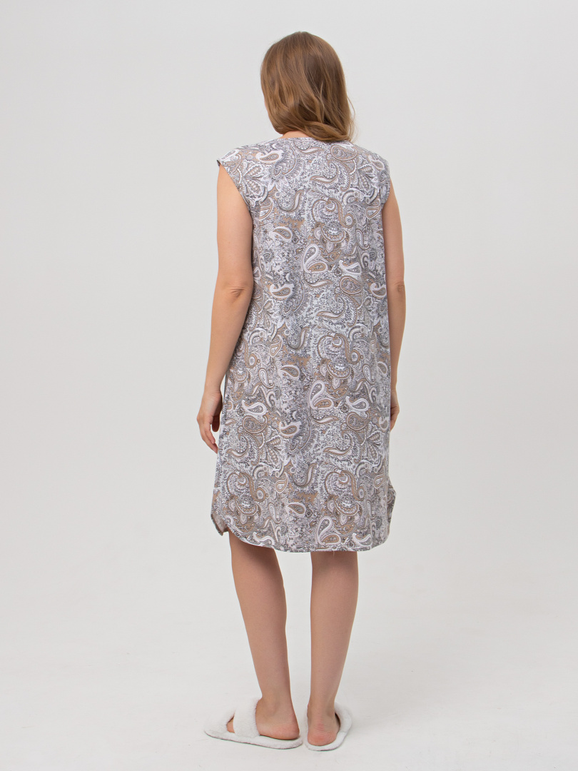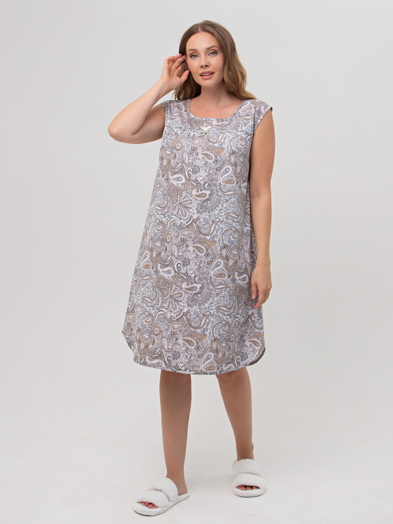 Сорочка женская из хлопкового набивного трикотажа свободного покроя.  Длина ниже колена и трапециевидный силуэт. Вырез горловины круглый.  На переде – кокетка.  Модель без рукава очень удобная и комфортная для сна. Украшением этой сорочки является фигурная линия низа и декоративные бантики из атласной ленты.