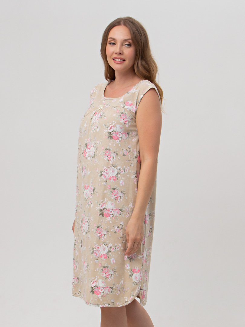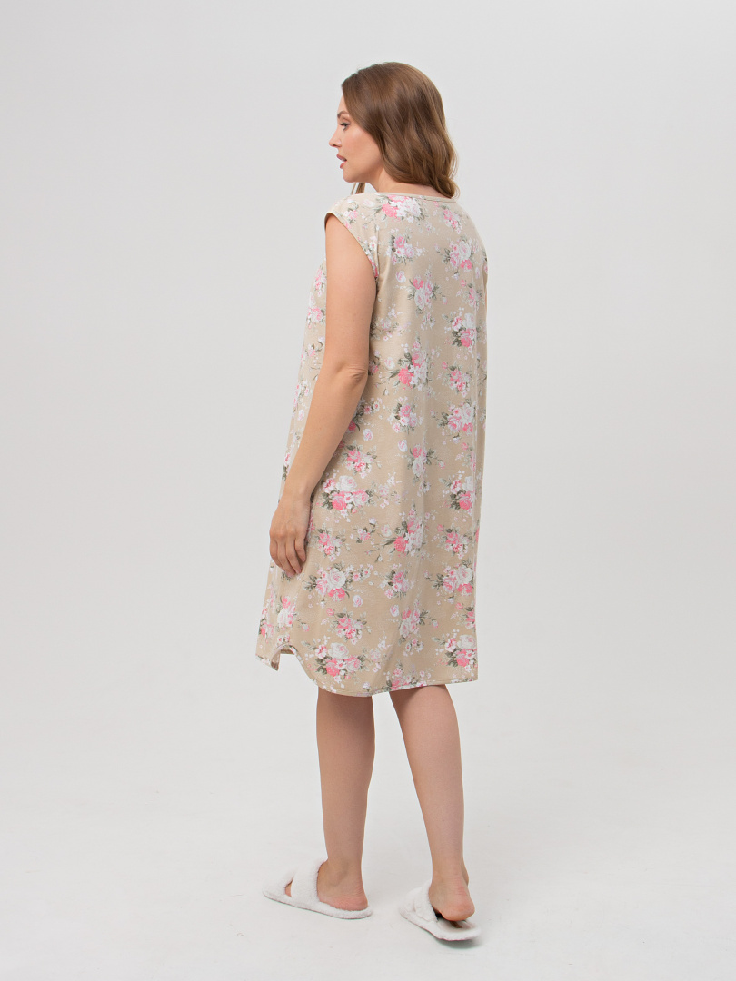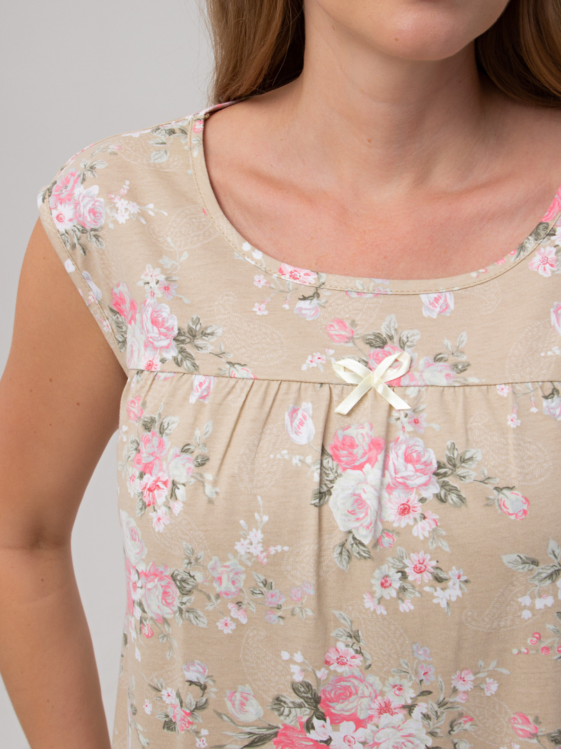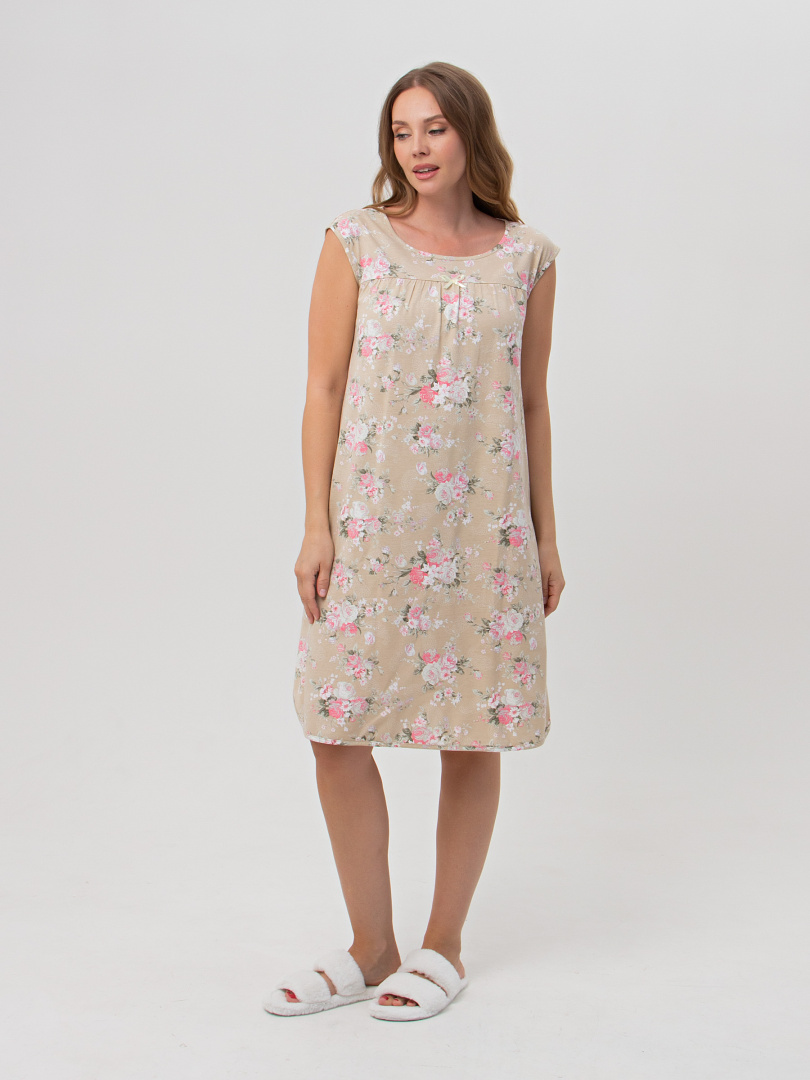 Сорочка женская из хлопкового набивного трикотажа свободного покроя.  Длина ниже колена и трапециевидный силуэт. Вырез горловины круглый.  На переде – кокетка.  Модель без рукава очень удобная и комфортная для сна. Украшением этой сорочки является фигурная линия низа и декоративные бантики из атласной ленты.