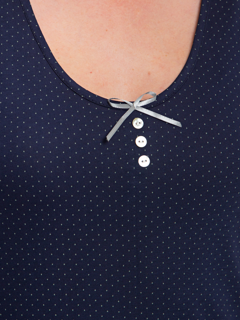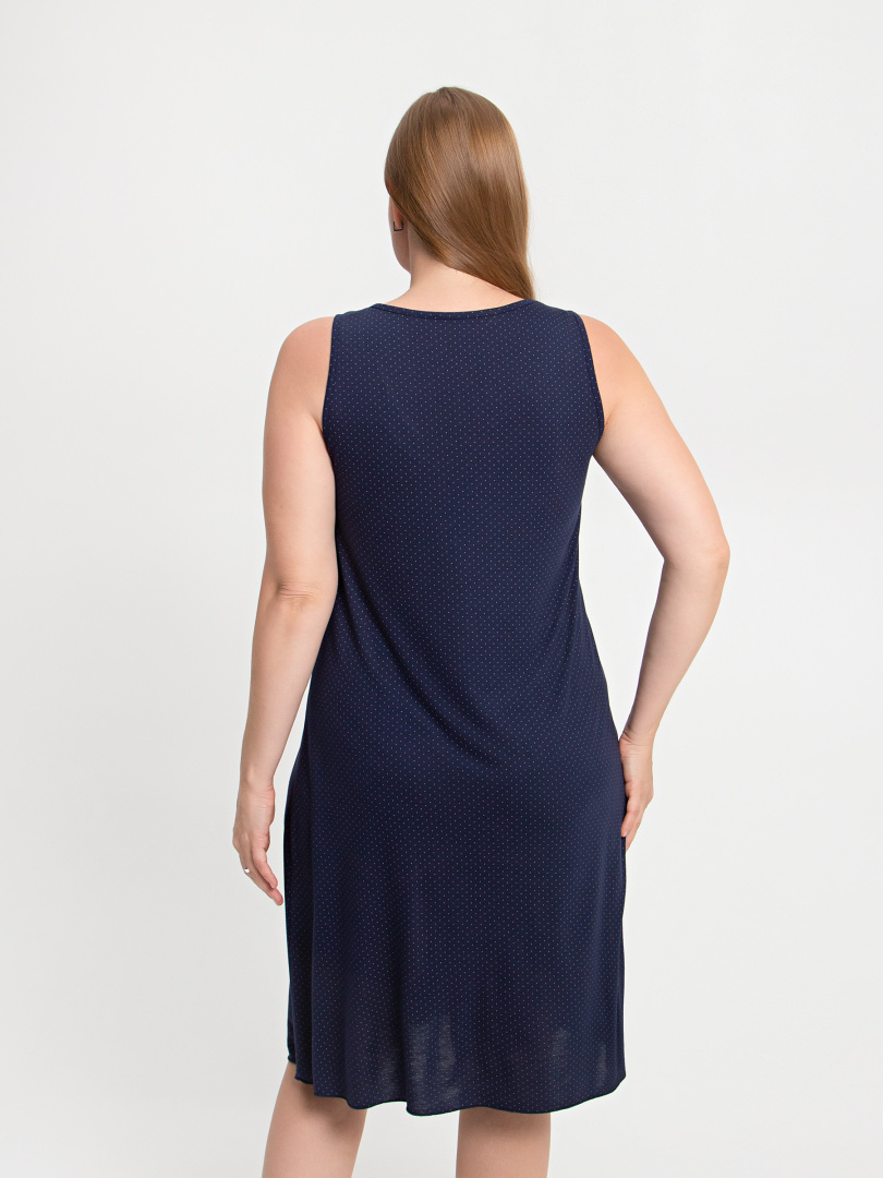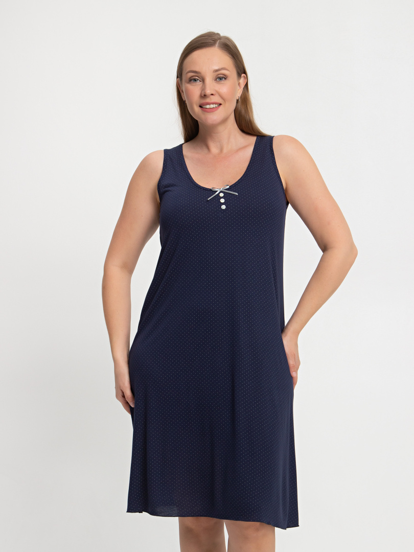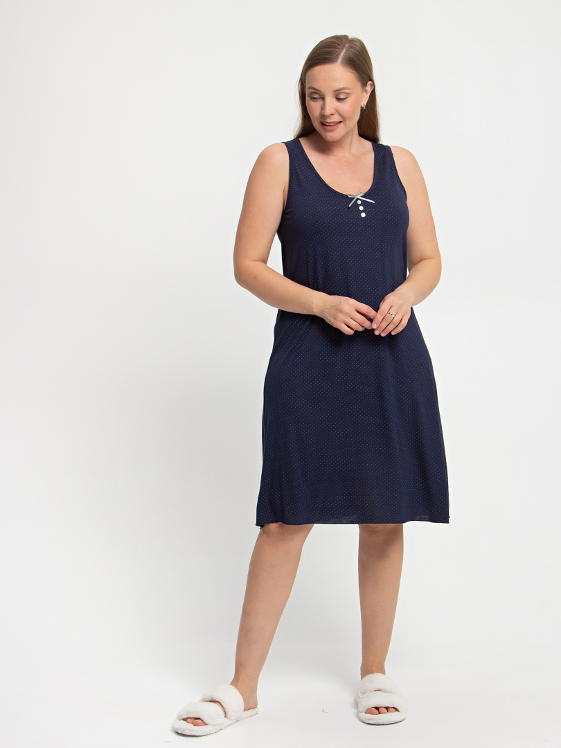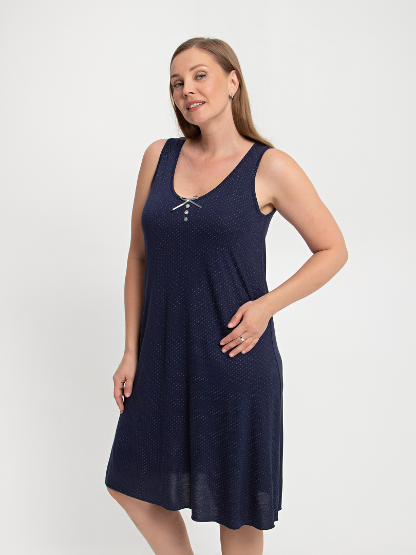 Сорочка женская из мягкого вискозного трикотажа А-образного силуэта. Длина миди. Модель без рукава очень удобная и комфортная для сна. Особенностью этой сорочки является вырез V-образный вырез горловины, украшенный бантиком и 3 пуговицами.