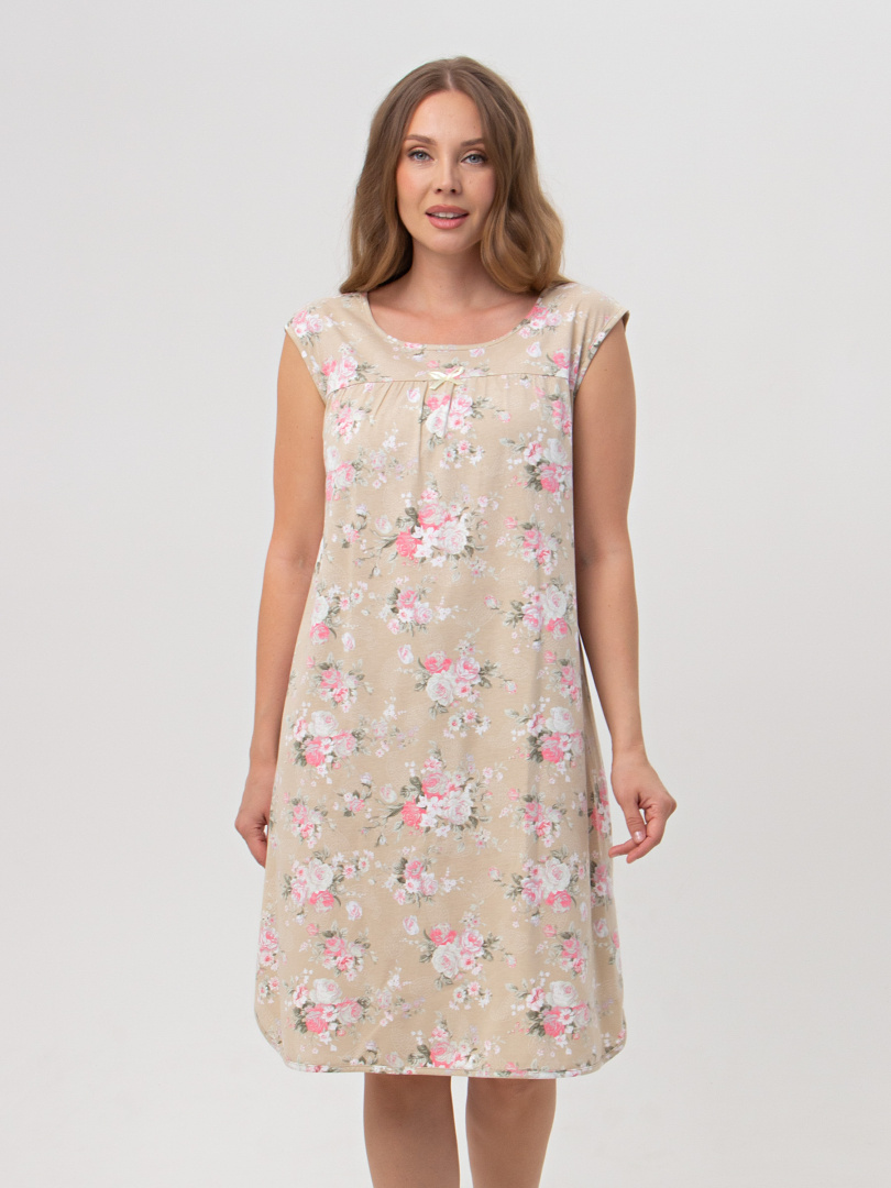 Сорочка женская из хлопкового набивного трикотажа свободного покроя. Длина ниже колена и трапециевидный силуэт. Вырез горловины круглый. На переде – кокетка. Модель без рукава очень удобная и комфортная для сна. Украшением этой сорочки является фигурная линия низа и декоративные бантики из атласной ленты.