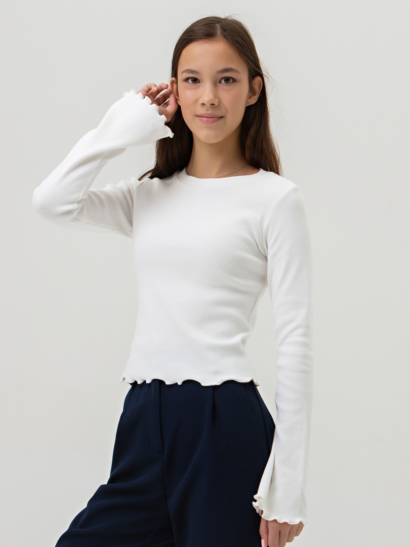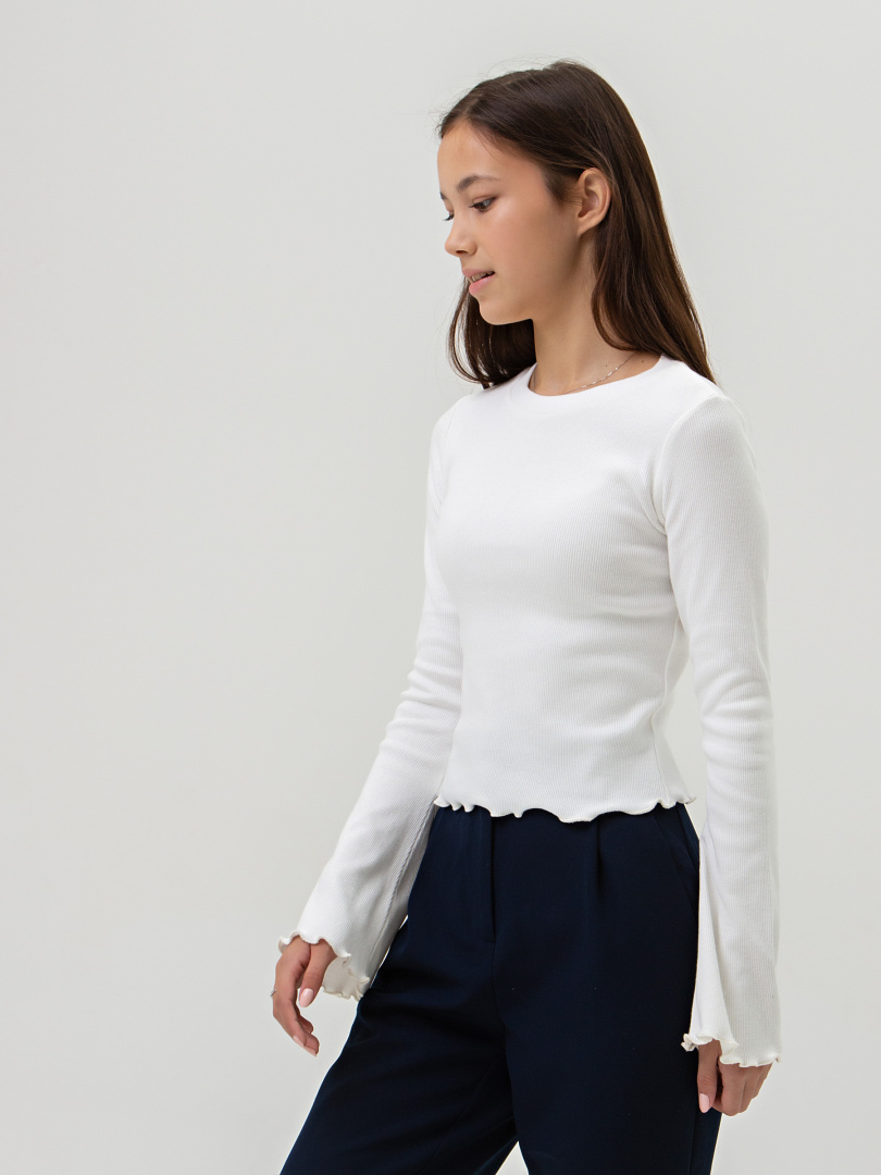 Укороченный джемпер из эластичного трикотажа. Силуэт ¬прямой прилегающий. Горловина круглая. Длинный рукав расклешен к низу.