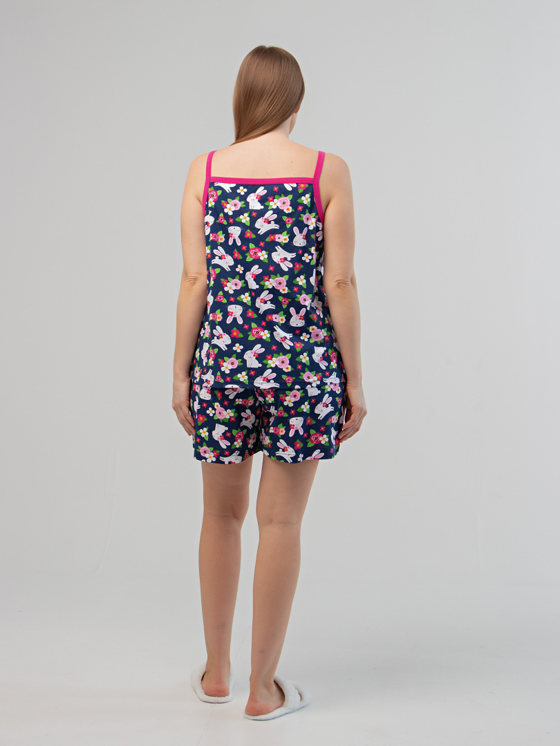 Женский комплект из майки и шорт. Майка свободного силуэта на бретелях. Изделие с отделочными бретелями и кокеткой. Перед декорирован контрастным принтом. Свободные шорты с защипами по переду и боковыми карманами. Пояс с широкой резиной.