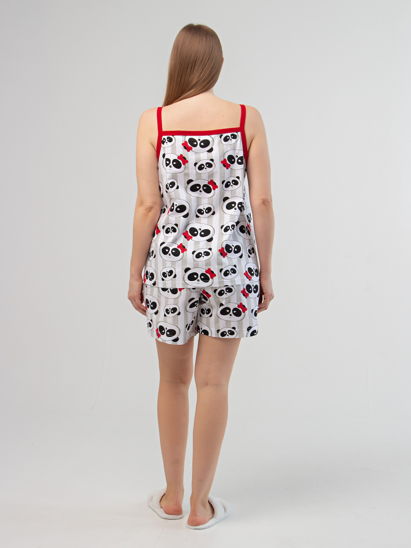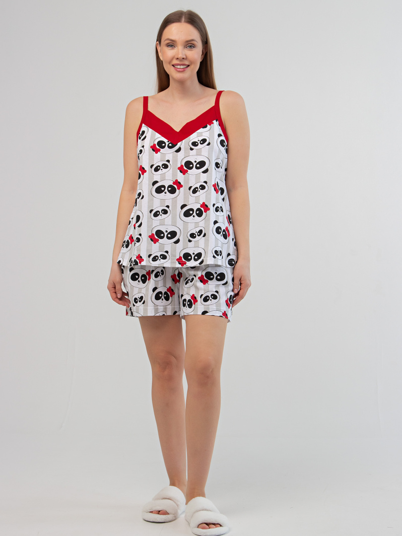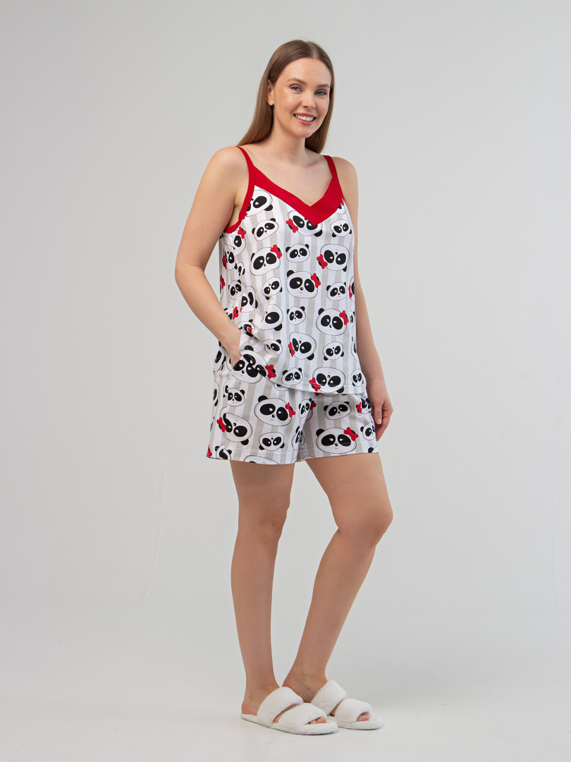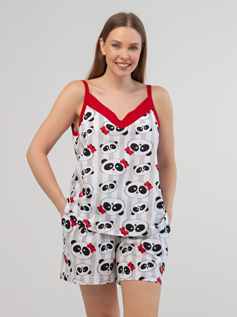 Женский комплект из майки и шорт. Майка свободного силуэта на бретелях. Изделие с отделочными бретелями и кокеткой. Перед декорирован контрастным принтом. Свободные шорты с защипами по переду и боковыми карманами. Пояс с широкой резиной.