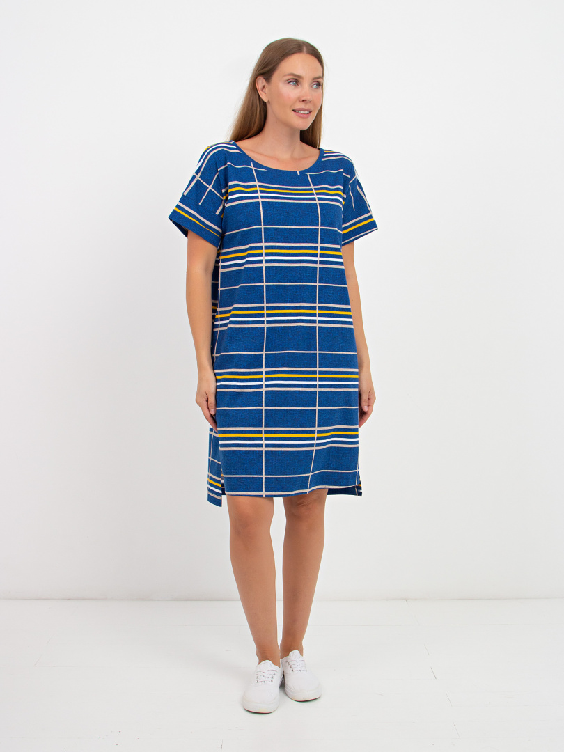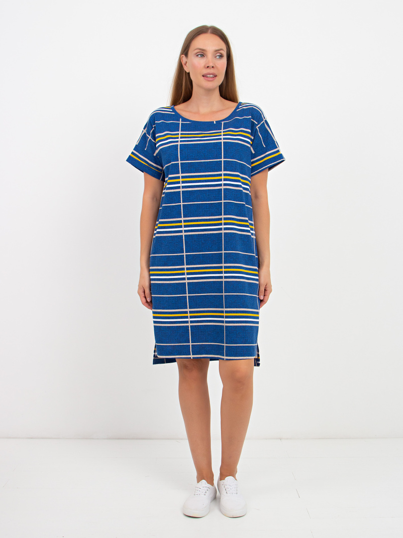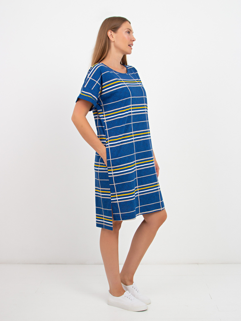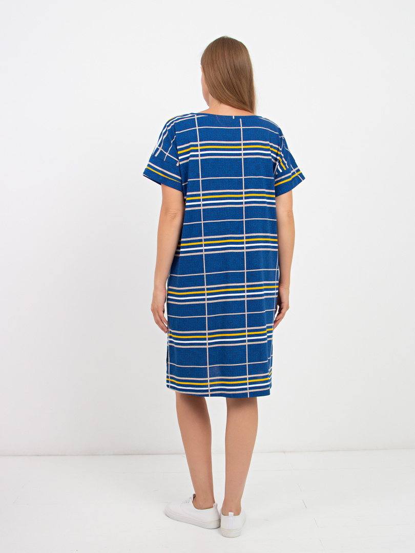 Женское трикотажное платье свободного покроя со спущенным рукавом. Силуэт прямой. Длина – выше колена, по боковым швам – разрезы. Вырез горловины круглый. В боковых швах модель имеет внутренние карманы. Особенность платья – удлиненная спинка.