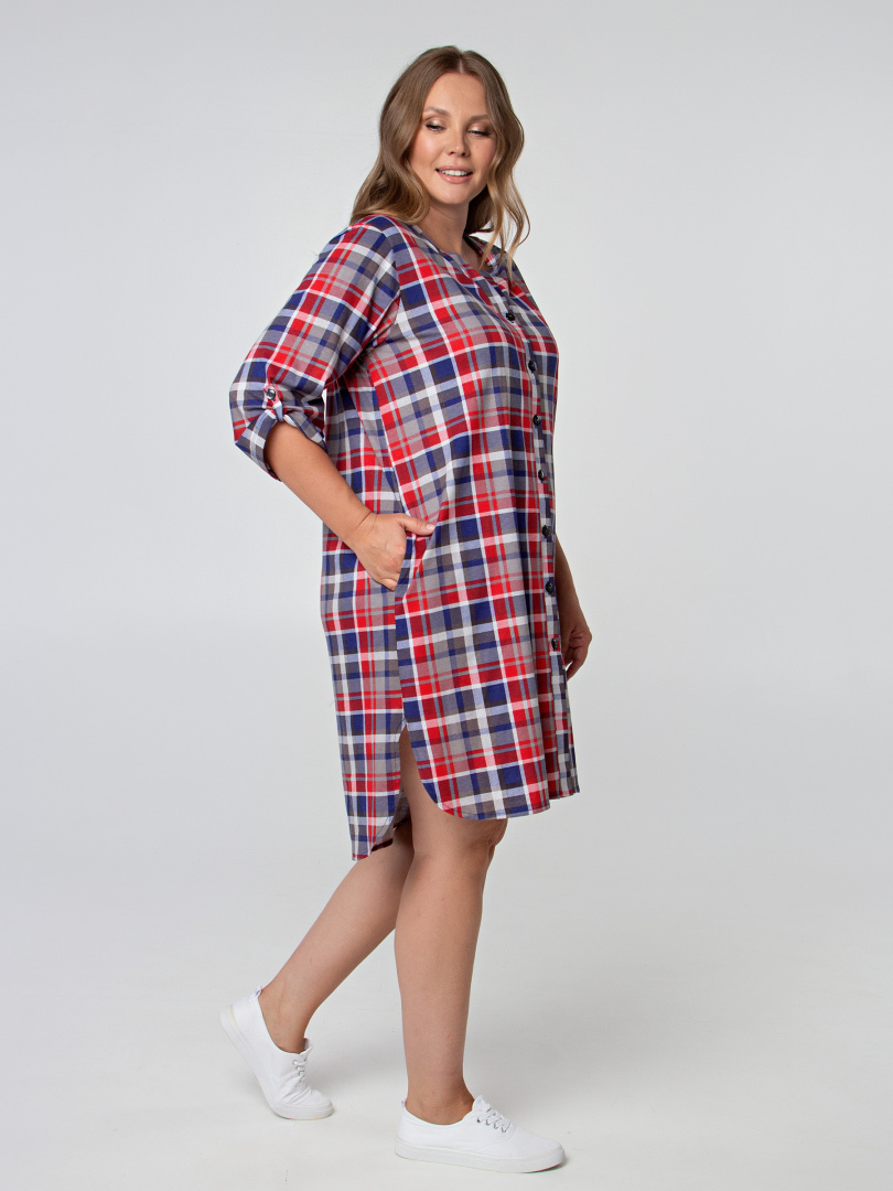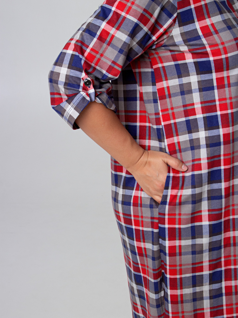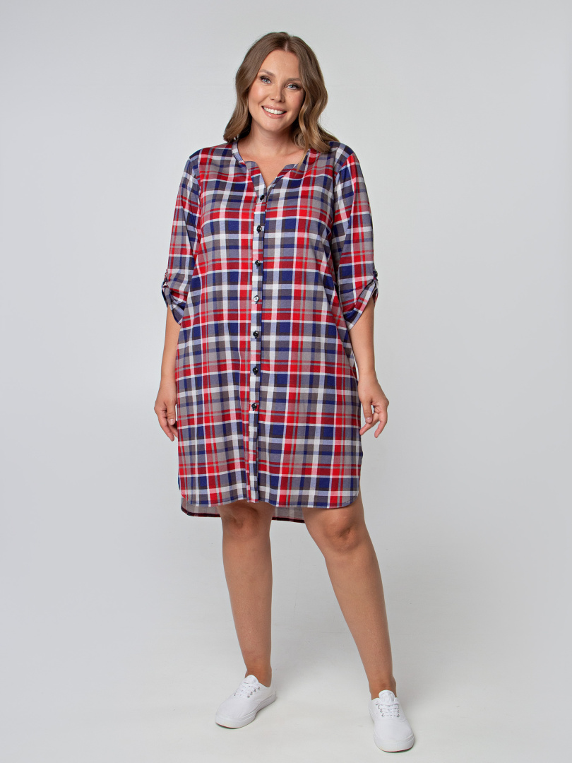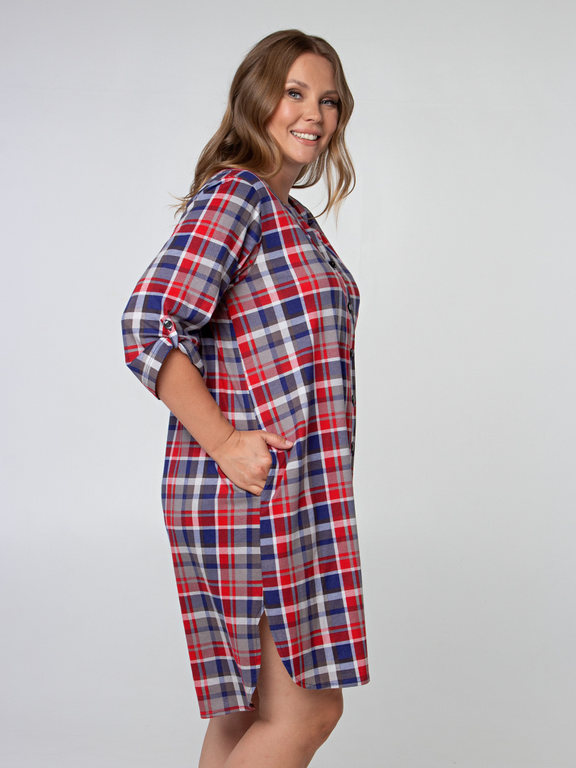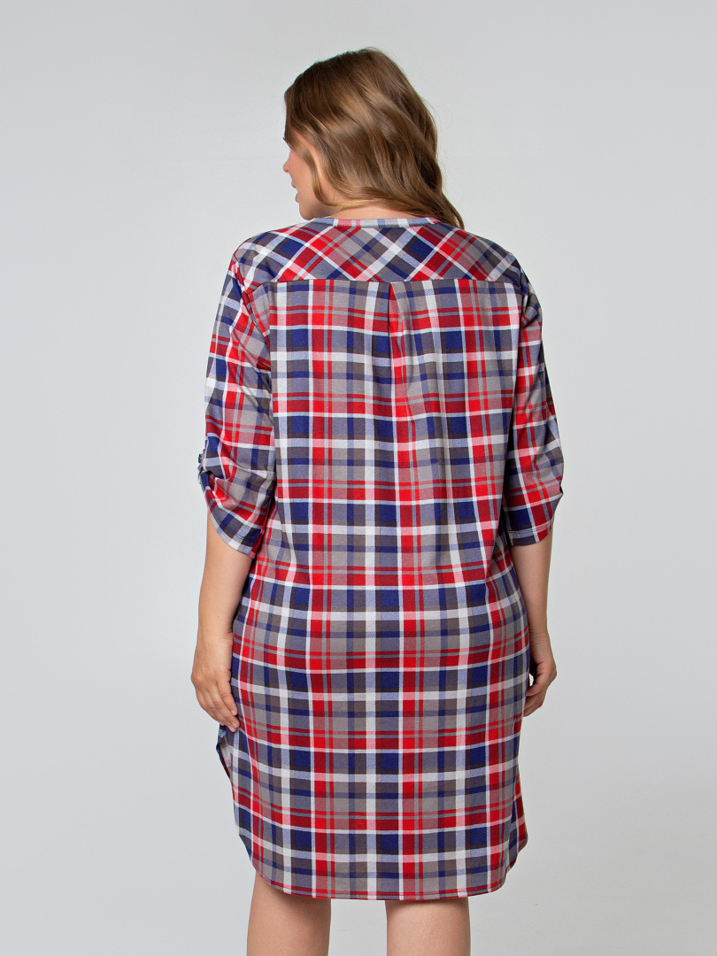 Женская трикотажная туника свободного рубашечного покроя с втачным  рукавом  длиной 3/4. По низу рукава – паты, застегивающиеся на пуговицу. Пата дает возможность регулировать длину рукава.  Длина изделия – миди.  У  модели  удлиненная спинка и боковые разрезы с закругленными краями.  По спинке туника имеет кокетку. Изделие с   застежкой на планке.