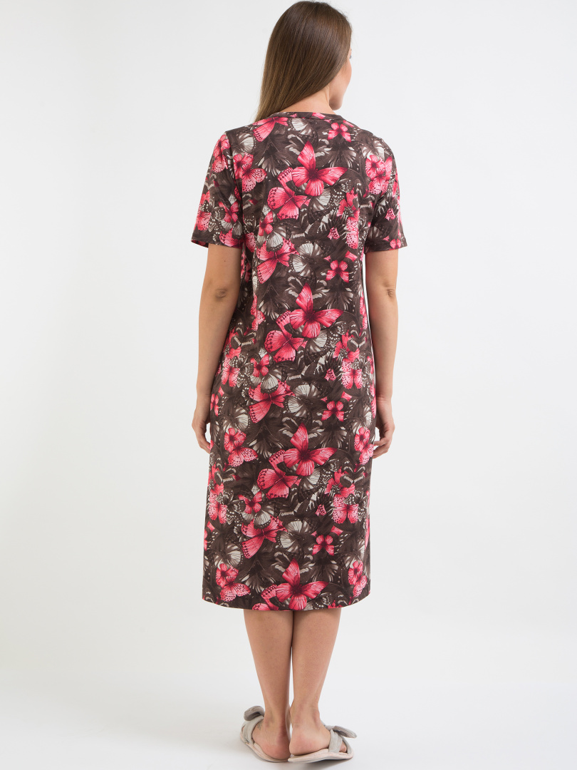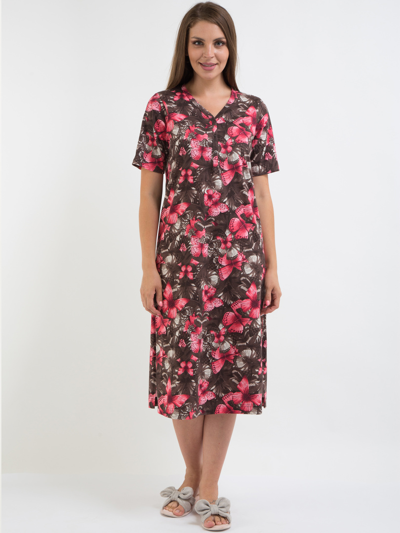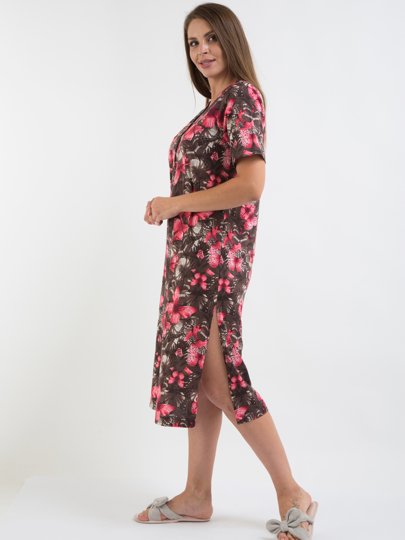 Туника из набивного трикотажа. Состав - хлопок 100%. Длина миди и прямой силуэт. V-образный вырез горловины окантован, переходя в планку с застежкой на 3 кнопки. Короткий втачной рукав. По бокам - разрезы.