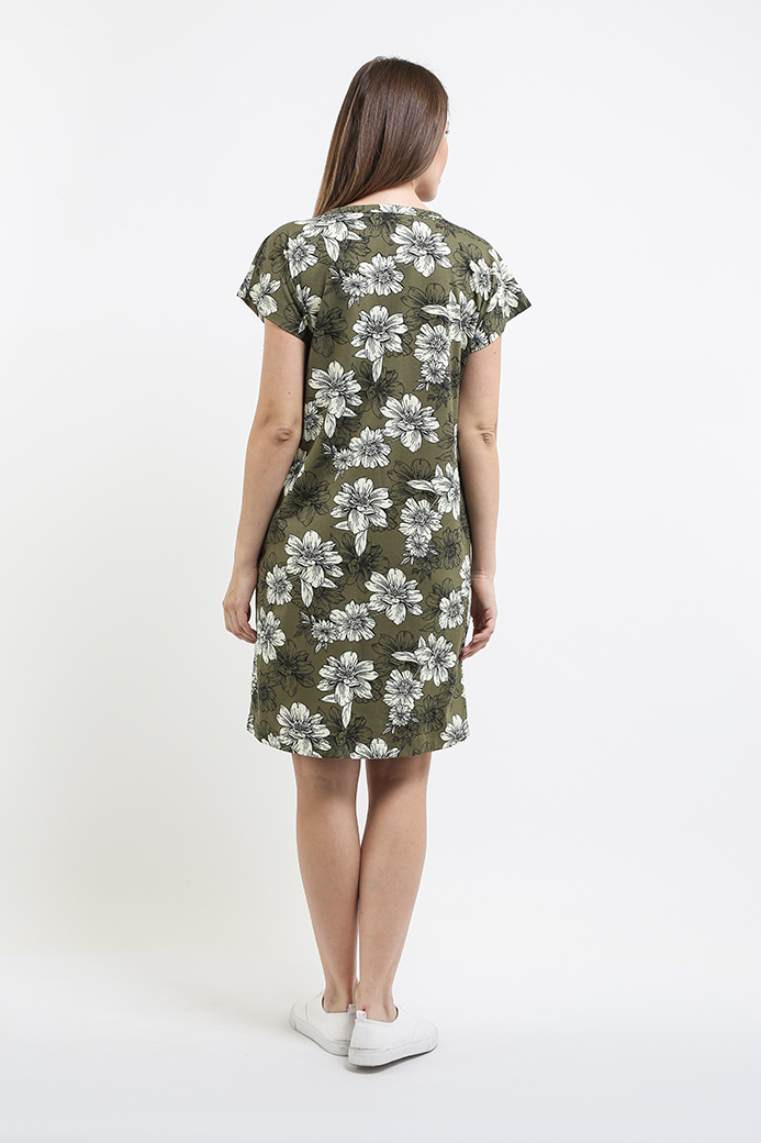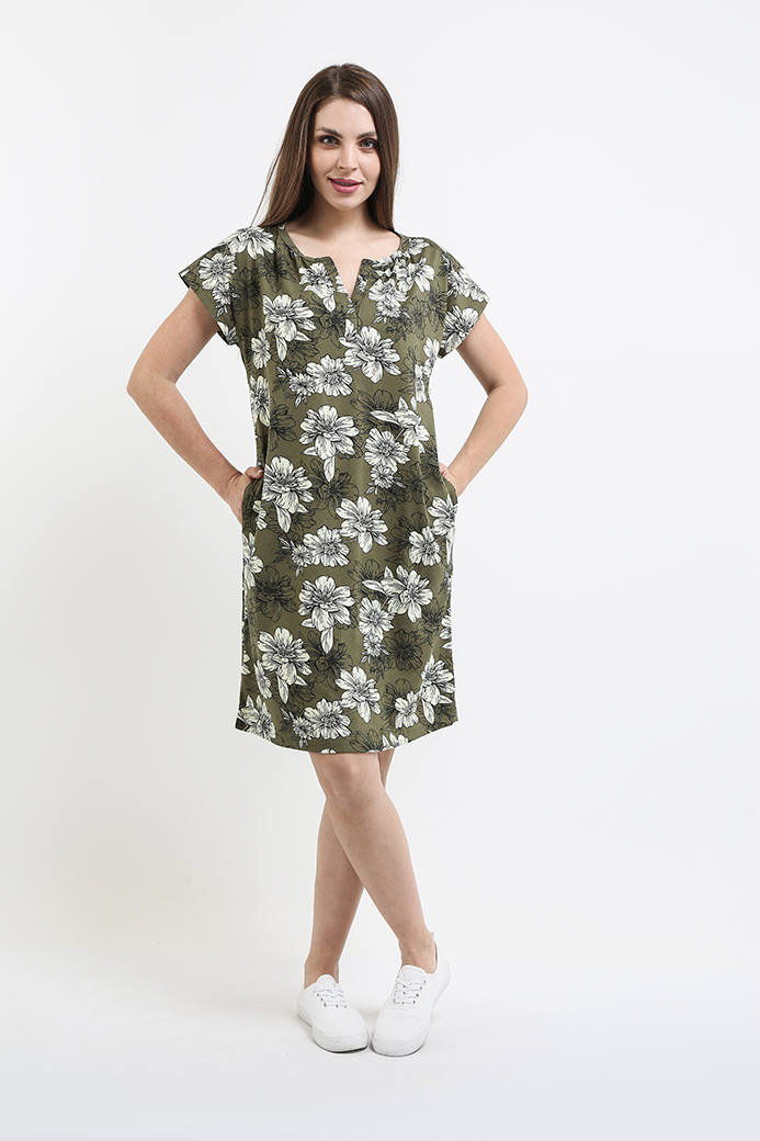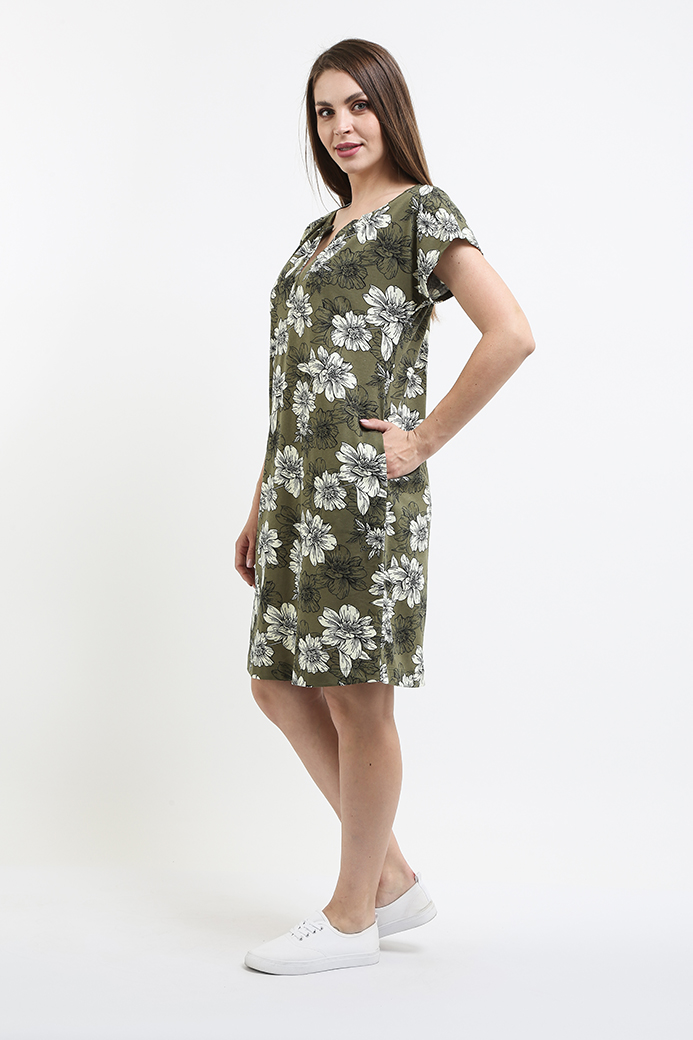 Туника из набивного трикотажа. Состав - хлопок 100%. Длина миди и прямой силуэт. Вырез горловины круглый. По переду планка. В боковых швах два внутренних кармана. Короткий рукав-кимоно.