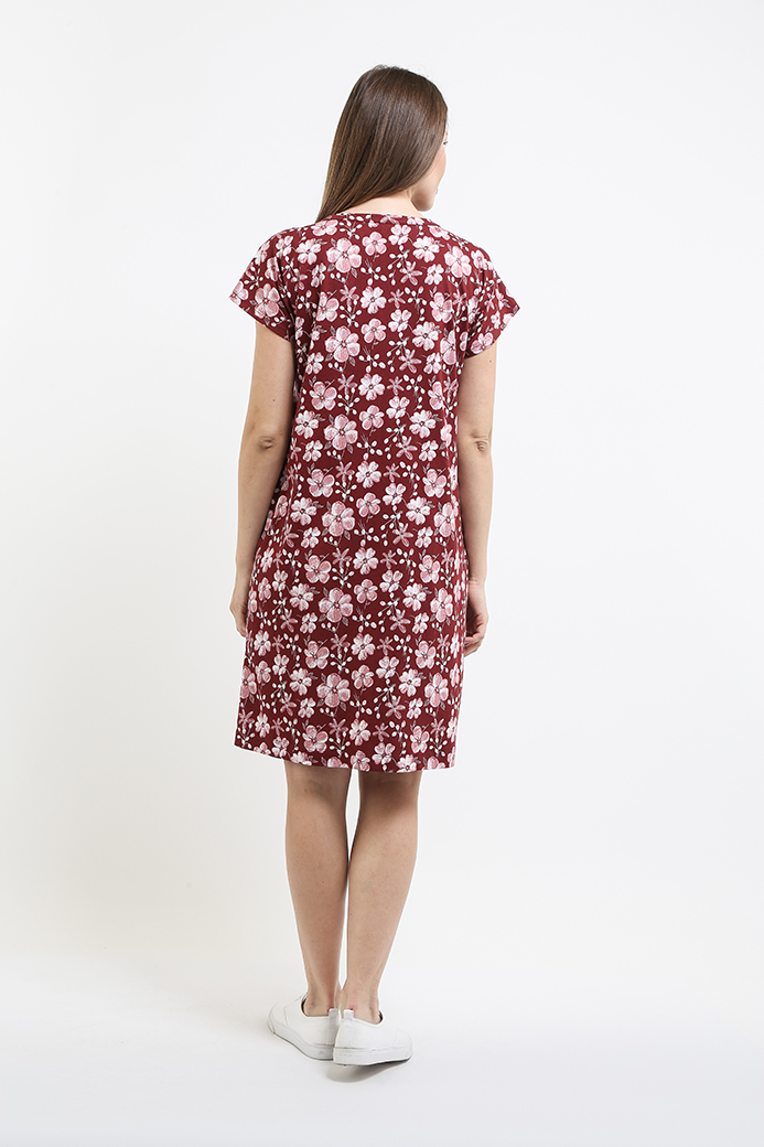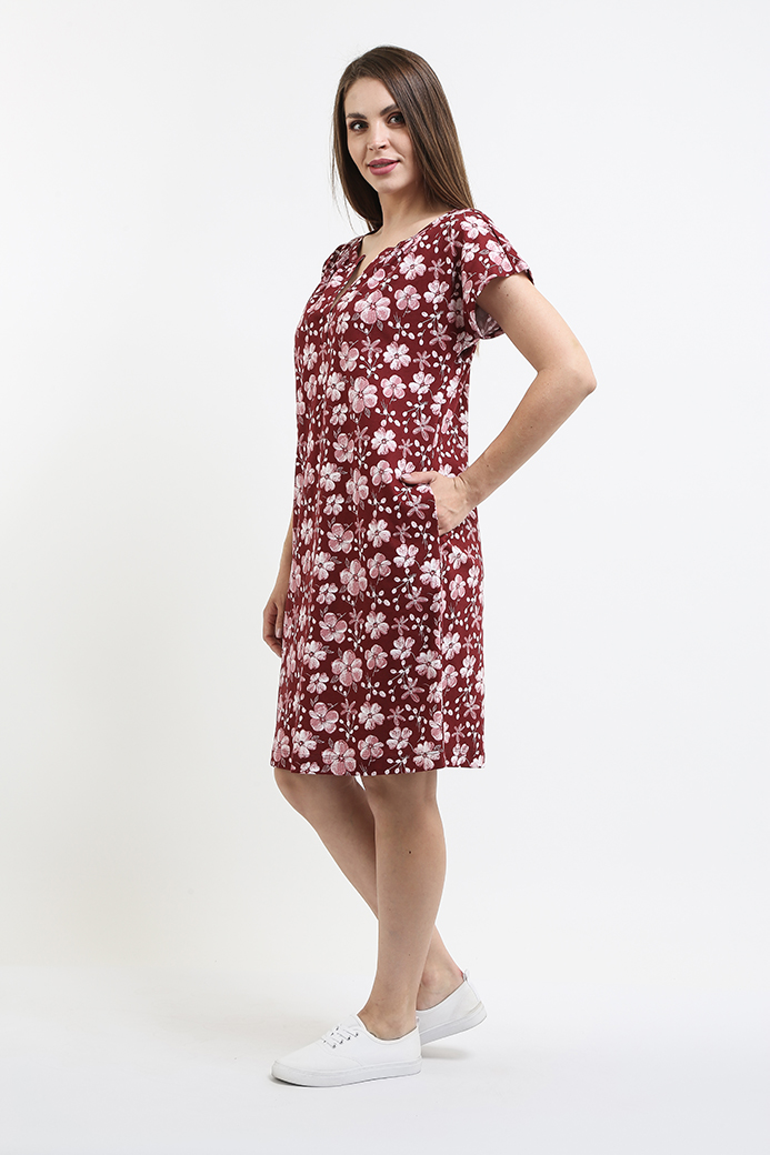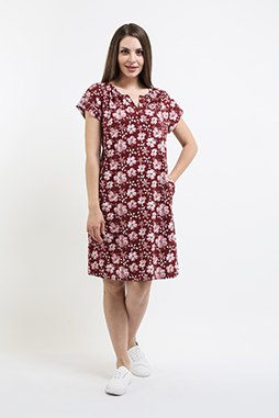 Туника из набивного трикотажа. Состав - хлопок 100%. Длина миди и прямой силуэт. Вырез горловины круглый. По переду планка. В боковых швах два внутренних кармана. Короткий рукав-кимоно.