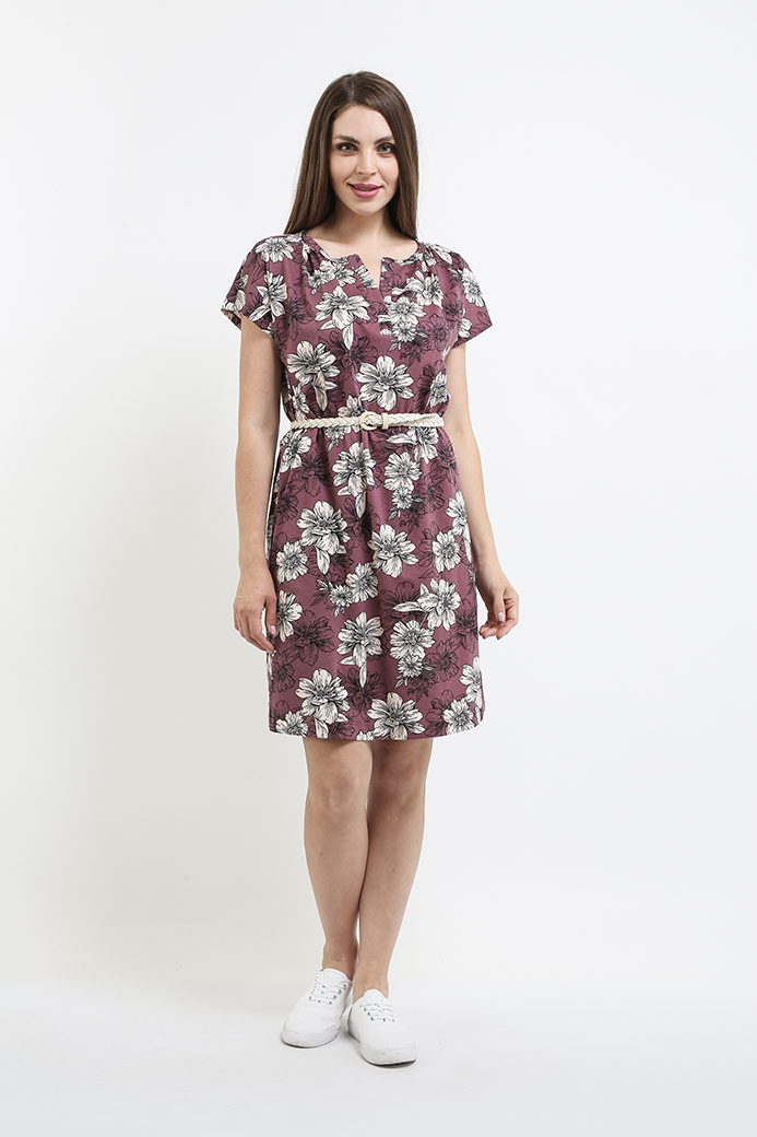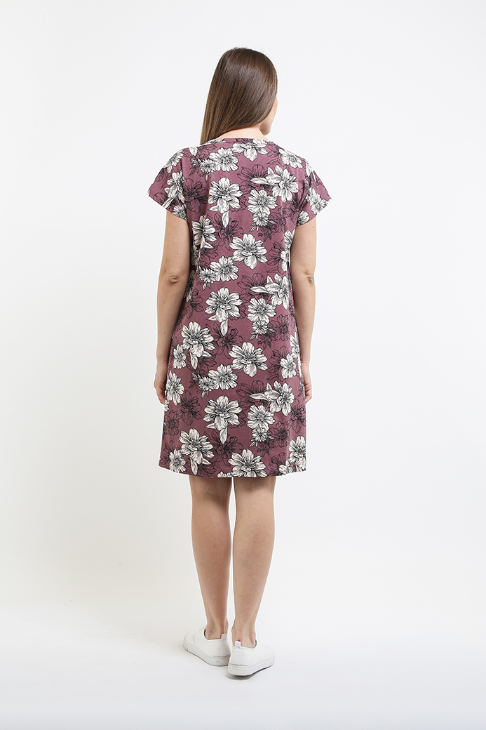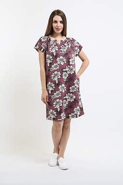 Туника из набивного трикотажа. Состав - хлопок 100%. Длина миди и прямой силуэт. Вырез горловины круглый. По переду планка. В боковых швах два внутренних кармана. Короткий рукав-кимоно.