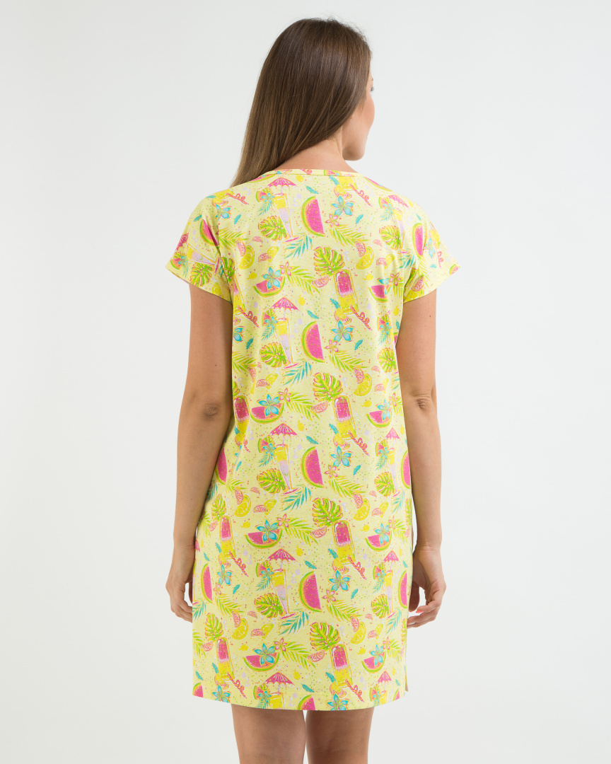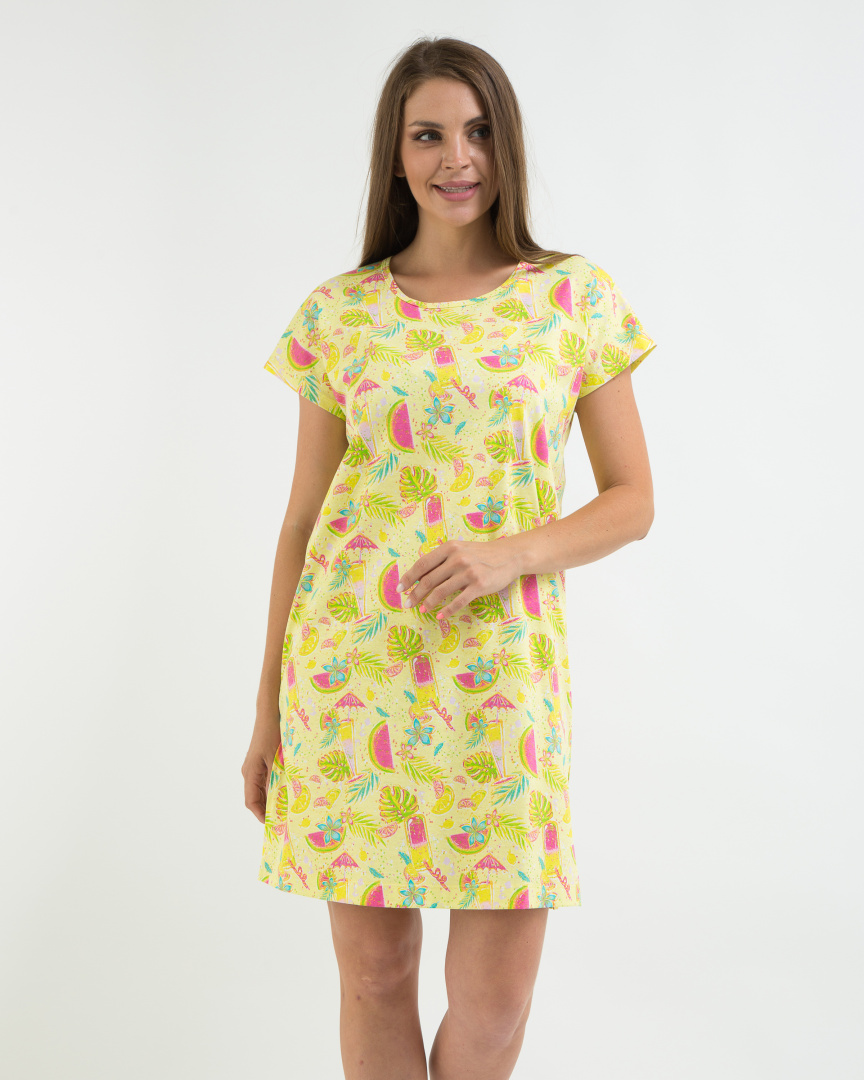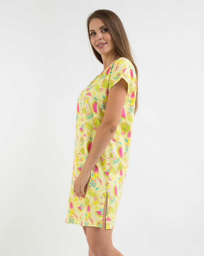 Туника из набивного трикотажа прямого силуэт. Вырез горловины круглый. Короткий рукав - кимоно. По бокам - разрезы.