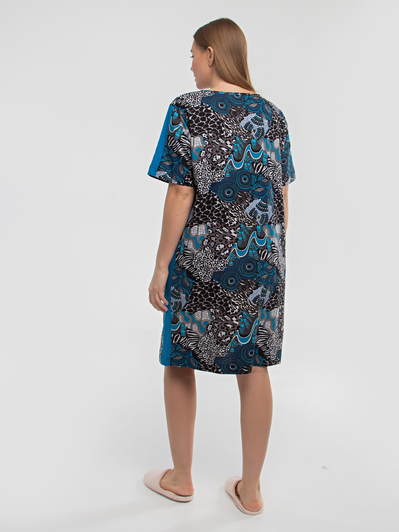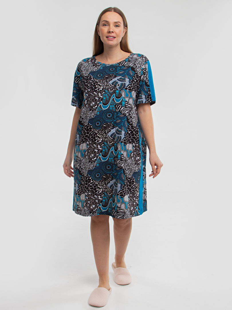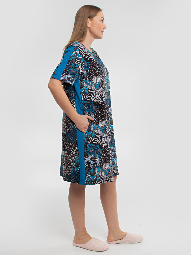 Платье из набивного трикотажа. Состав - хлопок 100 %. Модель средней длины прямого силуэта с втачным рукавом. Круглый вырез горловины. В боковых швах и на рукавах – контрастные лампасы. на переде – боковые карманы.