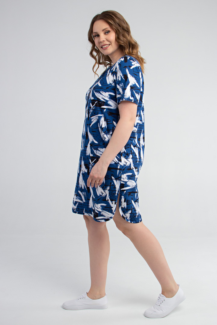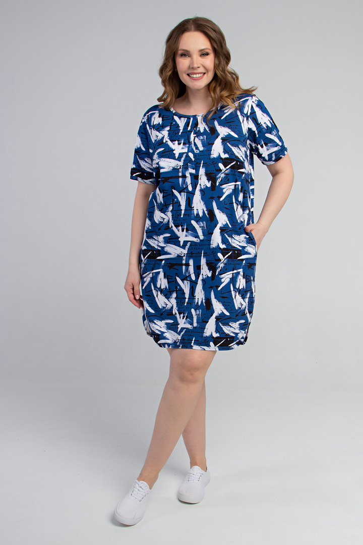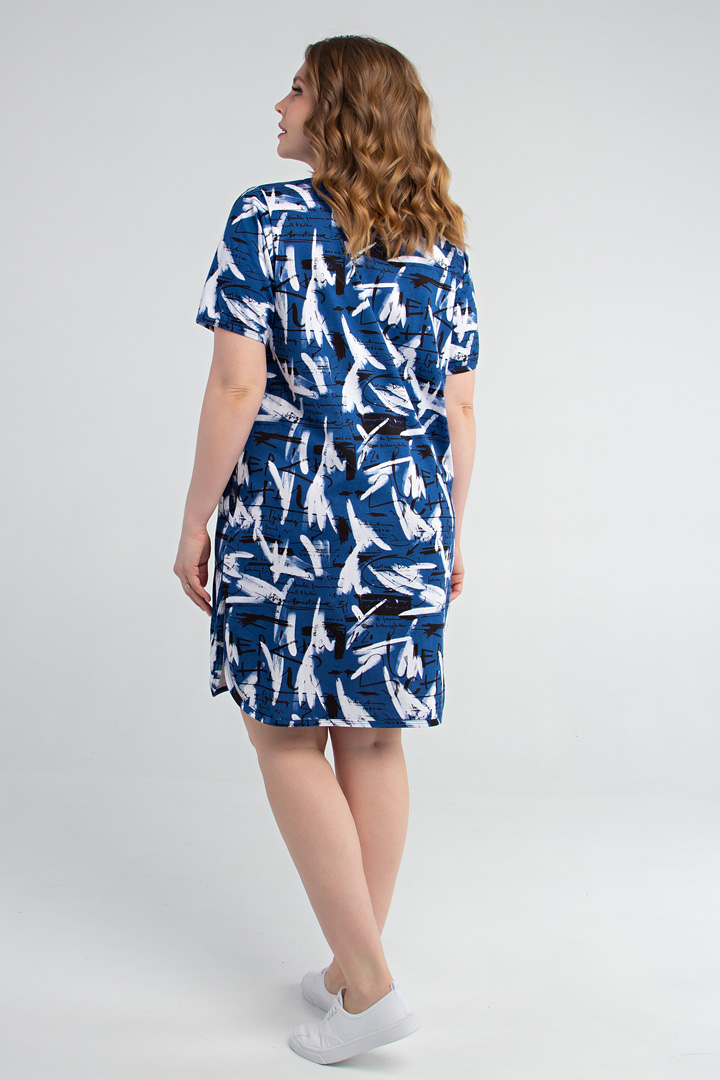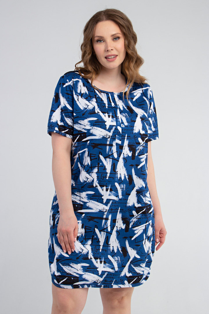 Платье из набивного трикотажа. Состав - хлопок 100%. Длина мини и прямой силуэт. Вырез горловины круглый. По переду планка с застёжкой на 4 кнопки и два кармана с отрезным бочком. Рукав короткий прямой. Линия низа туники закруглена по бокам и окантована.