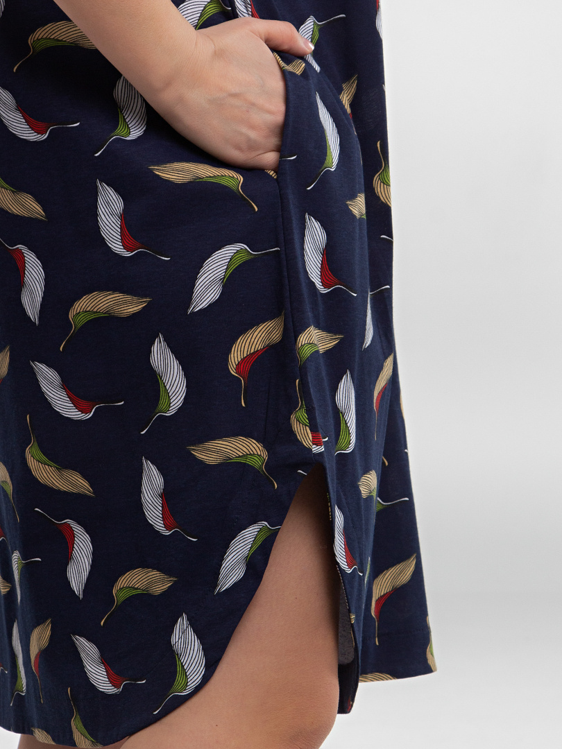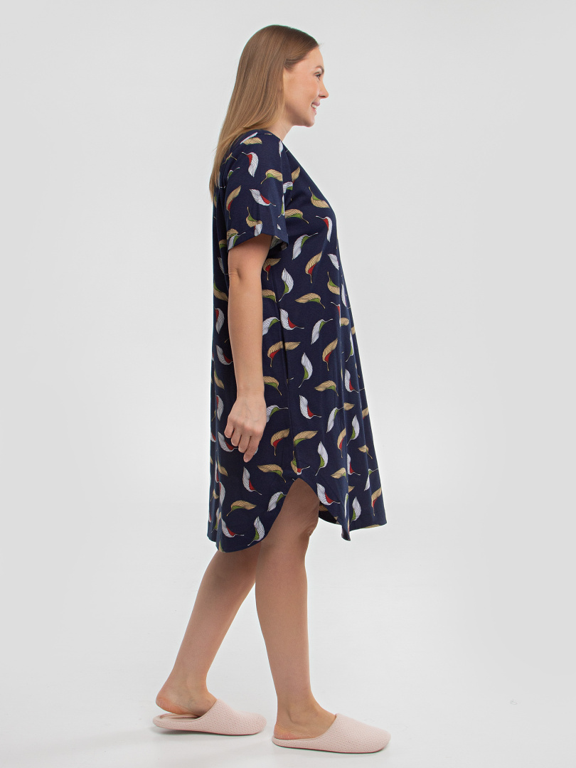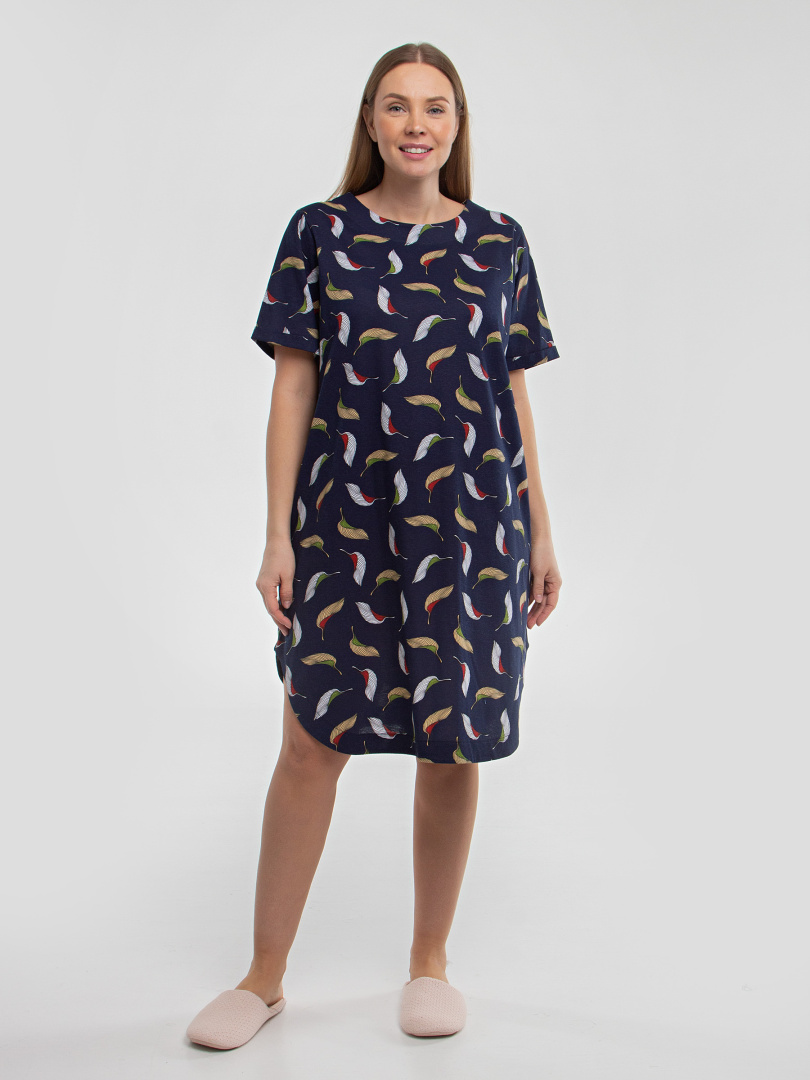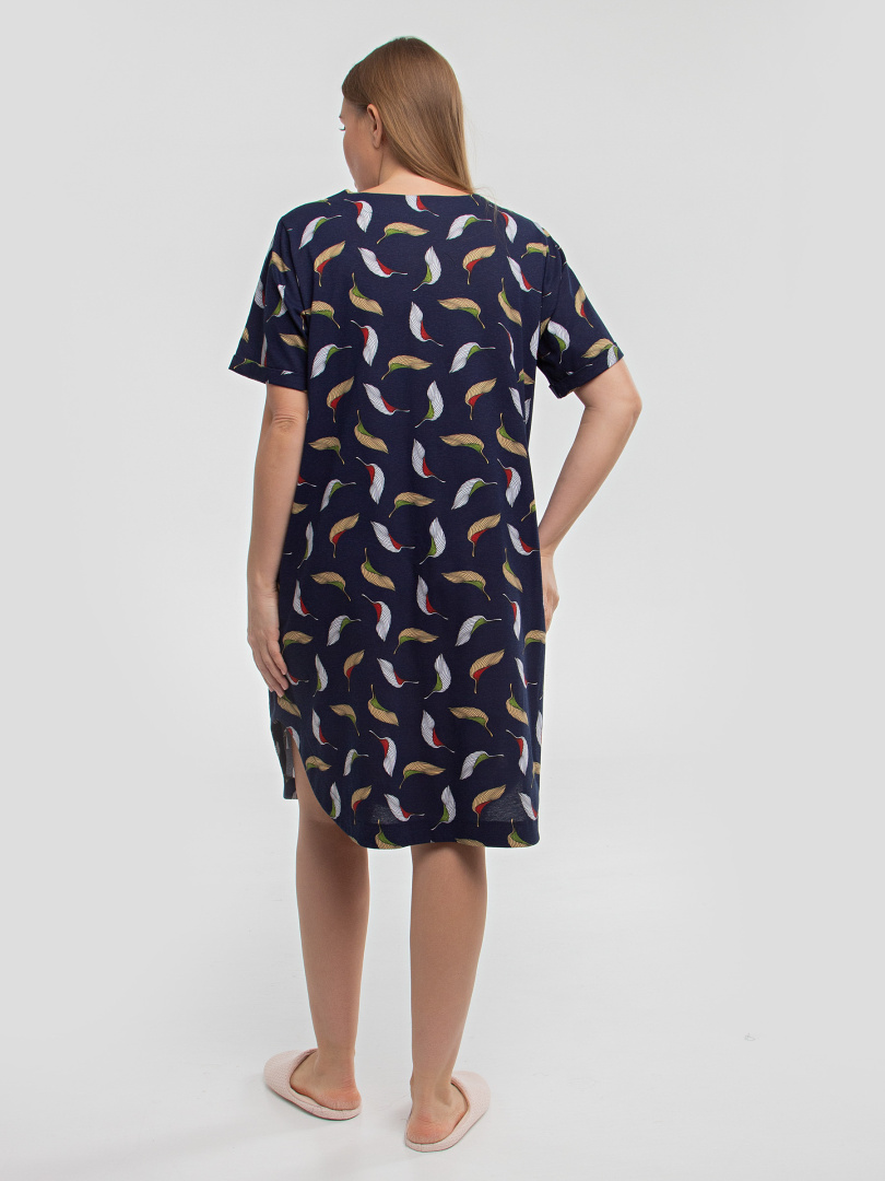Платье из набивного трикотажа. Состав - хлопок 100%. Длина изделия миди и прямой силуэт. Вырез горловины круглый. Платье имеет втачной короткий рукав c отворотами по низу. Особенность модели - фигурная линия низа.
