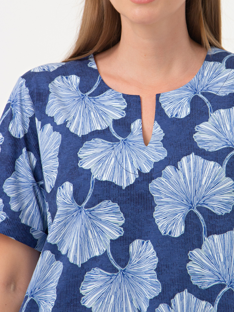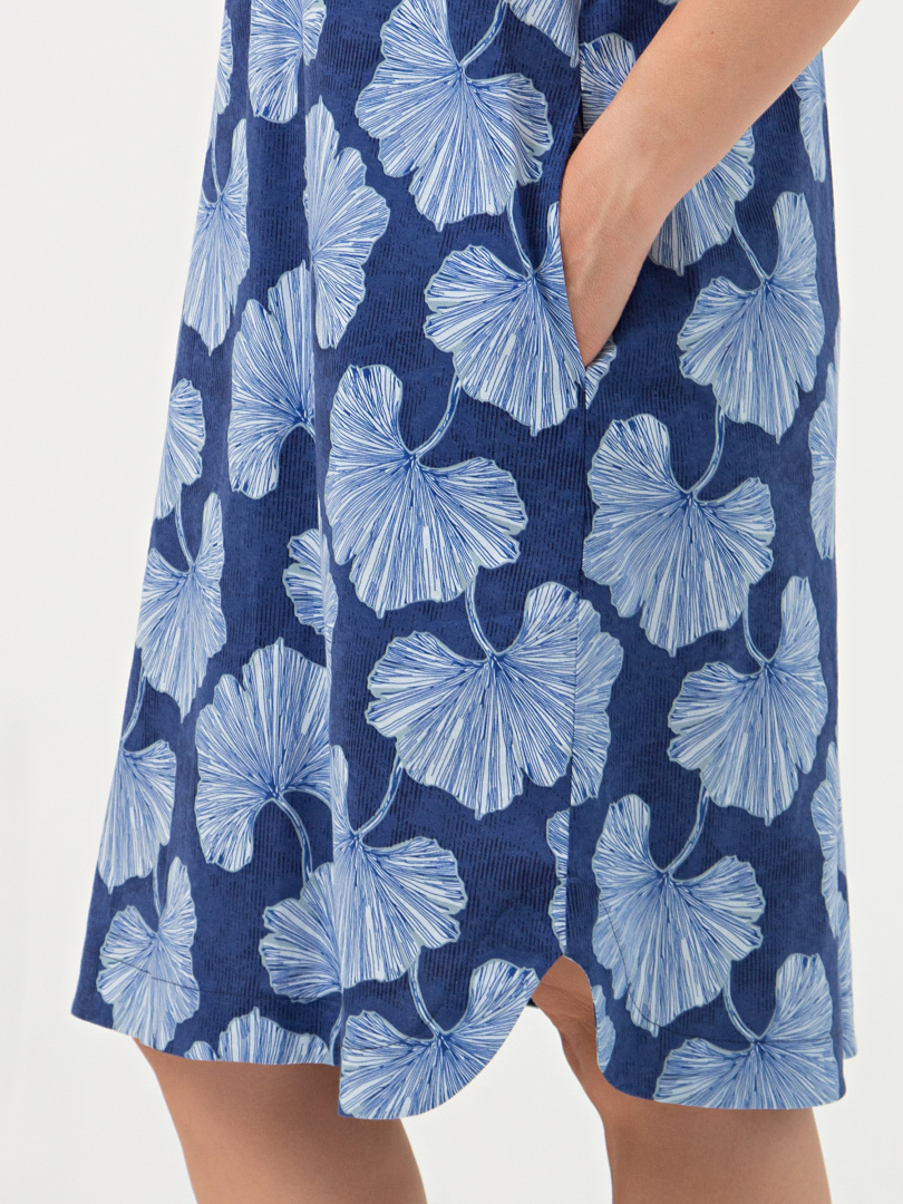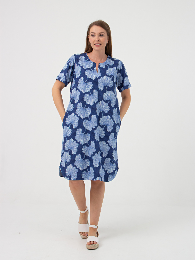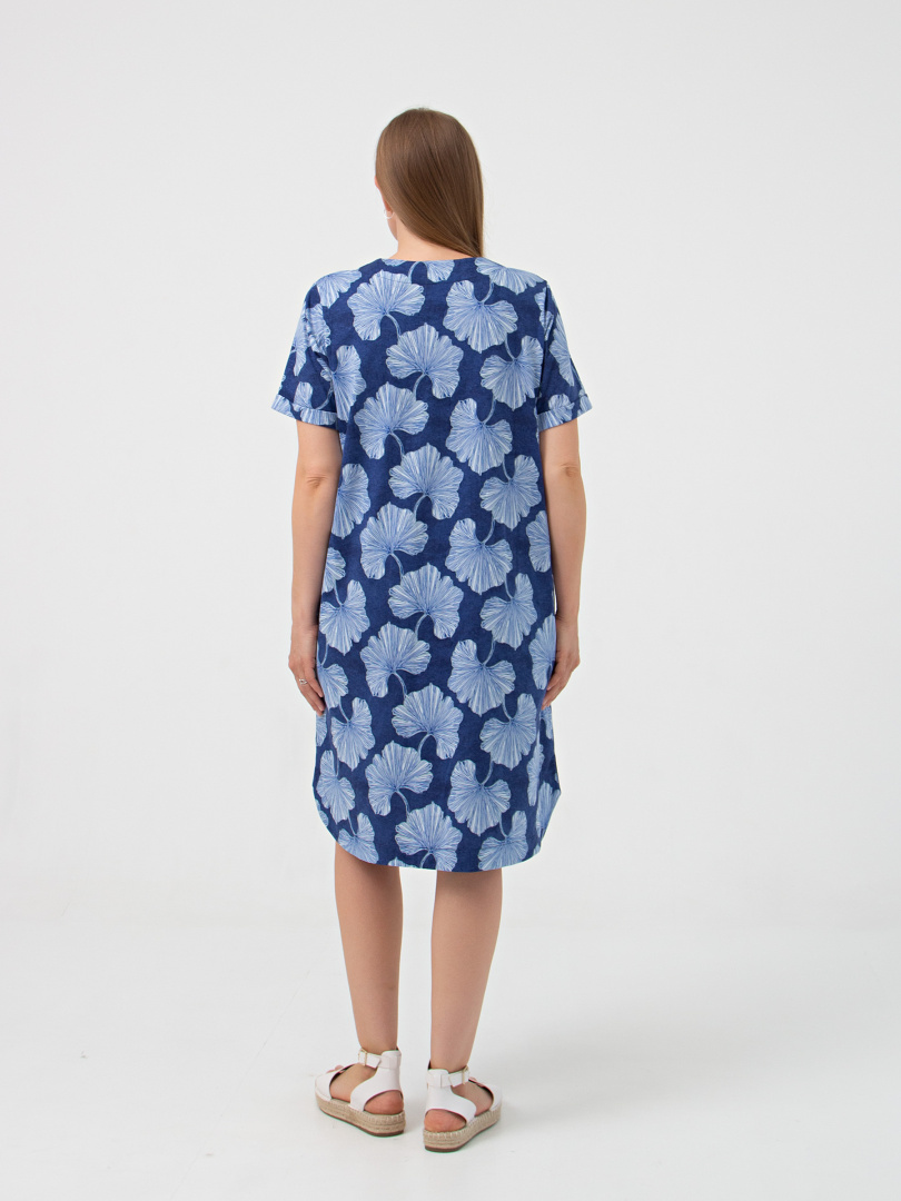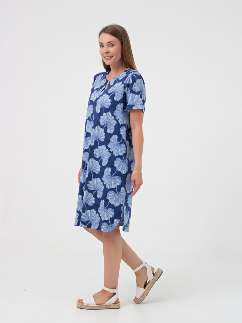 Платье из набивного трикотажа. Состав - хлопок 100%.  Длина изделия миди  и прямой силуэт. Вырез горловины круглый со щелью. Платье имеет втачной короткий рукав c отворотами по низу.  В боковых швах – внутренние карманы. Особенность модели - фигурная линия низа.