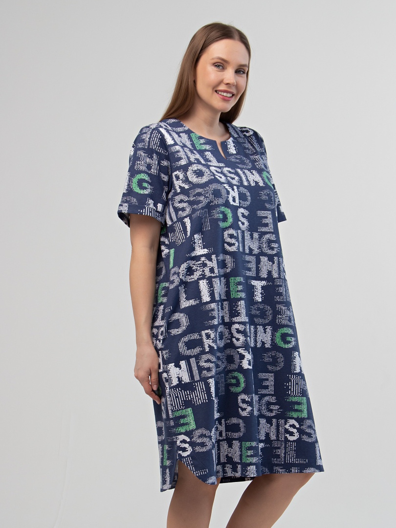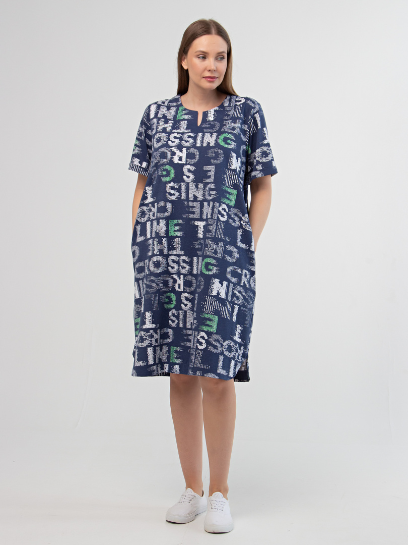 Платье из набивного трикотажа. Состав - хлопок 100%. Длина изделия миди и прямой силуэт. Вырез горловины круглый со щелью. Платье имеет втачной короткий рукав c отворотами по низу. В боковых швах – внутренние карманы. Особенность модели - фигурная линия низа.