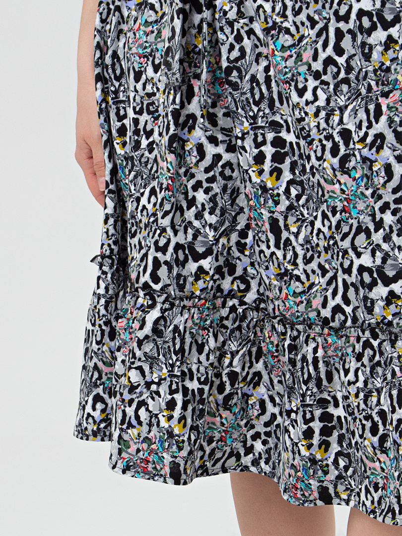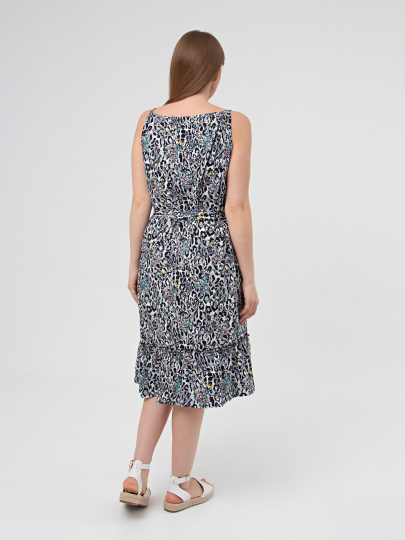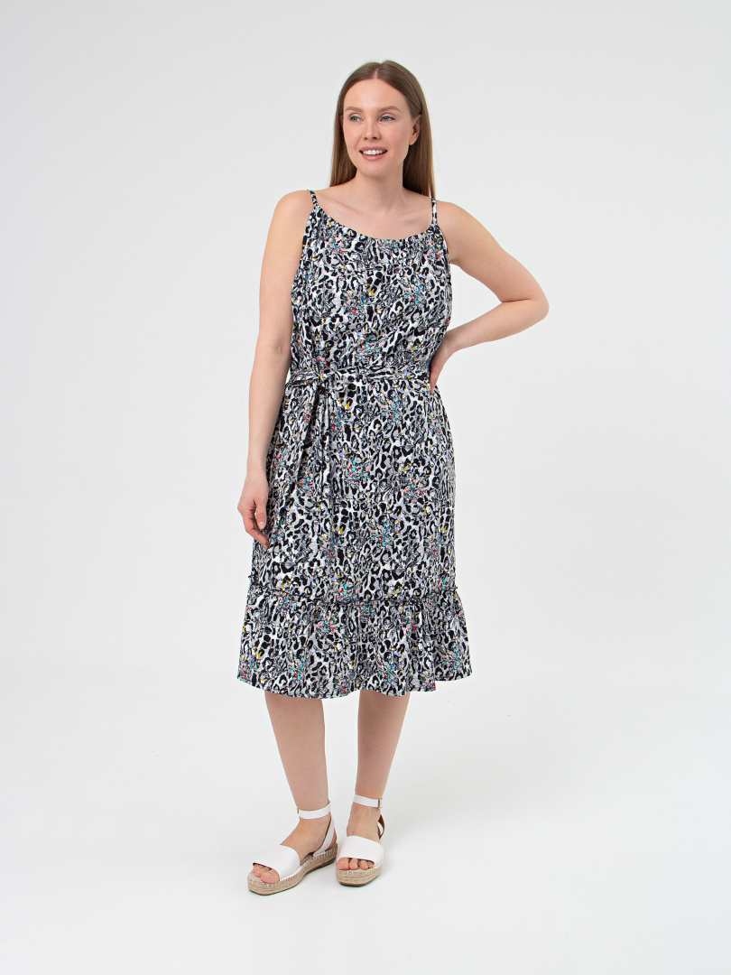 Трикотажный хлопковый сарафан свободного А-образного силуэта. Длина изделия – миди. Модель расклешена книзу. Круглая горловина, стянутая бретелями. По низу – оборка.