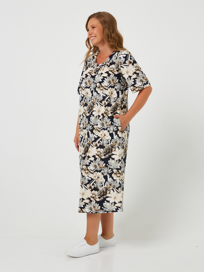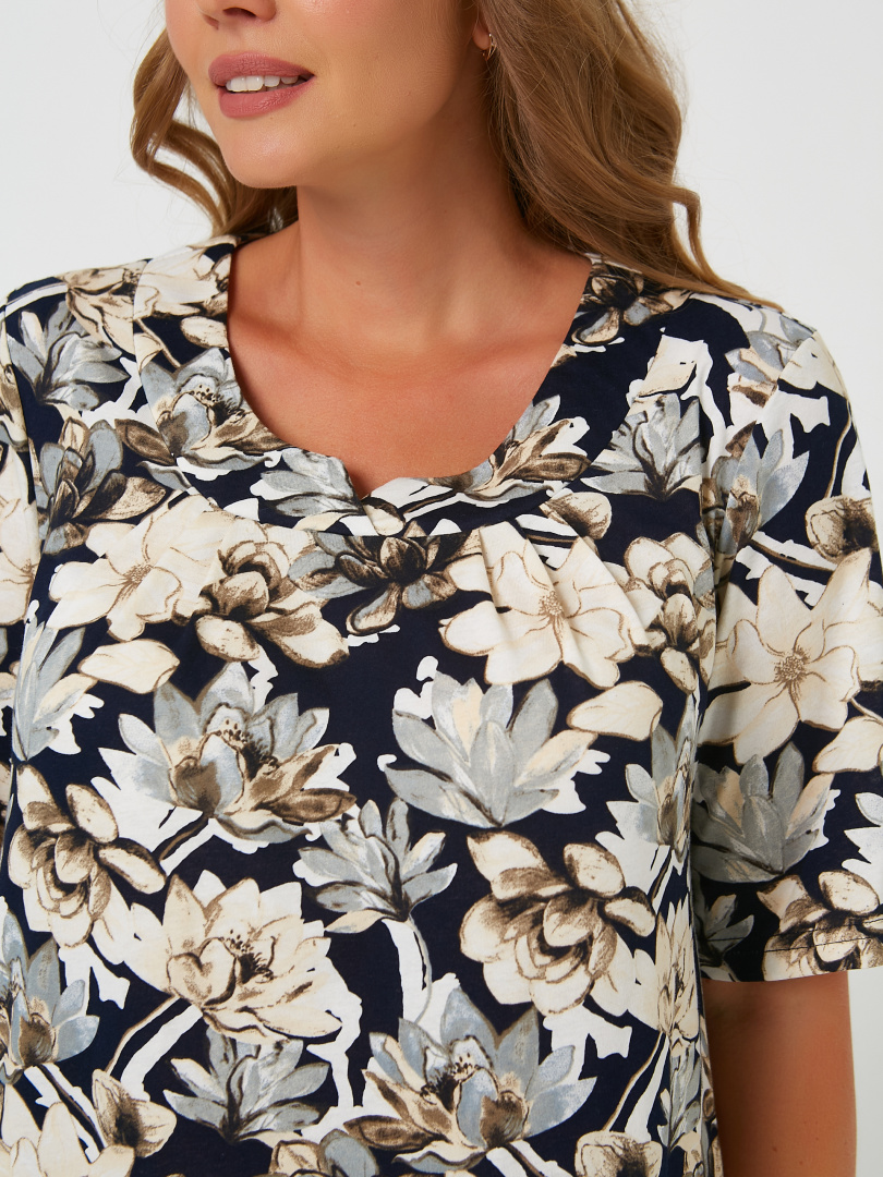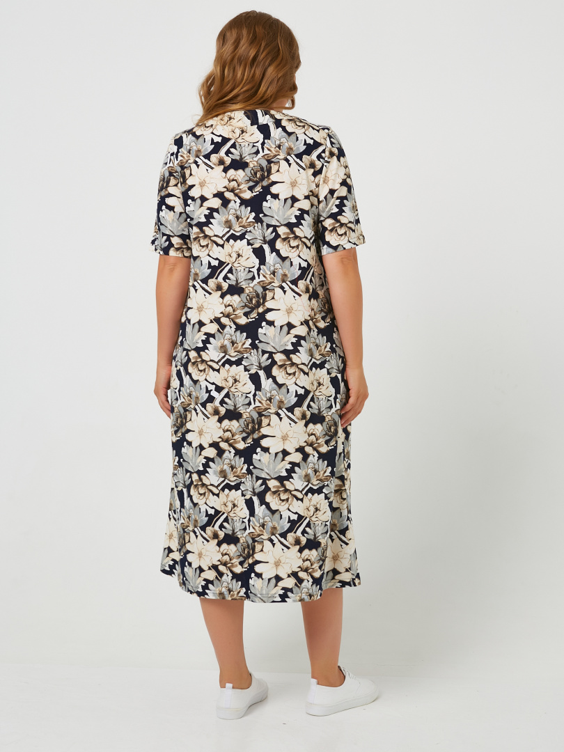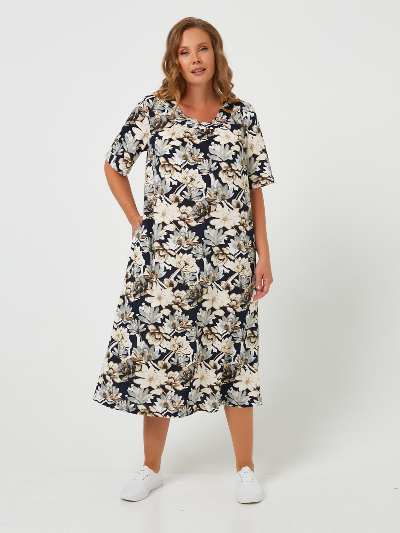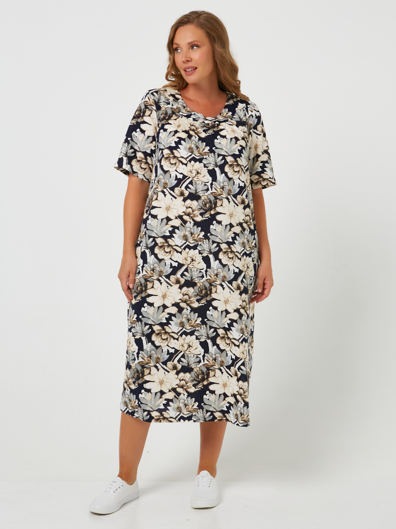 Женское хлопковое трикотажное платье свободного покроя. Длина – до середины икры. Изделие с коротким втачным рукавом. Горловина декорирована фигурной кокеткой. По низу кокетки переда заложены мягкие защипы. В боковых швах модель имеет внутренние карманы.