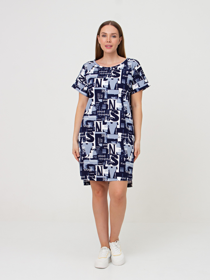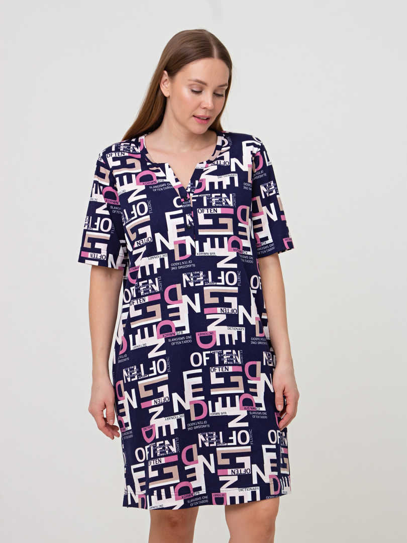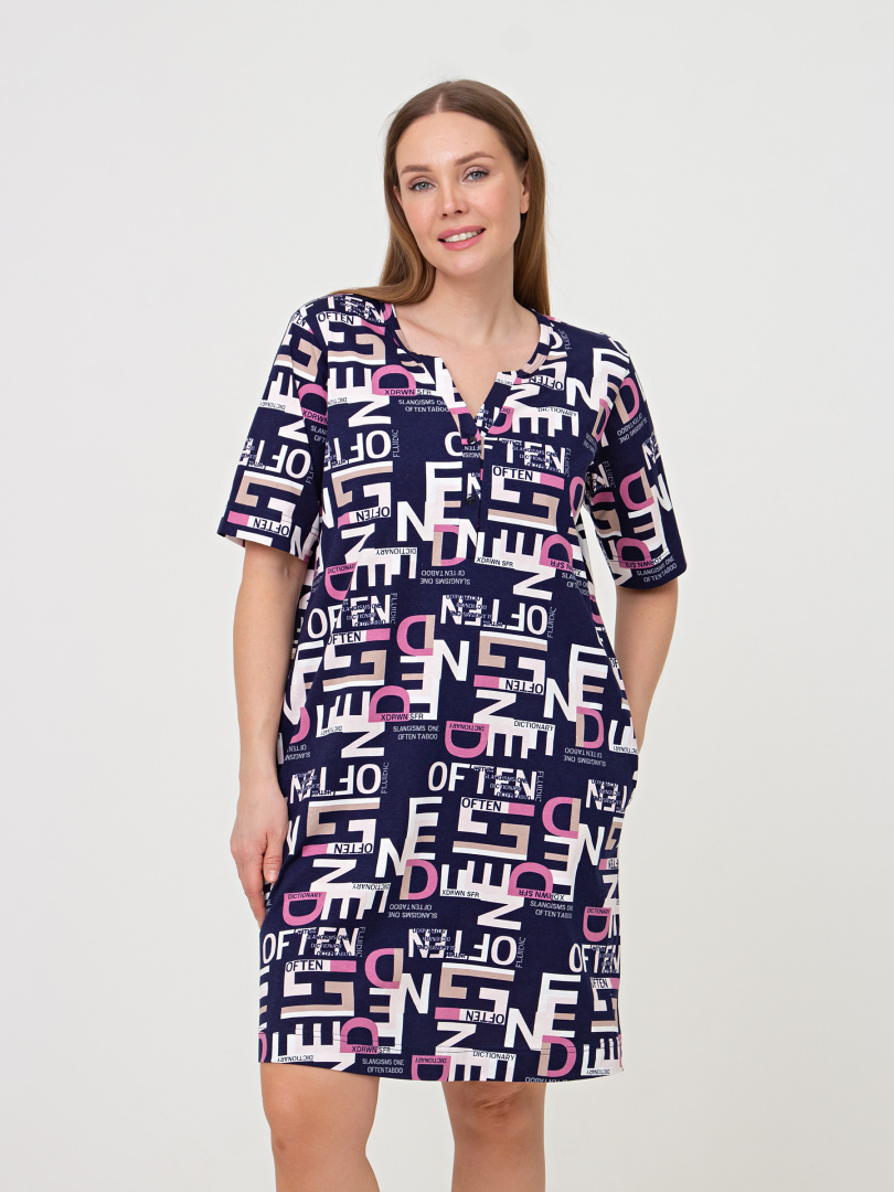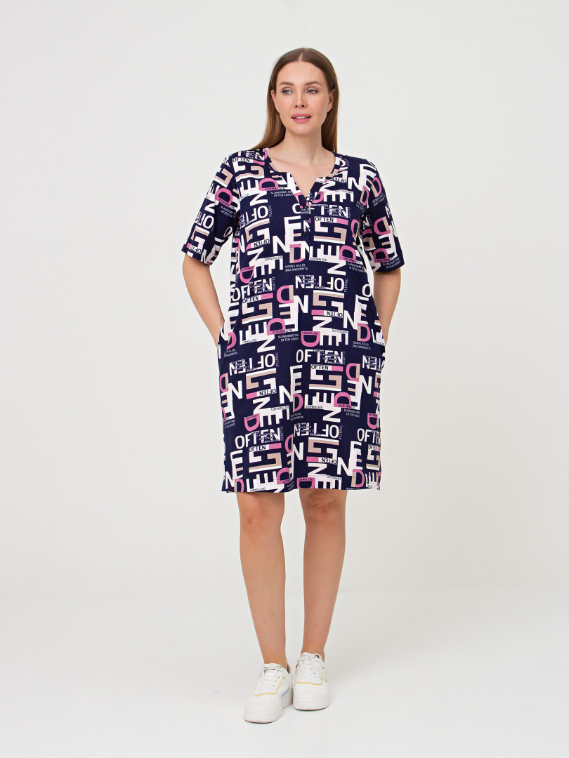 Платье из набивного трикотажа. Длина миди и прямой силуэт. Вырез горловины круглый. По переду изделия - фигурная планка с застёжкой на 2 пуговицы и карманы в боковых швах. Рукав короткий прямой. По боковым швам – разрезы.