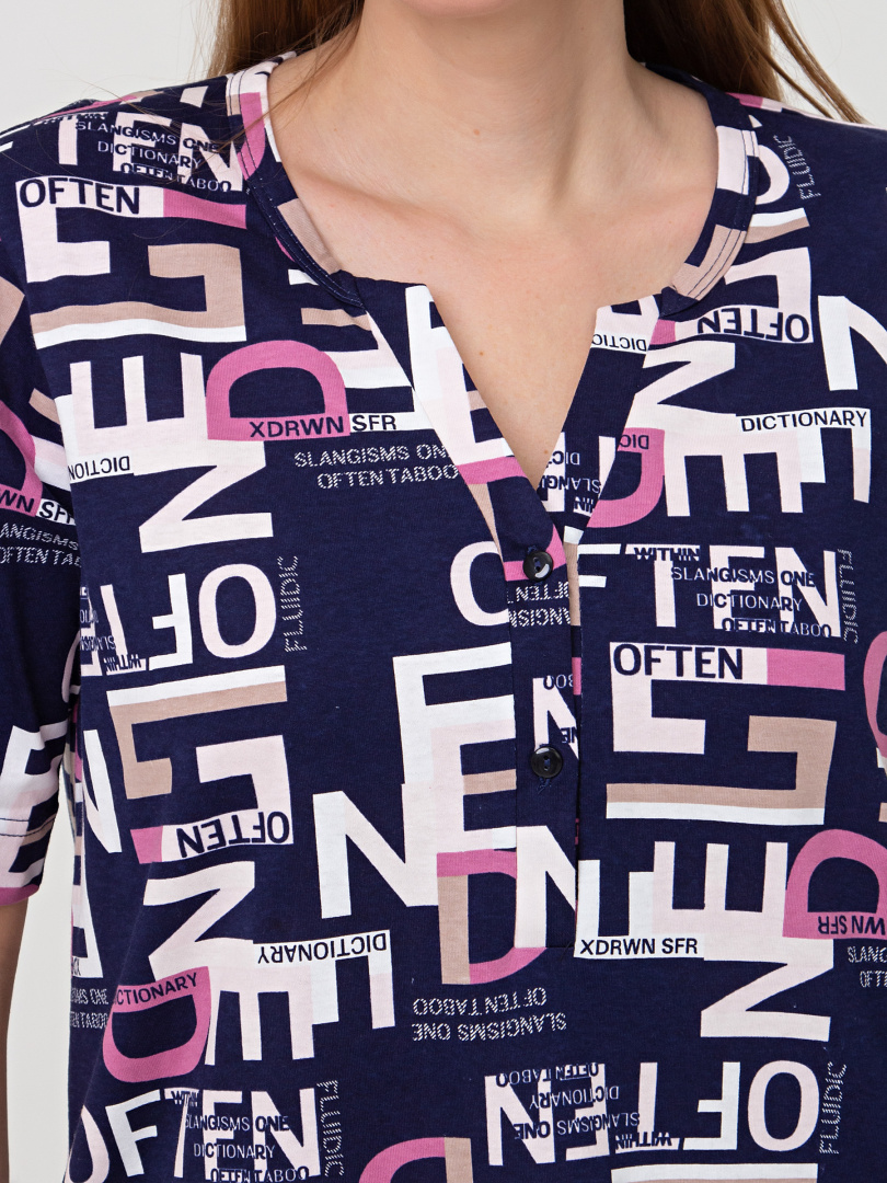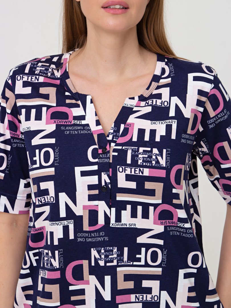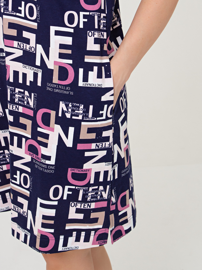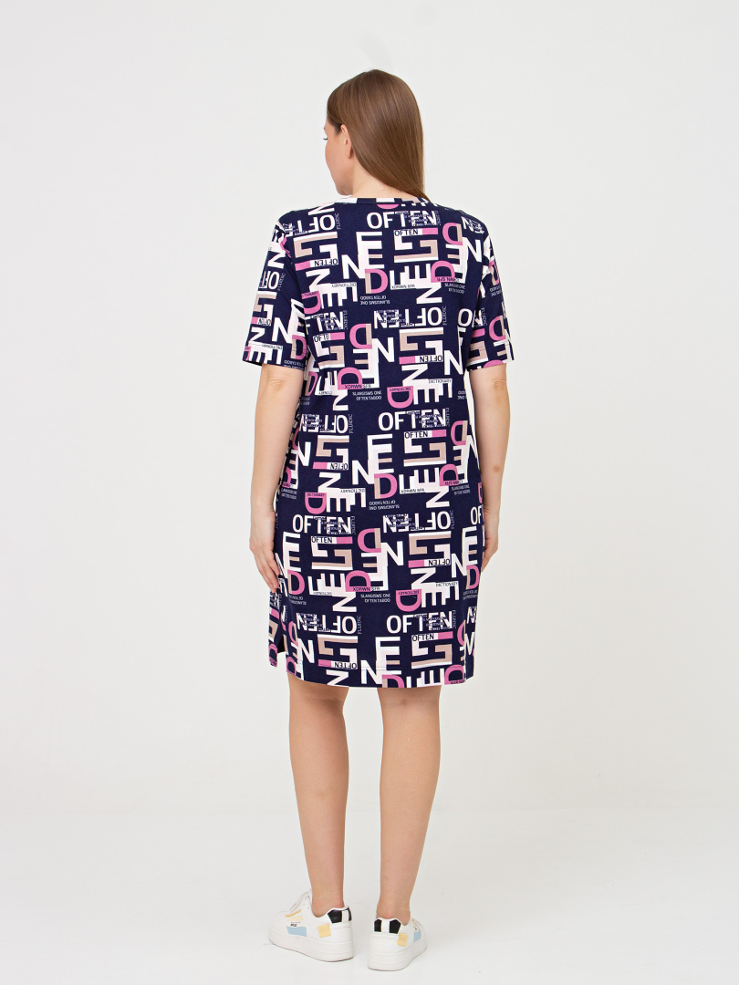 Платье из набивного трикотажа. Длина миди и прямой силуэт. Вырез горловины круглый. По переду изделия - фигурная планка с застёжкой на 2 пуговицы и карманы в боковых швах. Рукав короткий прямой. По боковым швам – разрезы.