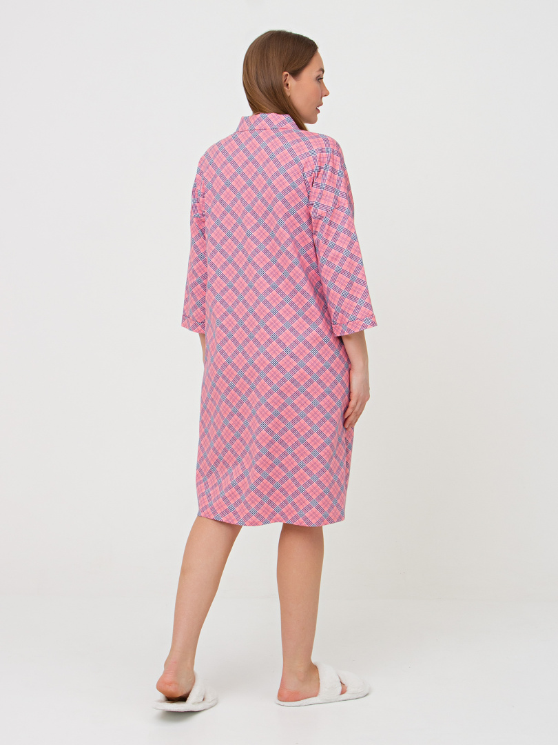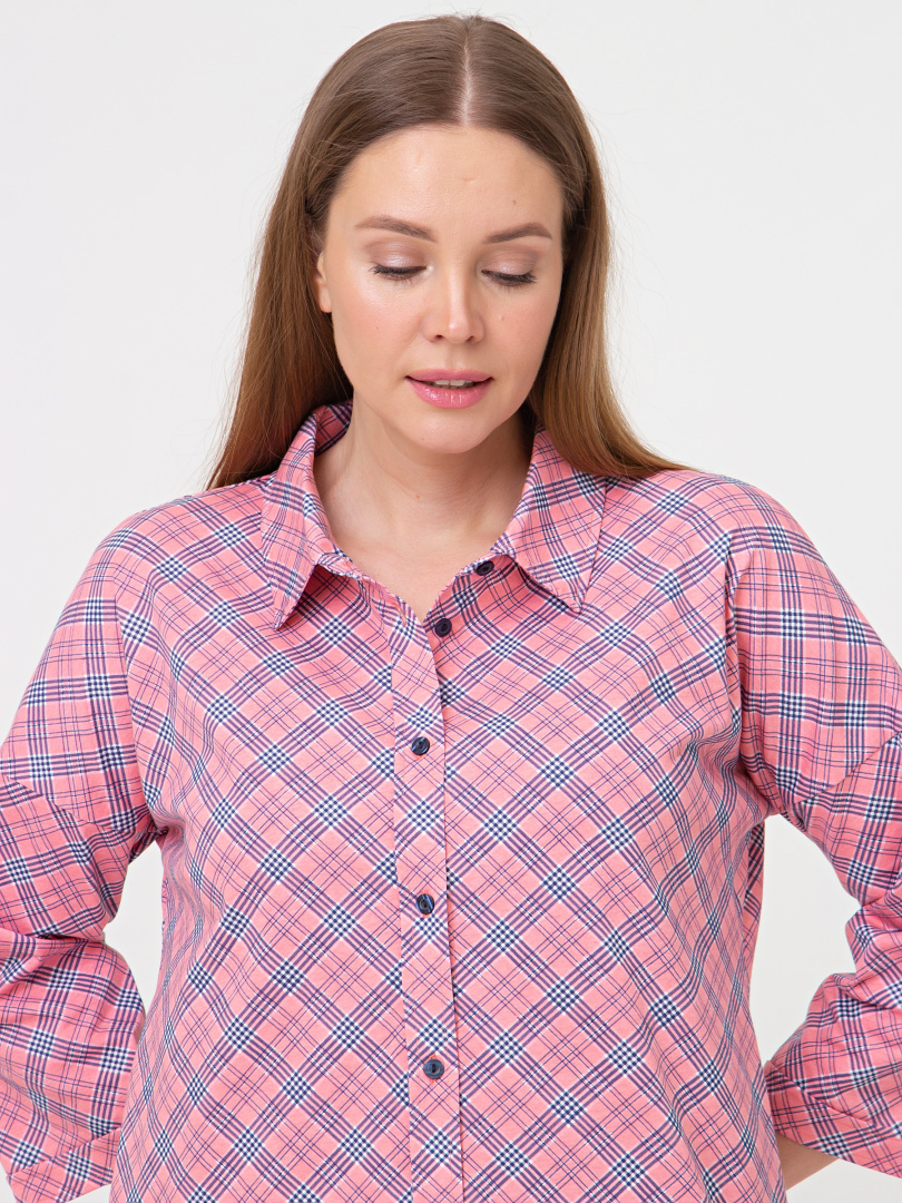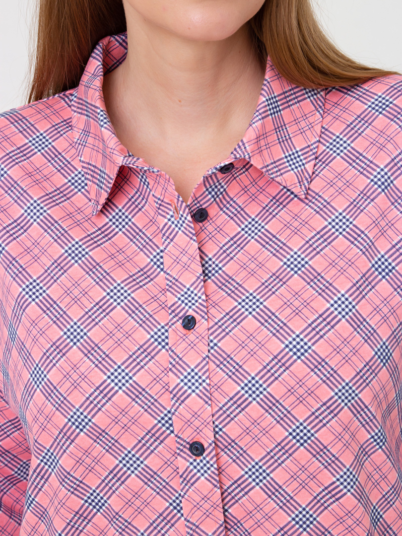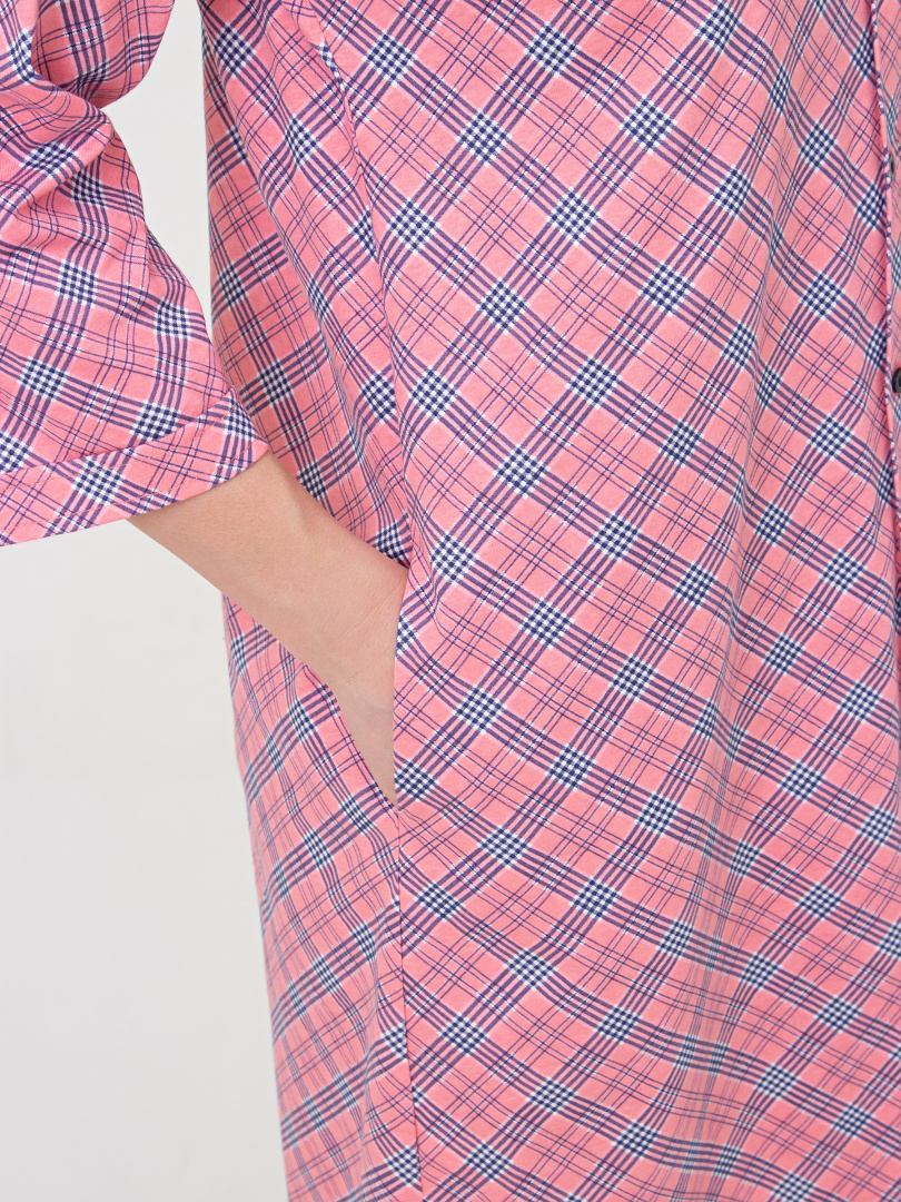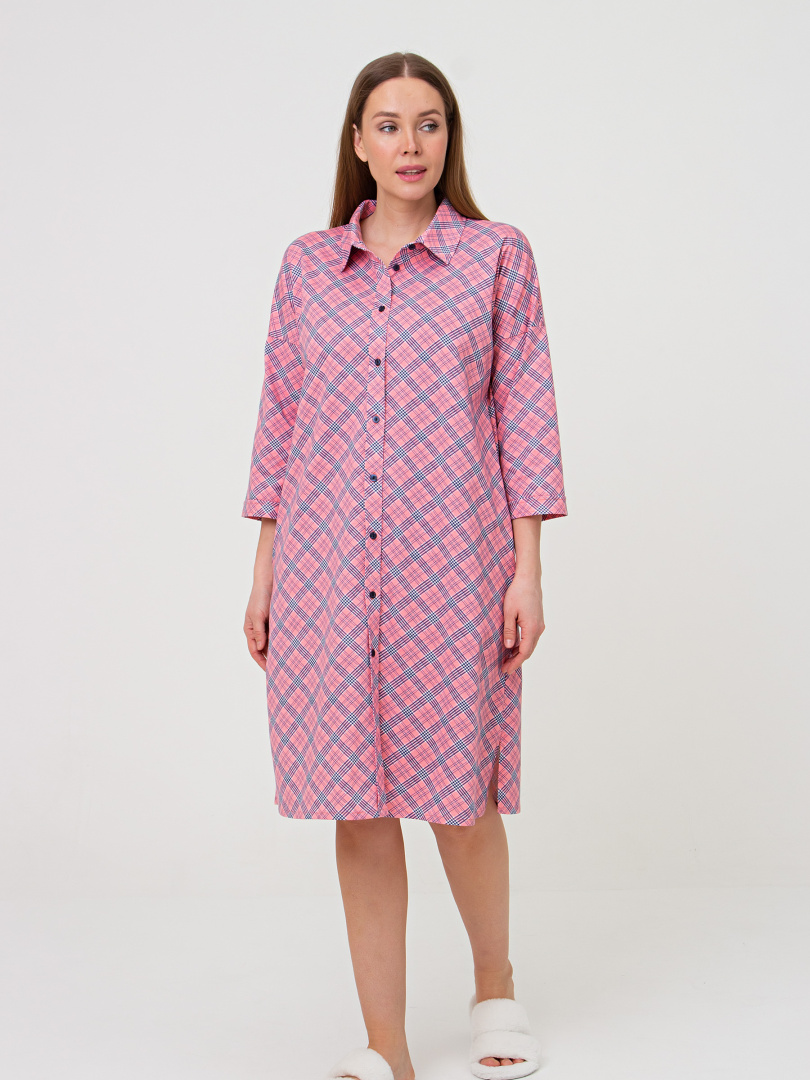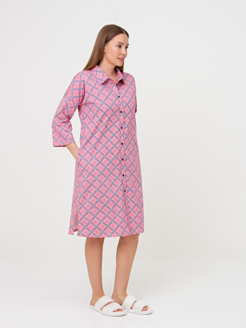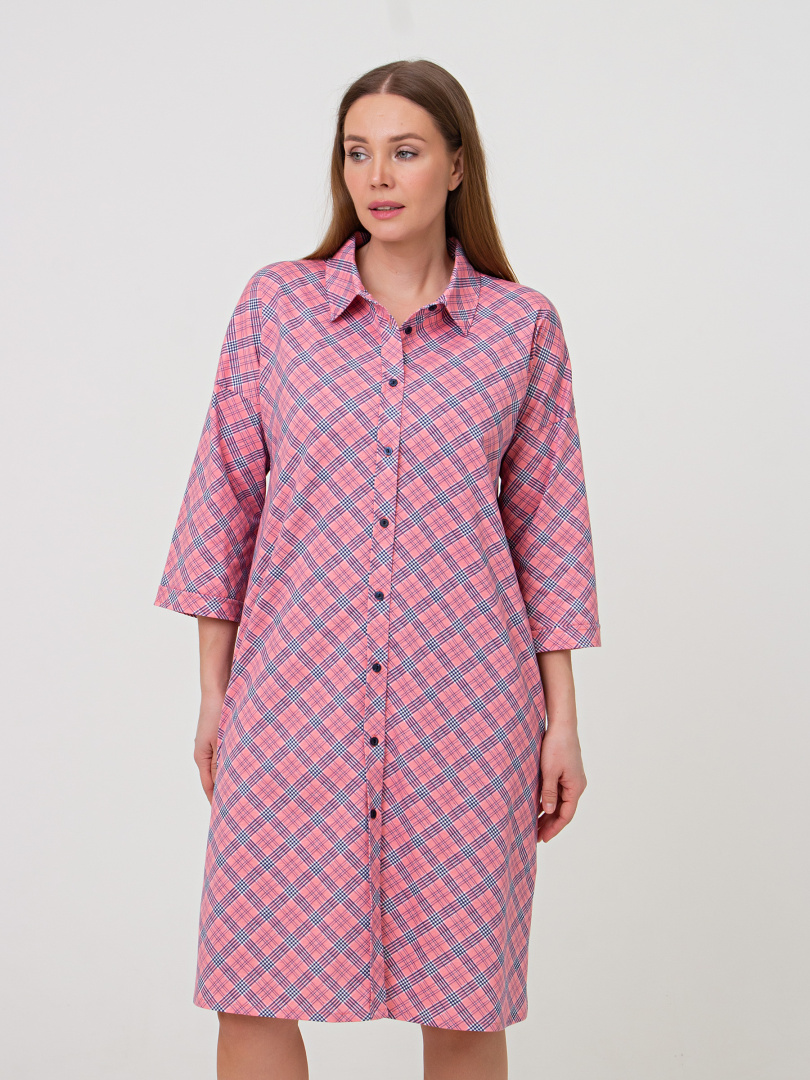 Женское трикотажное платье-рубашка свободного покроя со спущенным рукавом. У модели -боковые разрезы. Платье имеет боковые карманы в швах и застежку-планку на пуговицы. Воротник сорочечный отложной на стойке. Рукава 3/4 с имитацией отложных манжет по низу.