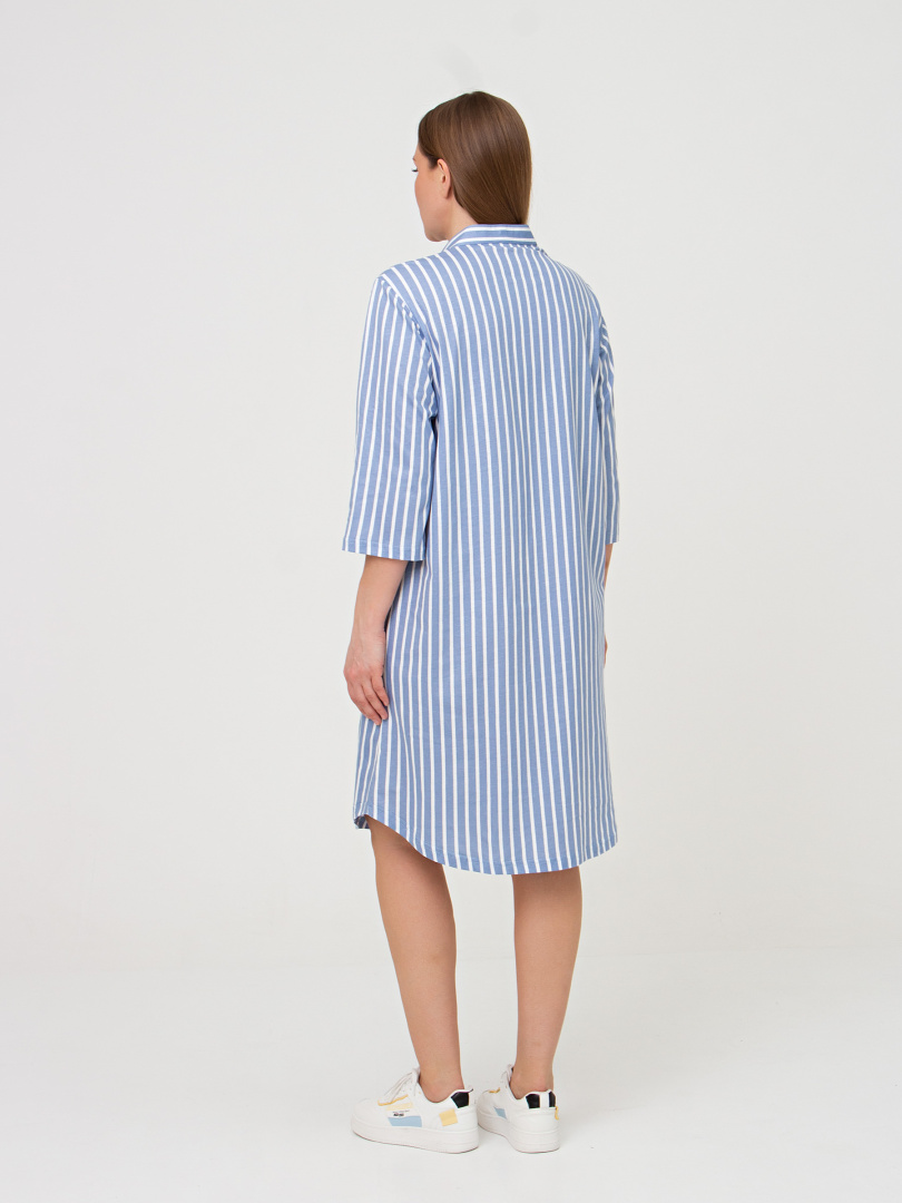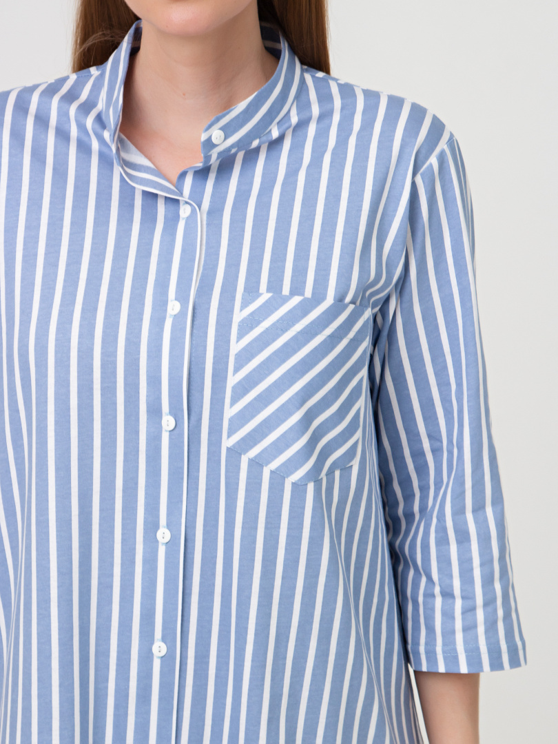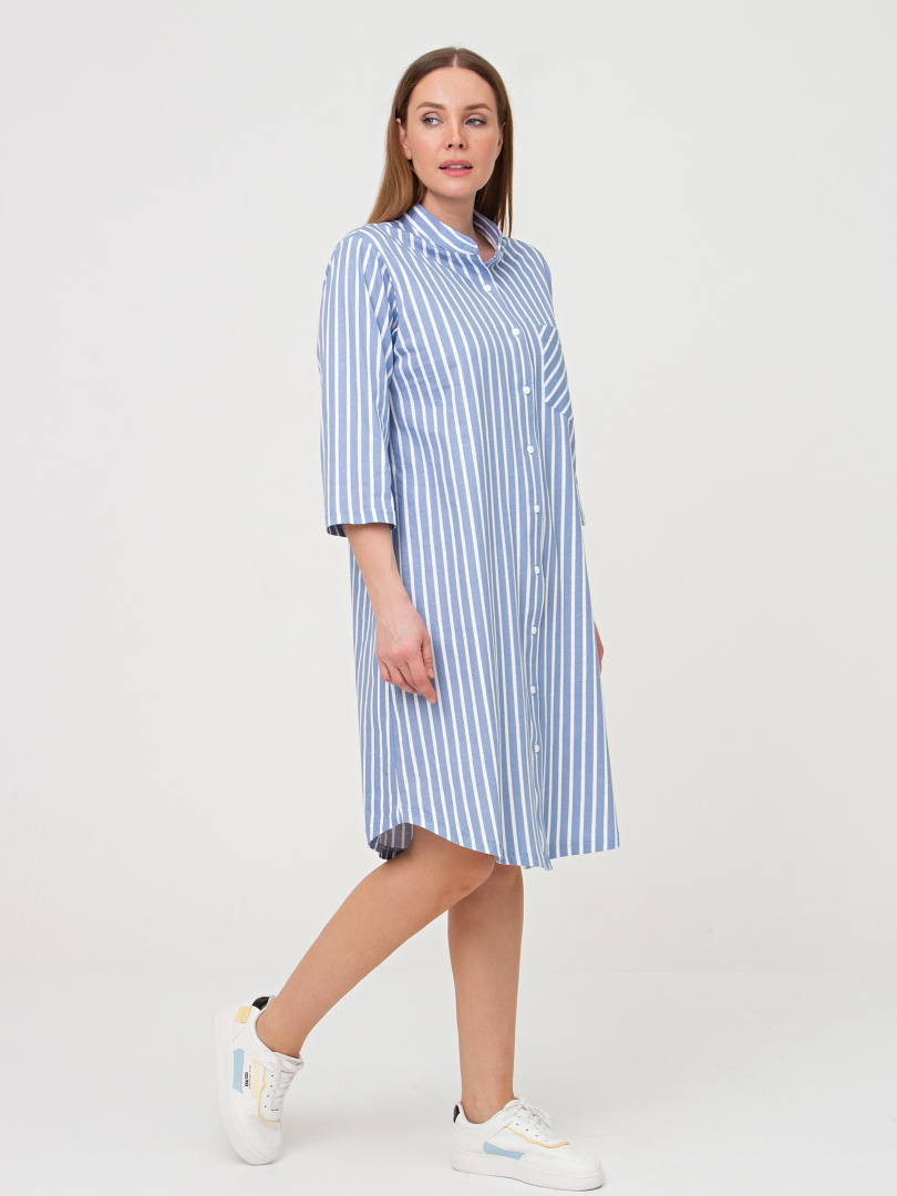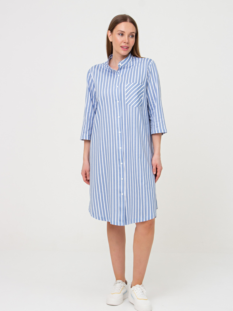 Женское трикотажное платье-рубашка свободного покроя с втачным рукавом. На левой части платья – накладной карман. Воротник - стойка. Рукав 3/4. Фигурная линия низа. Длина – миди.