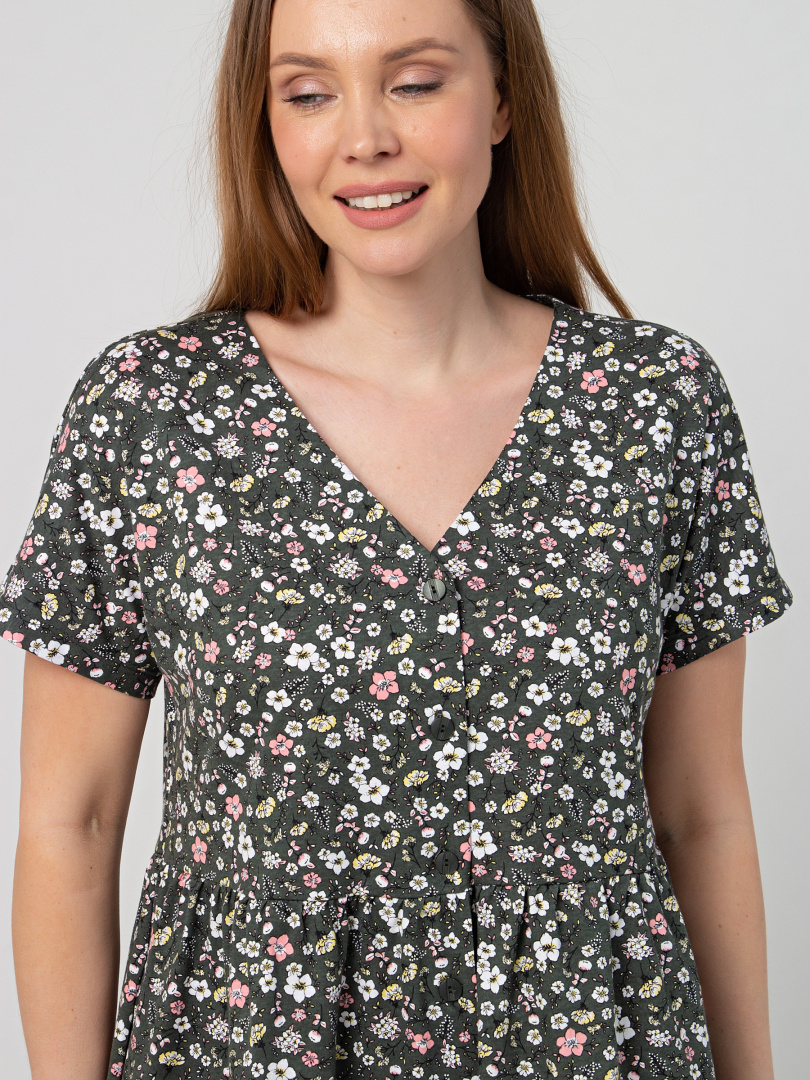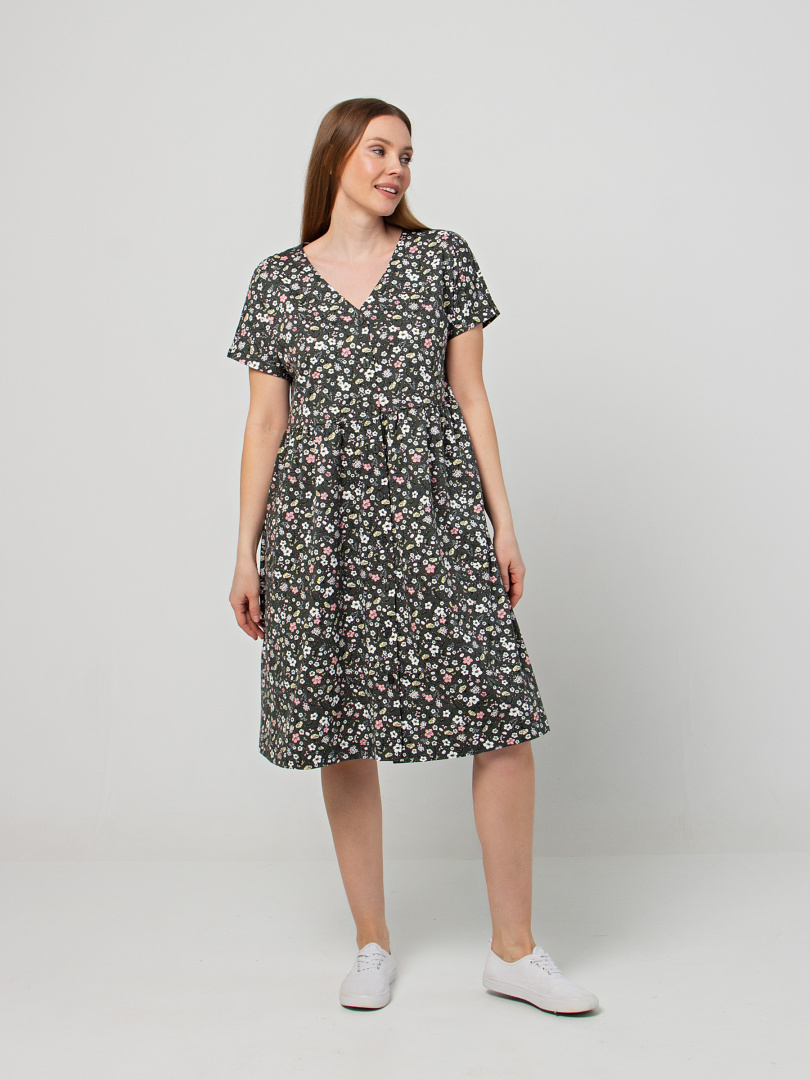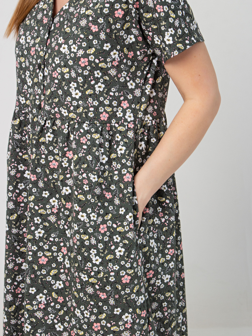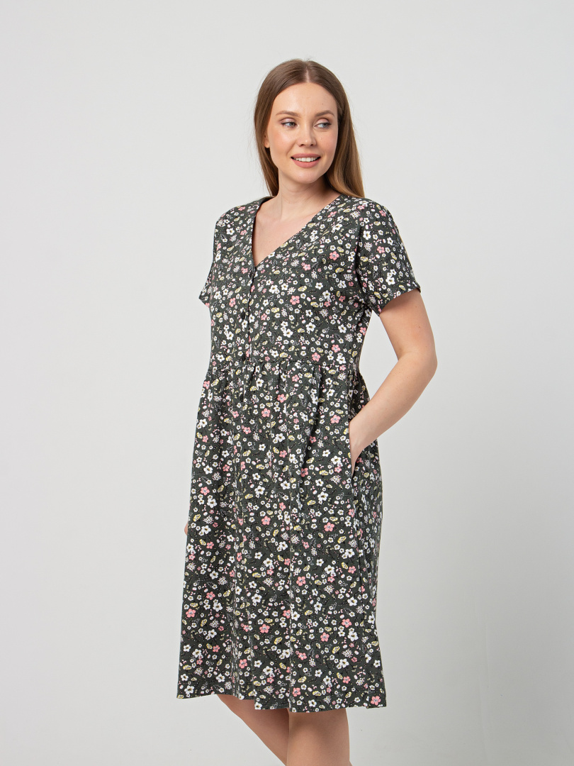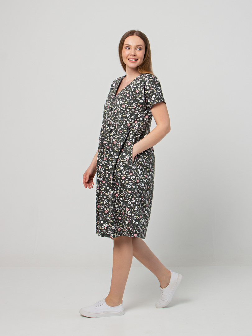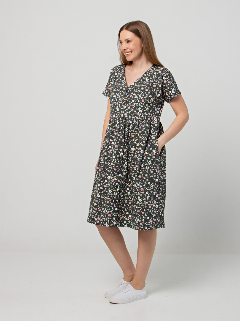 Платье свободного силуэта средней длины, отрезное чуть выше линии талии. Изделие имеет V-образную горловину и застежку на пуговицы до низа. Юбка с боковыми карманами. Платье с коротким спущенным цельнокроеным рукавом.