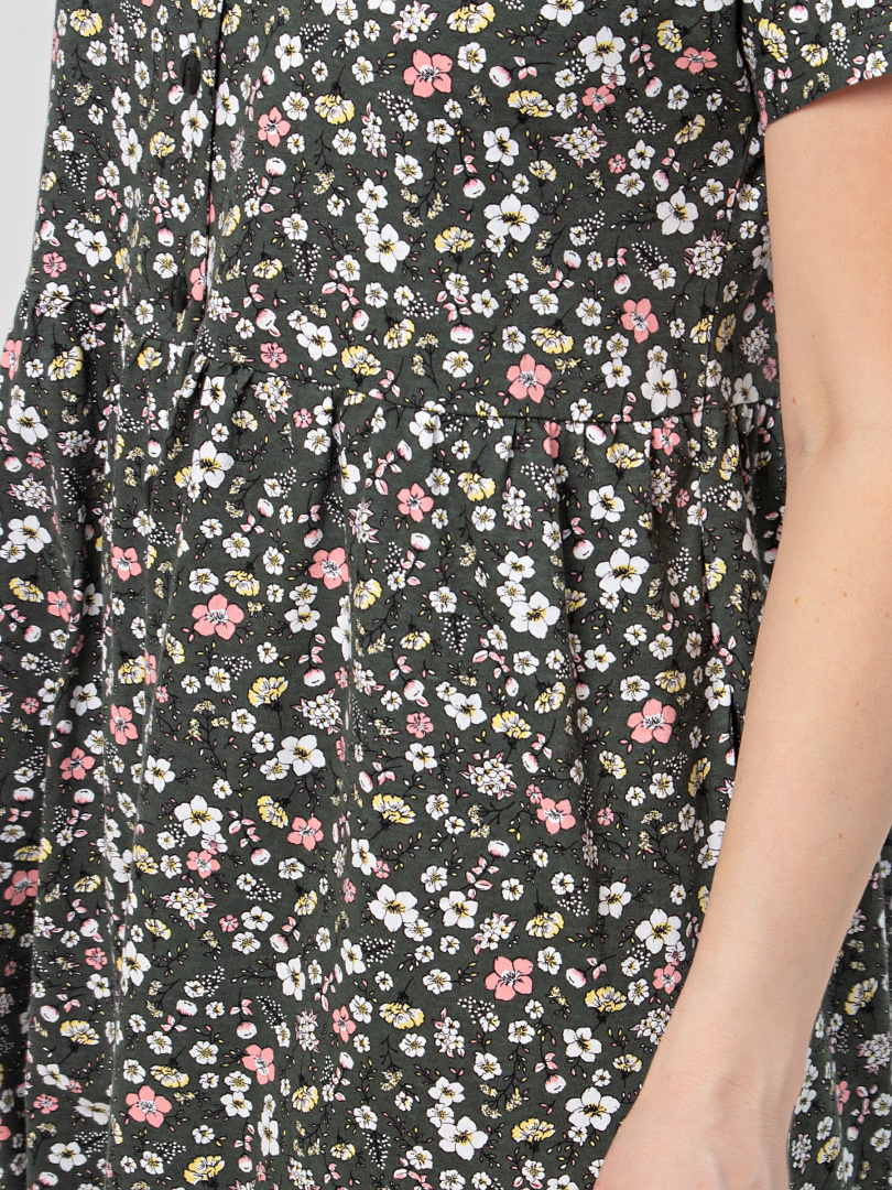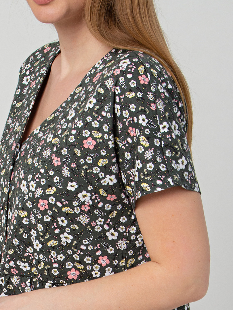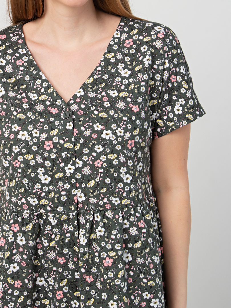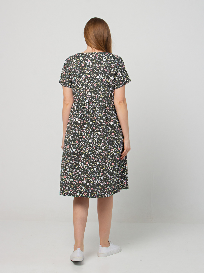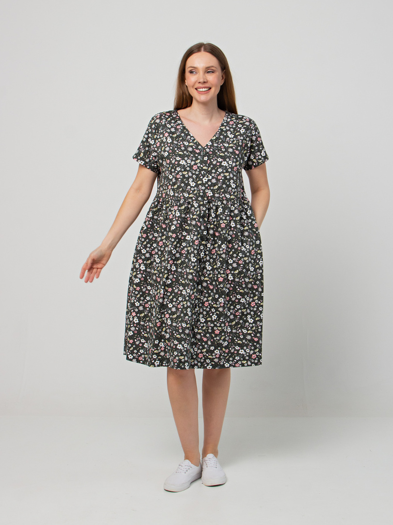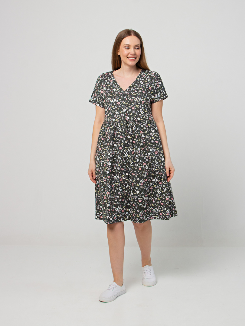 Платье свободного силуэта средней длины, отрезное чуть выше линии талии. Изделие имеет V-образную горловину и застежку на пуговицы до низа. Юбка с боковыми карманами. Платье с коротким спущенным цельнокроеным рукавом.