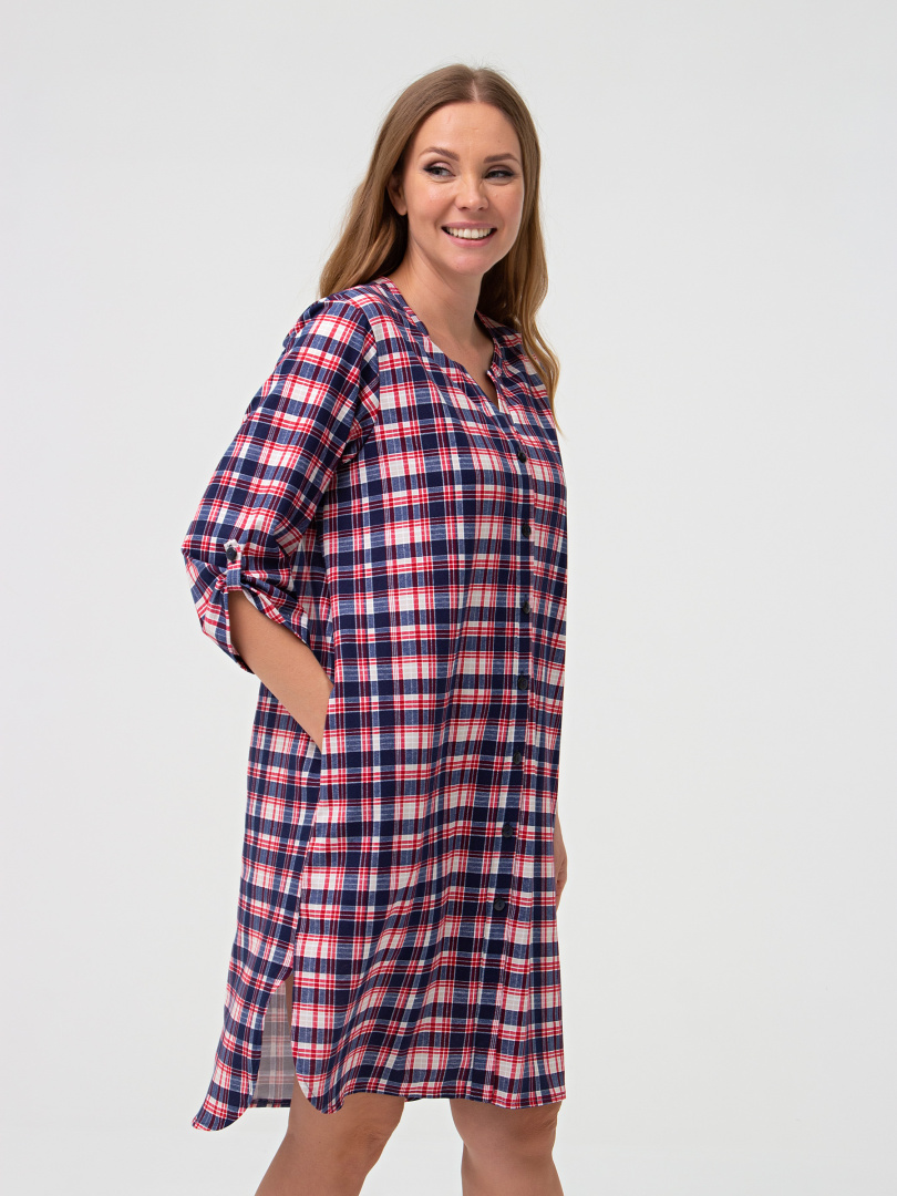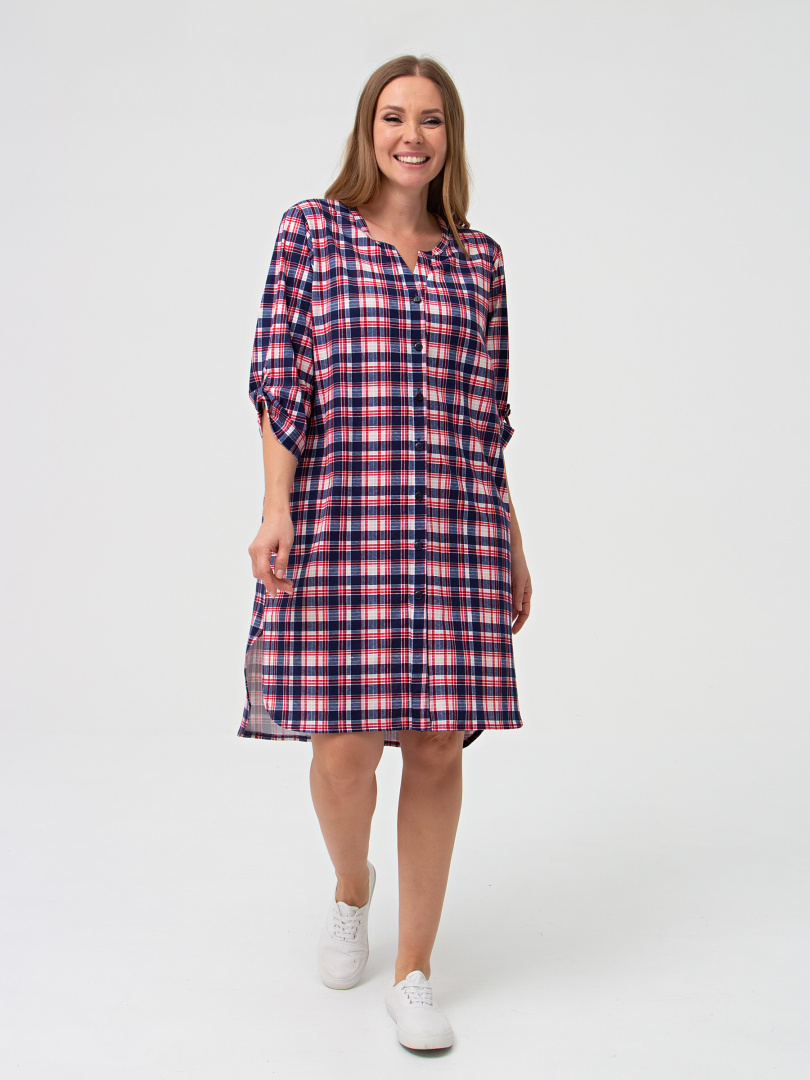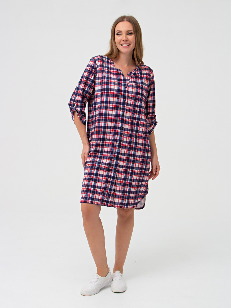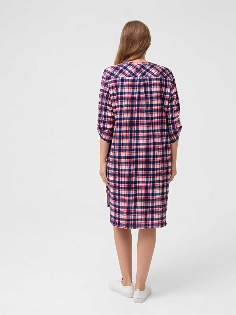 Женская трикотажная туника свободного рубашечного покроя с втачным  рукавом  длиной 3/4. По низу рукава – паты, застегивающиеся на пуговицу. Пата дает возможность регулировать длину рукава.  Длина изделия – миди.  У  модели  удлиненная спинка и боковые разрезы с закругленными краями.  По спинке туника имеет кокетку. Изделие с   застежкой на планке.