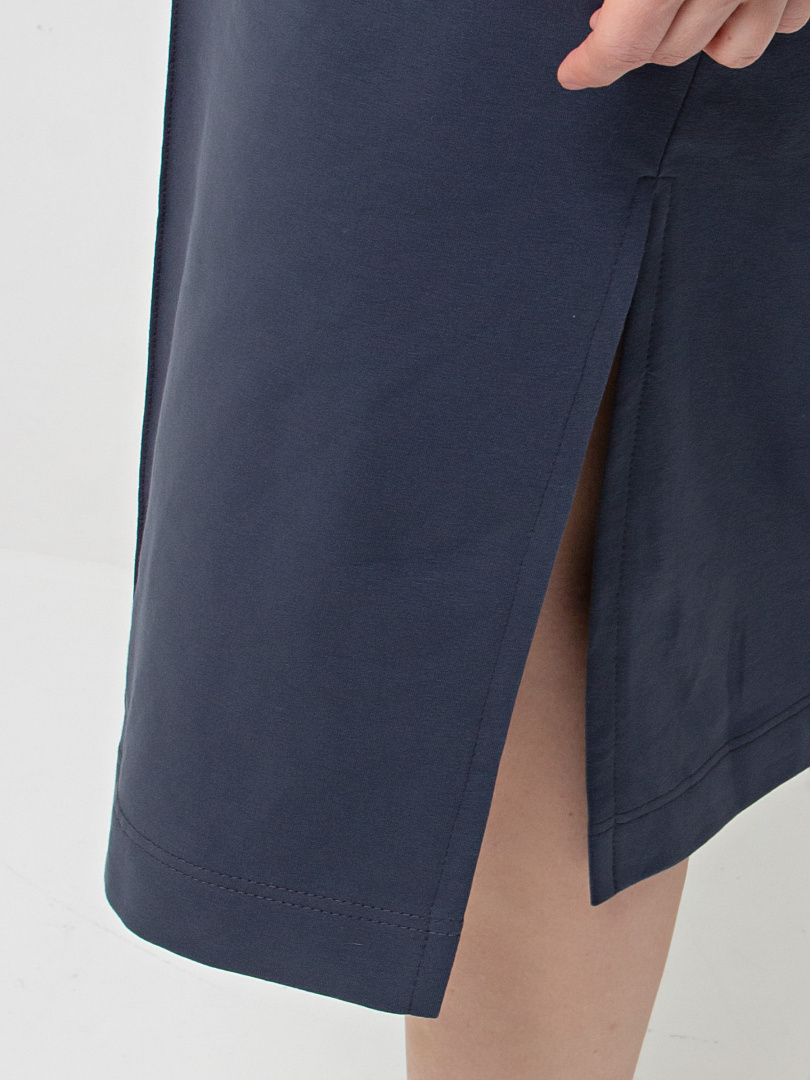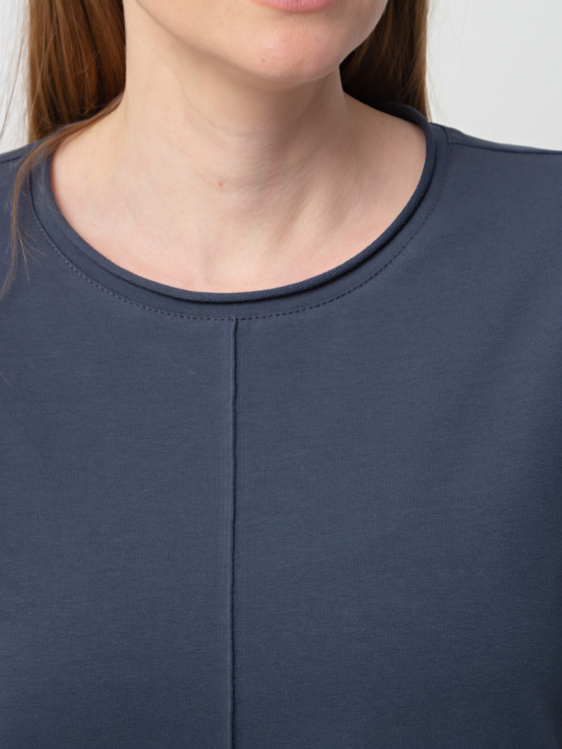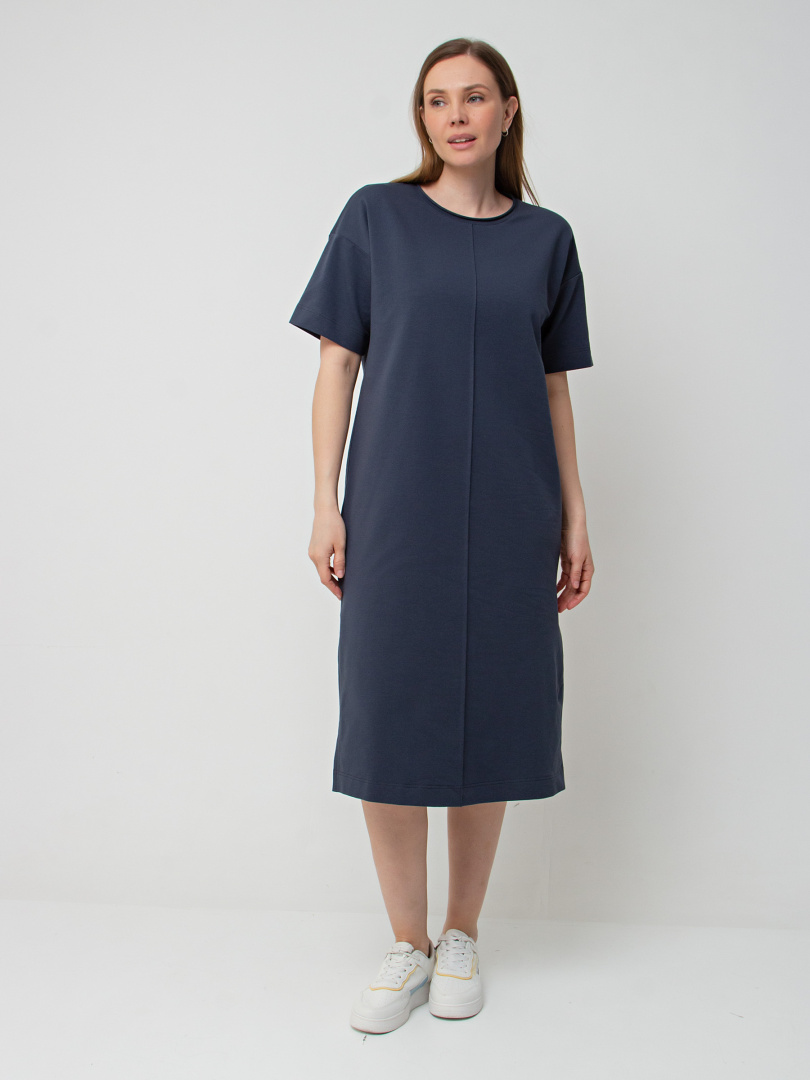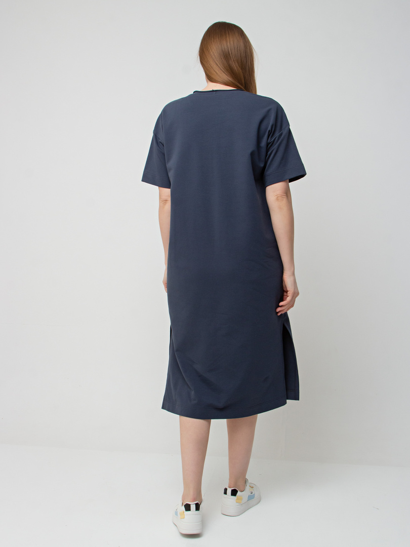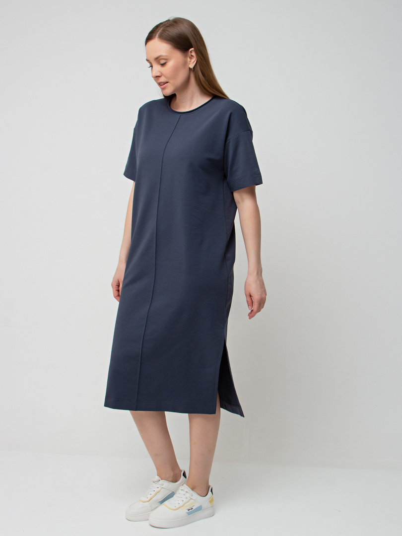 Удлинённое платье прямого силуэта с разрезами по низу боковых швов. Изделие имеет круглый вырез горловины с обтачкой с необработанным срезом. Платье со спущенным плечом и коротким рукавом. По переду – декоративный вертикальный шов.