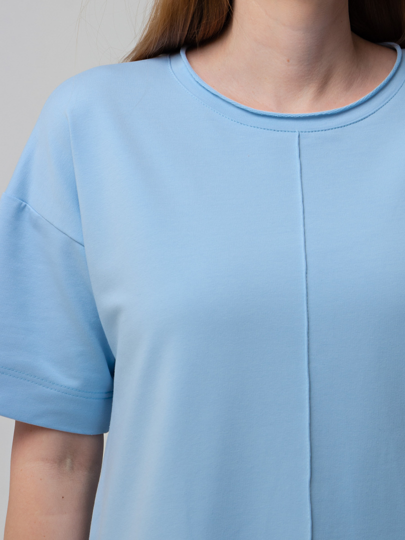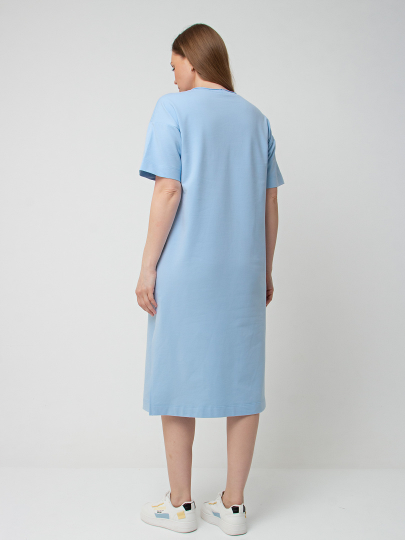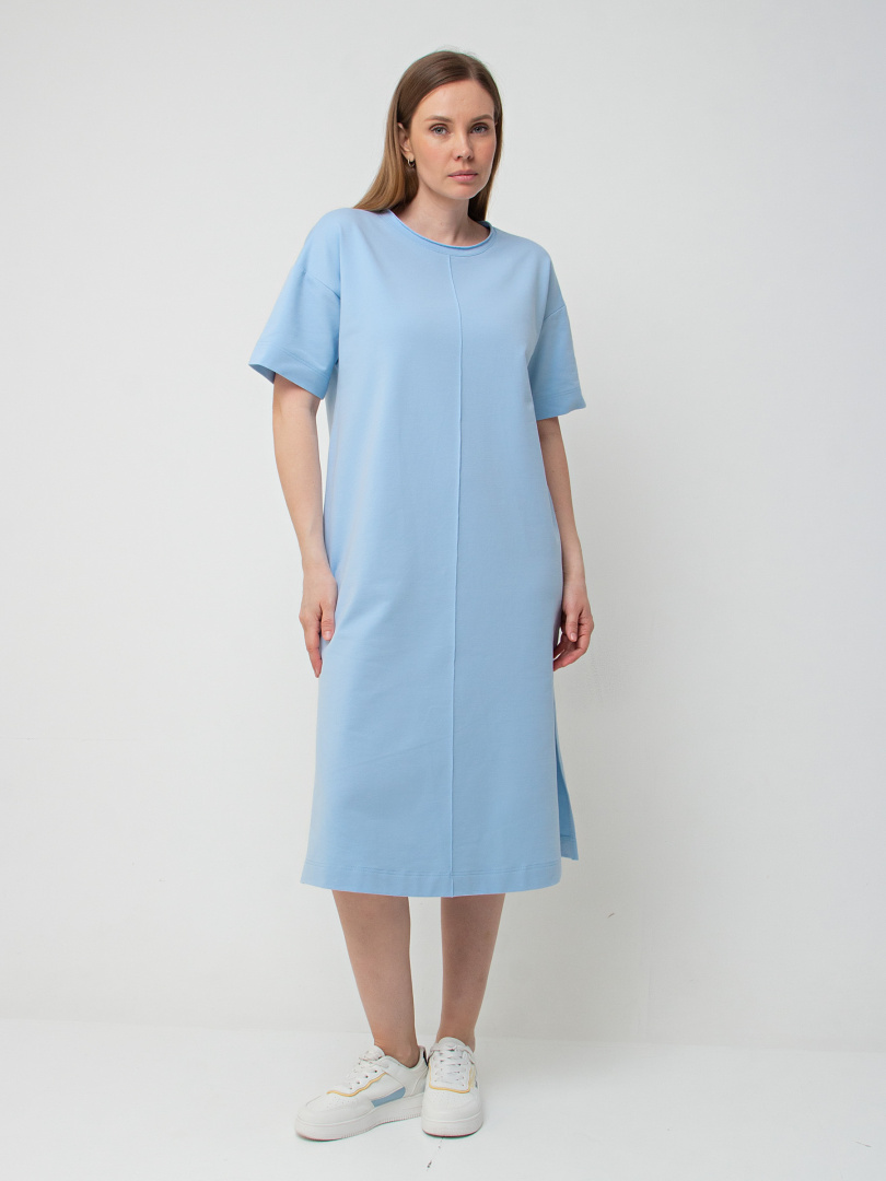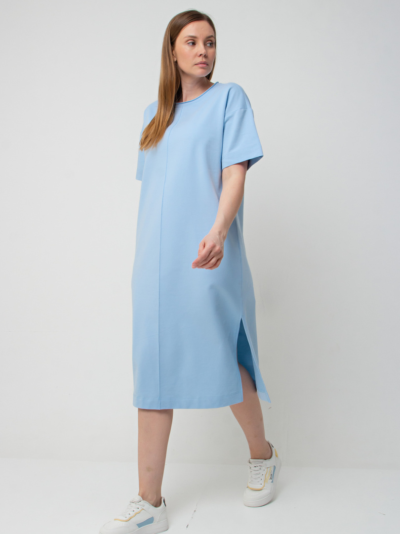 Удлинённое платье прямого силуэта с разрезами по низу боковых швов. Изделие имеет круглый вырез горловины с обтачкой с необработанным срезом. Платье со спущенным плечом и коротким рукавом. По переду – декоративный вертикальный шов.
