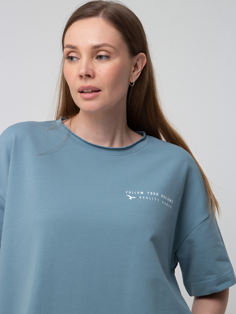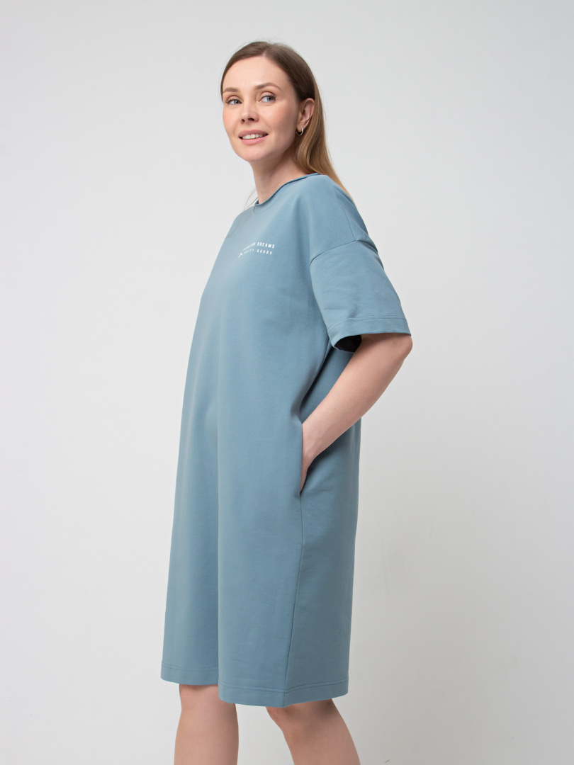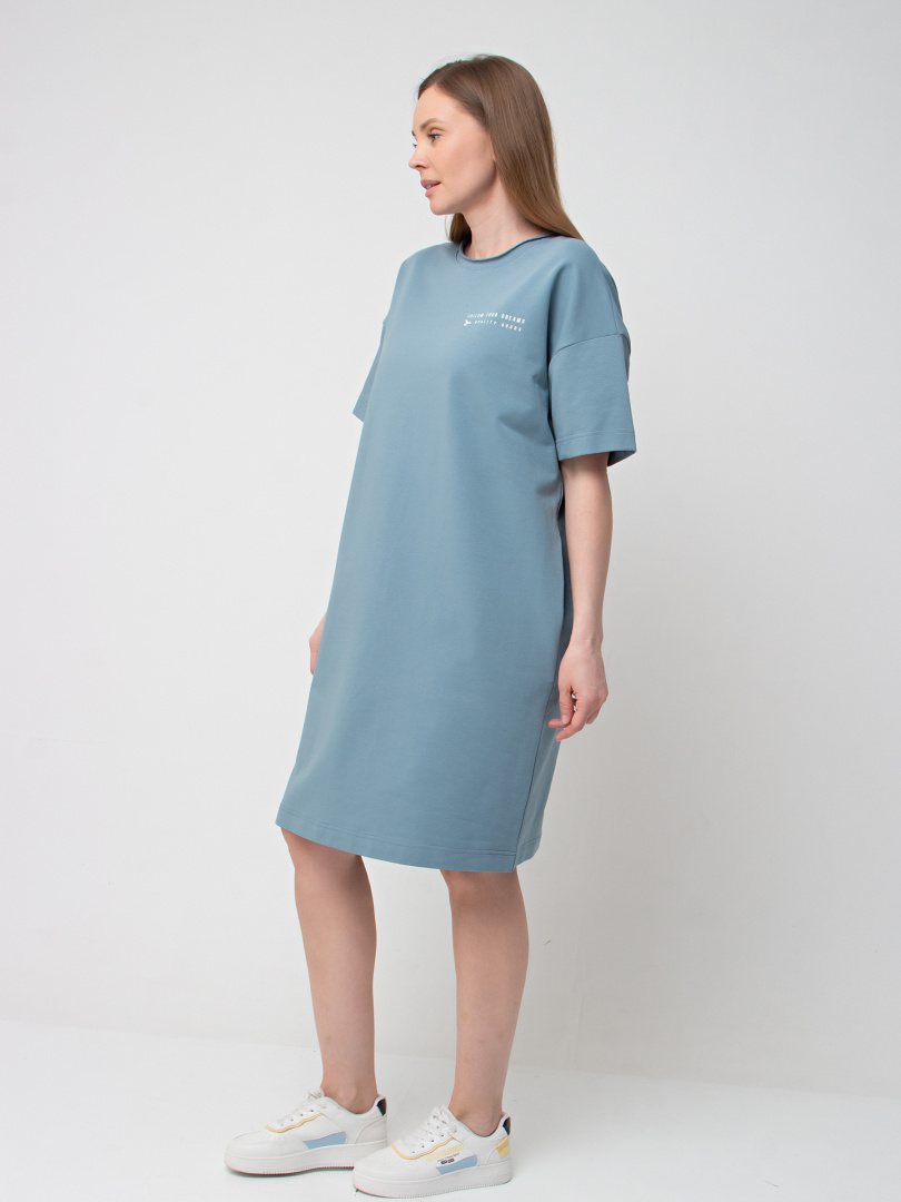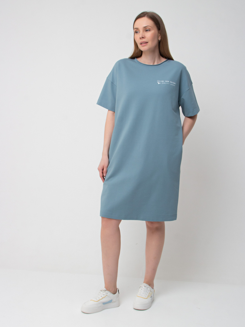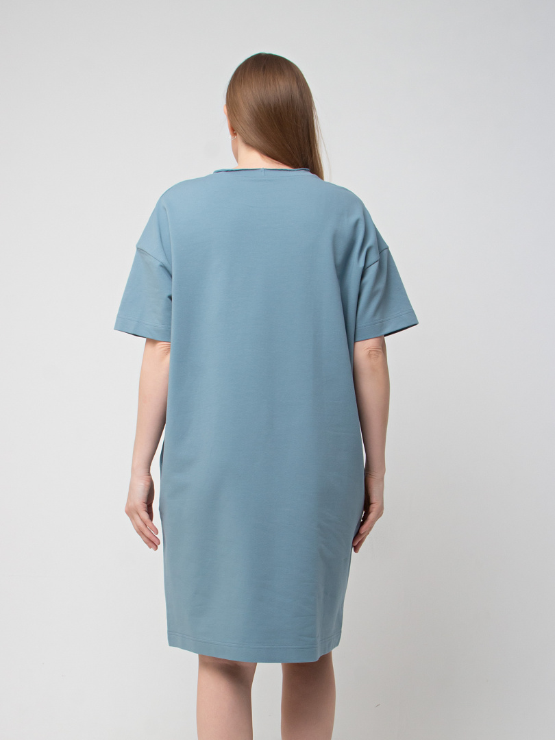 Женское трикотажное платье прямого силуэта с коротким рукавом. Длина миди. Вырез горловины круглый с обтачкой с необработанным срезом. В боковых швах модель имеет внутренние карманы.