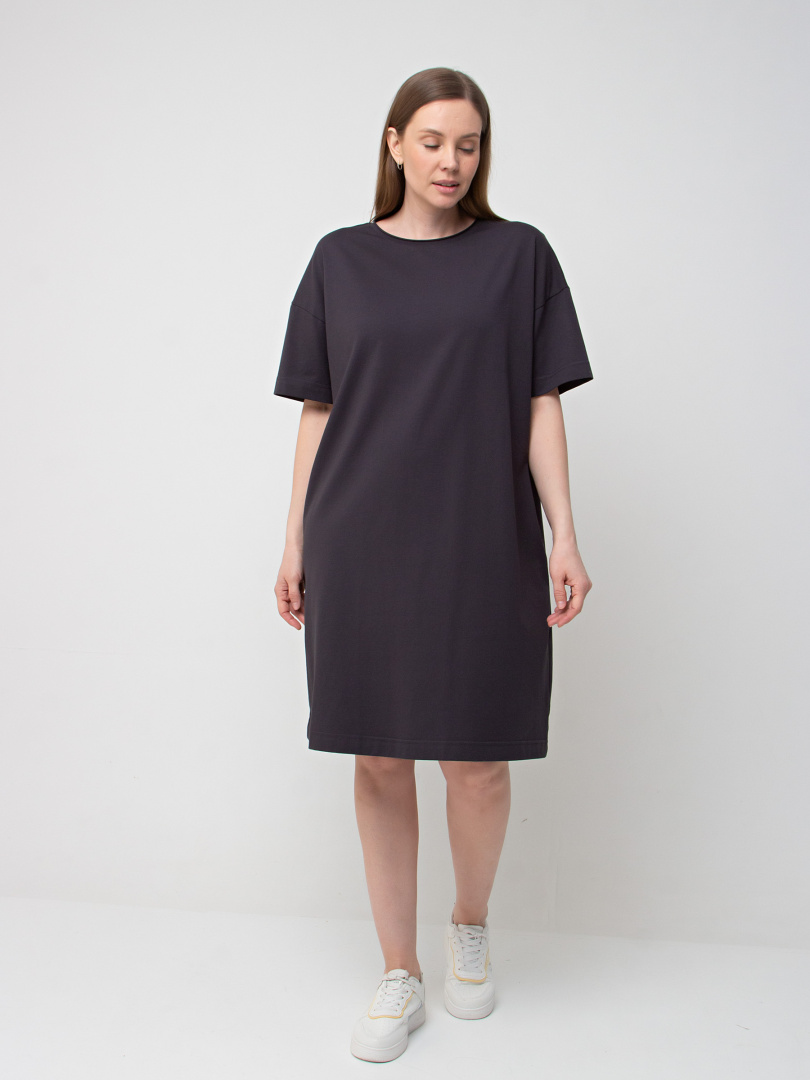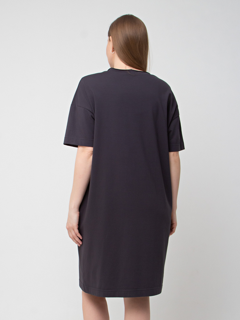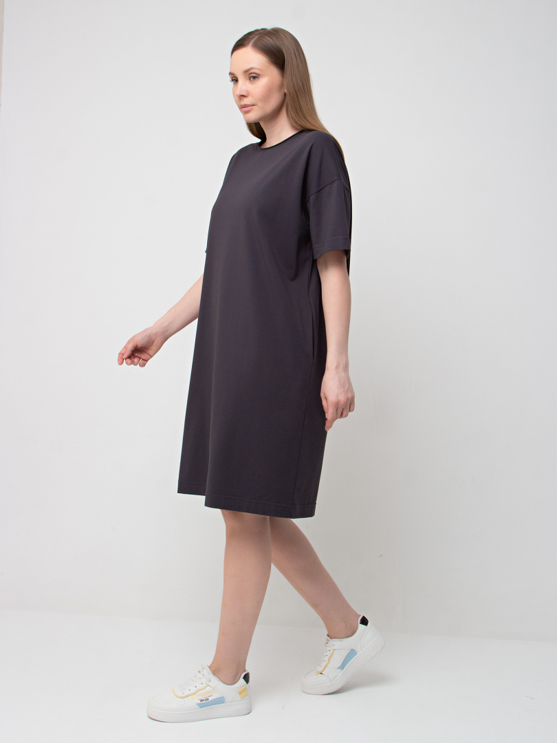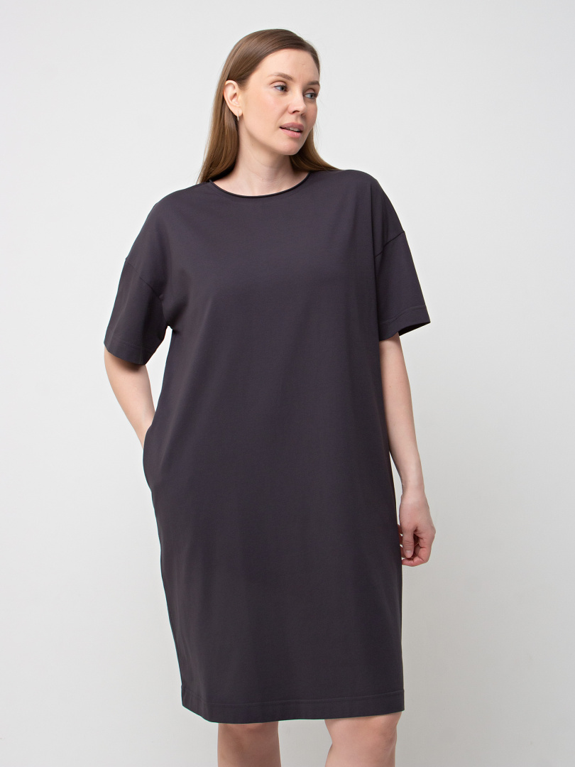Женское трикотажное платье прямого силуэта с коротким рукавом. Длина миди. Вырез горловины круглый с обтачкой с необработанным срезом. В боковых швах модель имеет внутренние карманы.