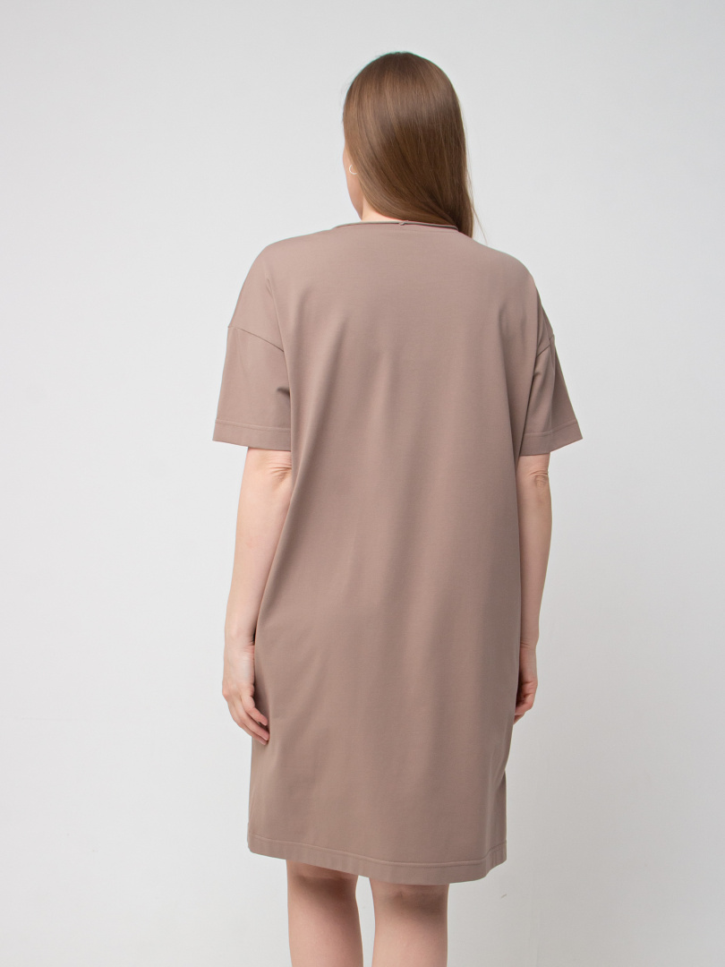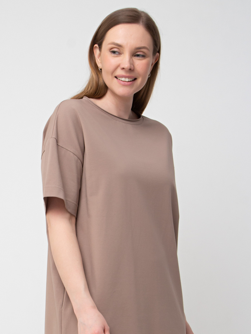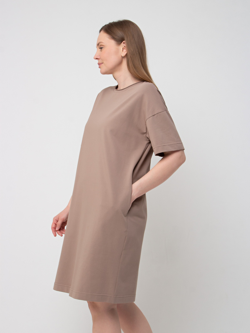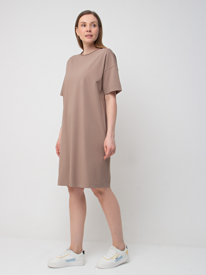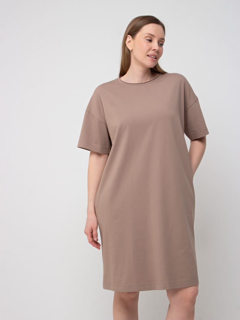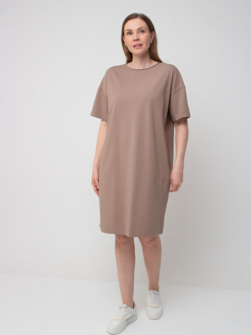 Женское трикотажное платье прямого силуэта с коротким рукавом. Длина миди. Вырез горловины круглый с обтачкой с необработанным срезом. В боковых швах модель имеет внутренние карманы.