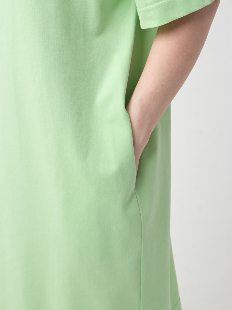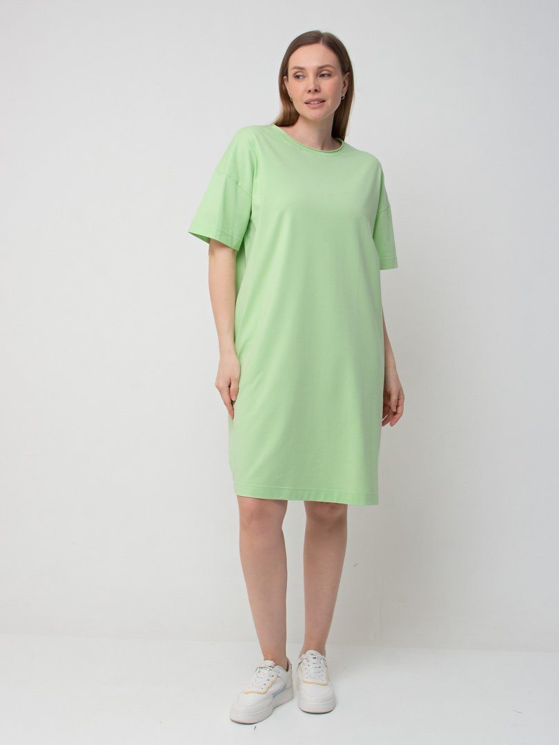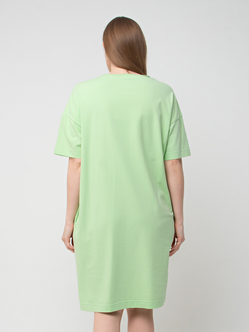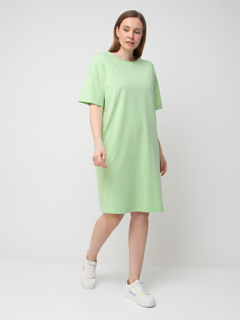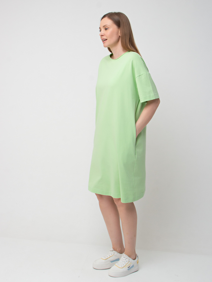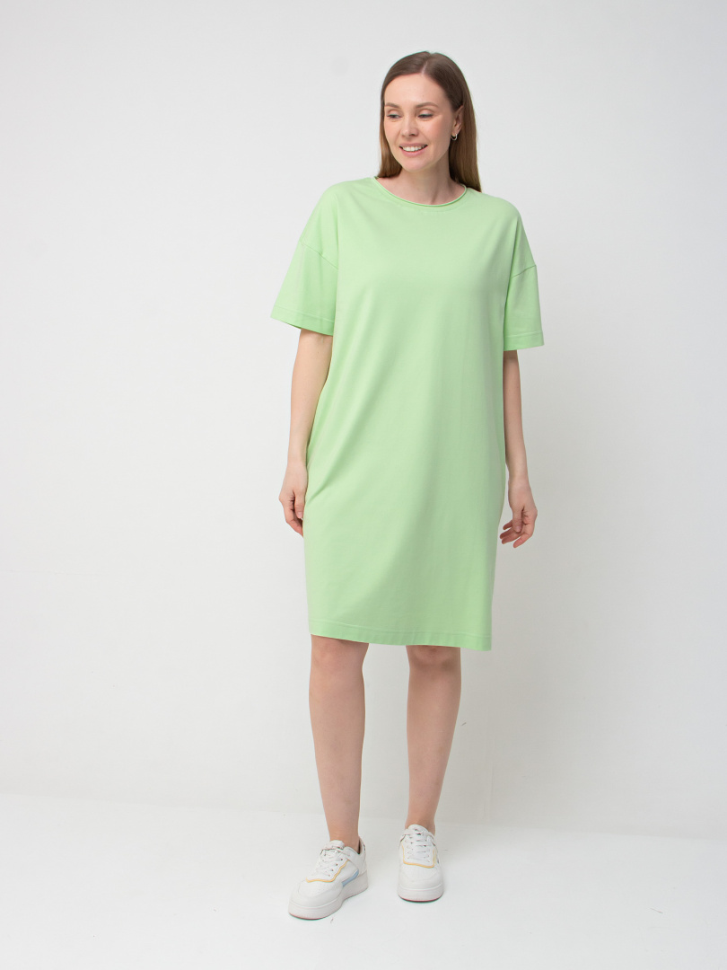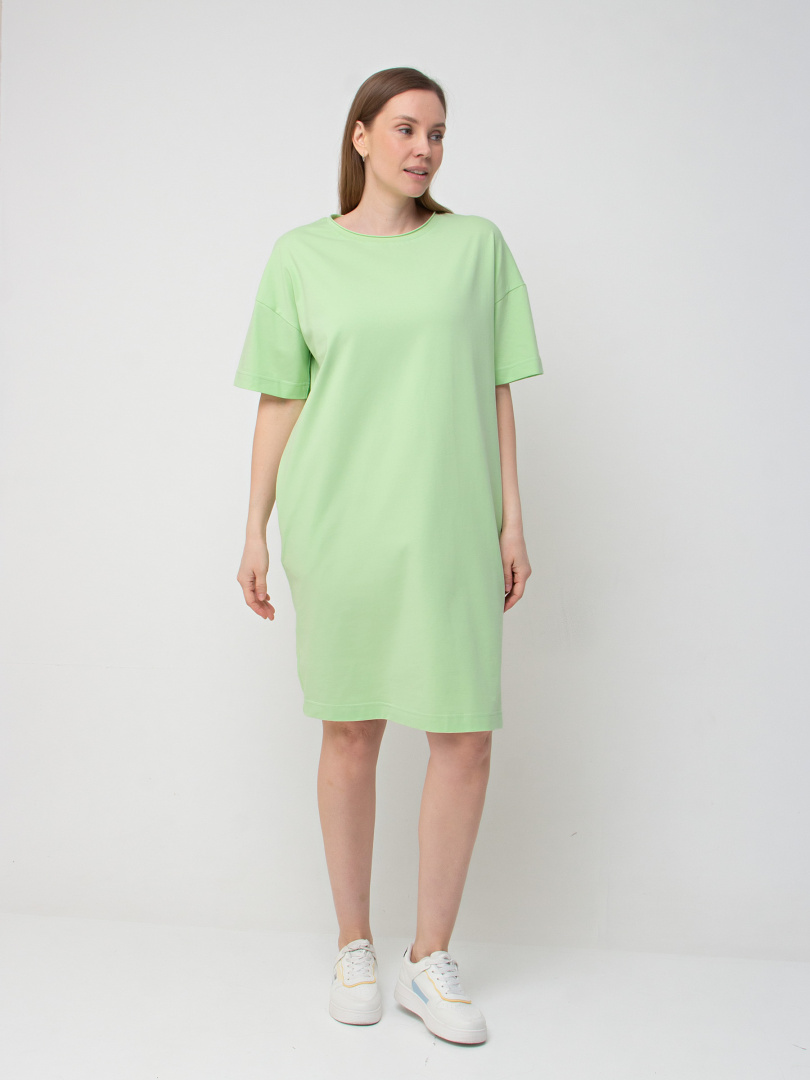 Женское трикотажное платье прямого силуэта с коротким рукавом. Длина миди. Вырез горловины круглый с обтачкой с необработанным срезом. В боковых швах модель имеет внутренние карманы.