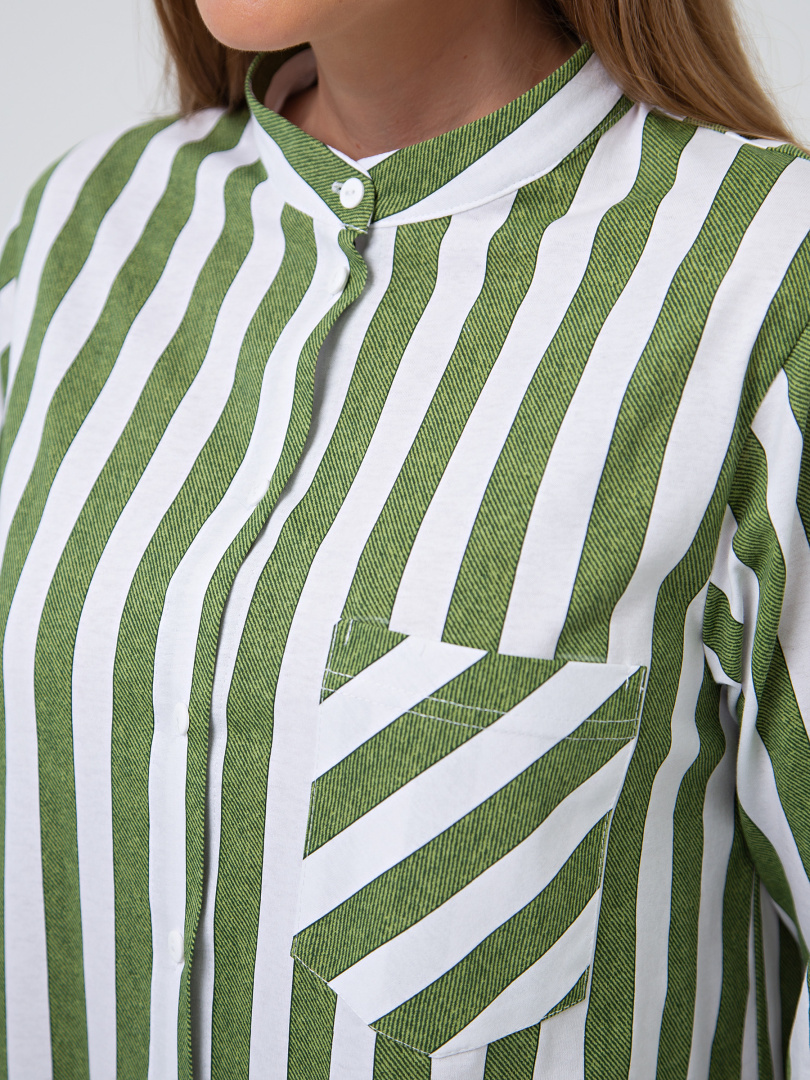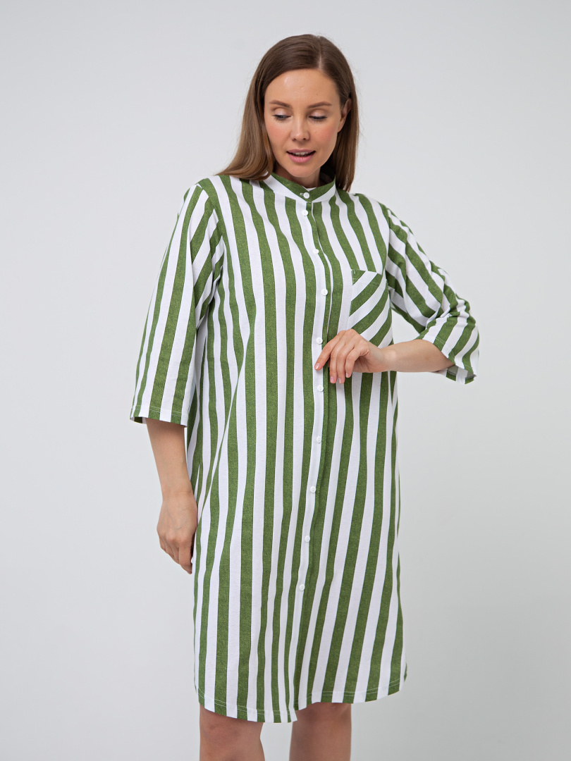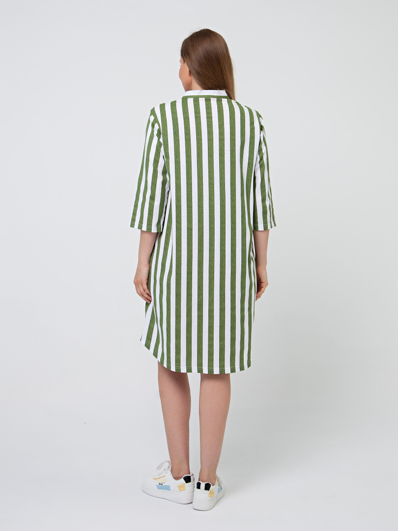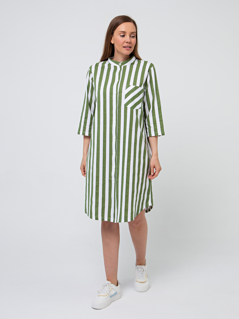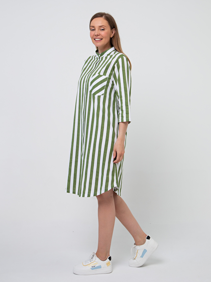 Женское трикотажное платье-рубашка свободного покроя с втачным рукавом. На левой части платья – накладной карман. Воротник - стойка. Рукав 3/4. Фигурная линия низа. Длина – миди.
