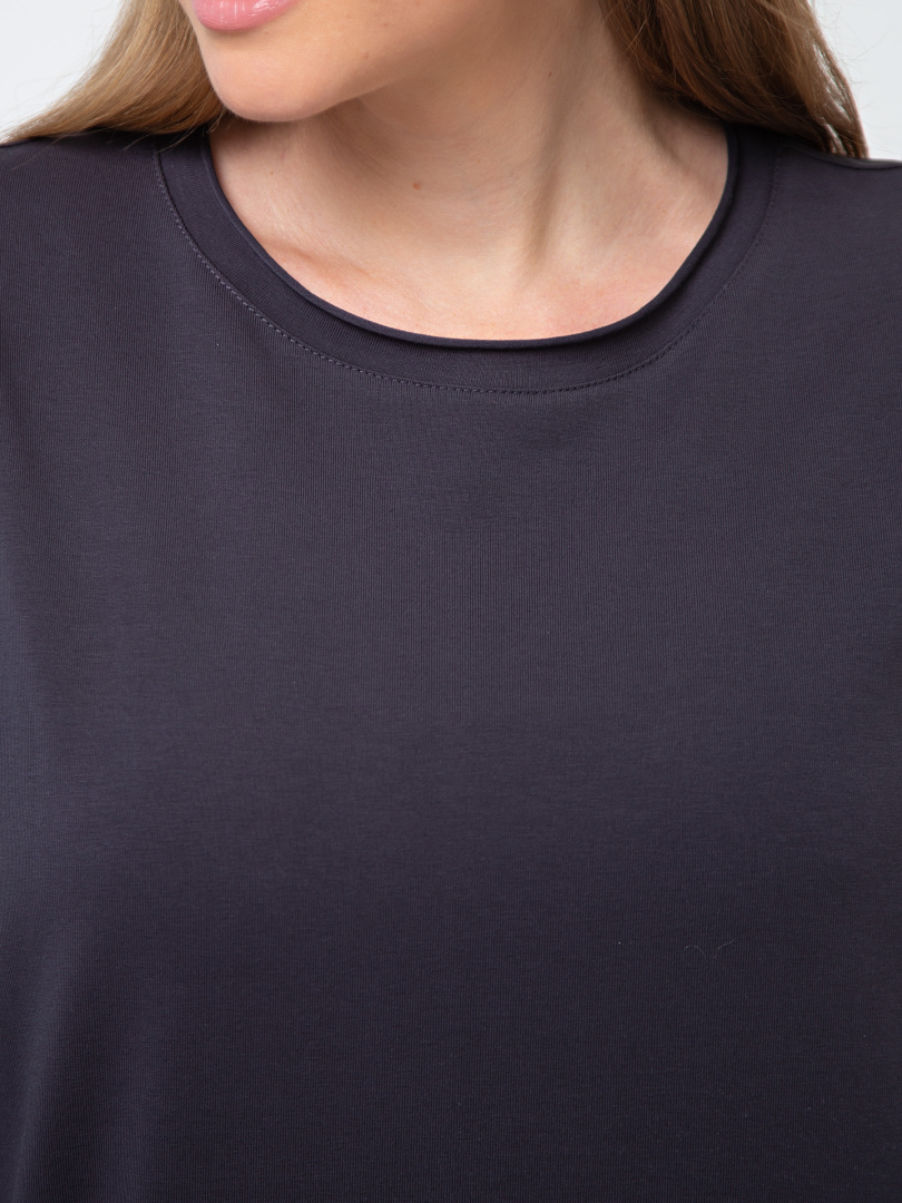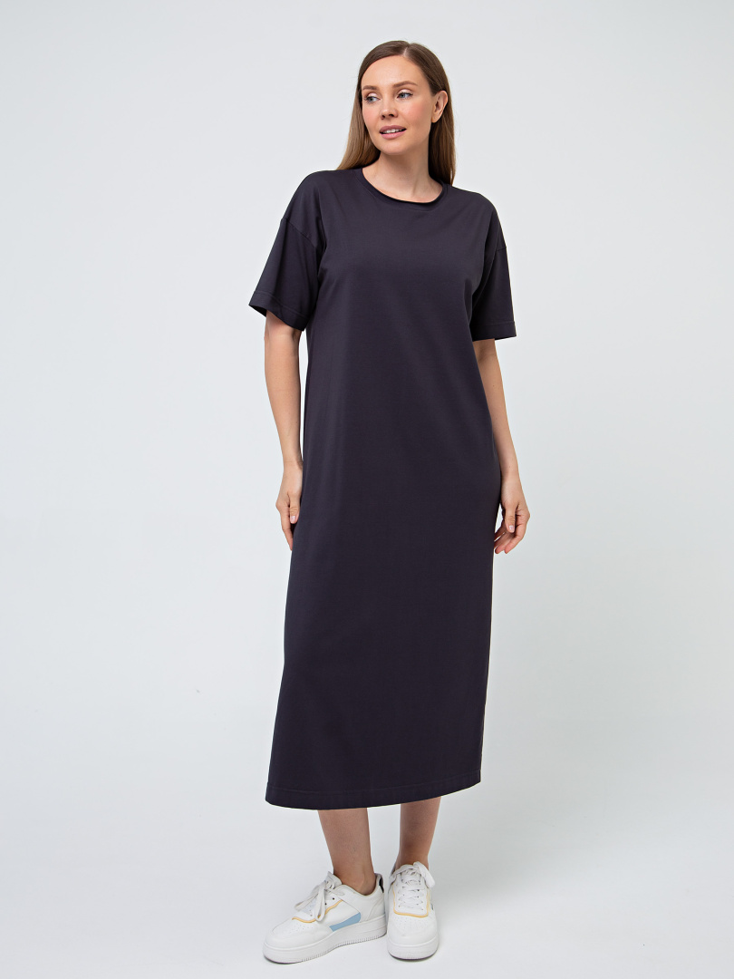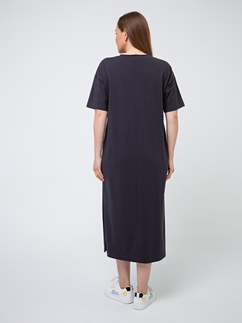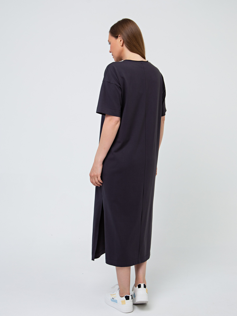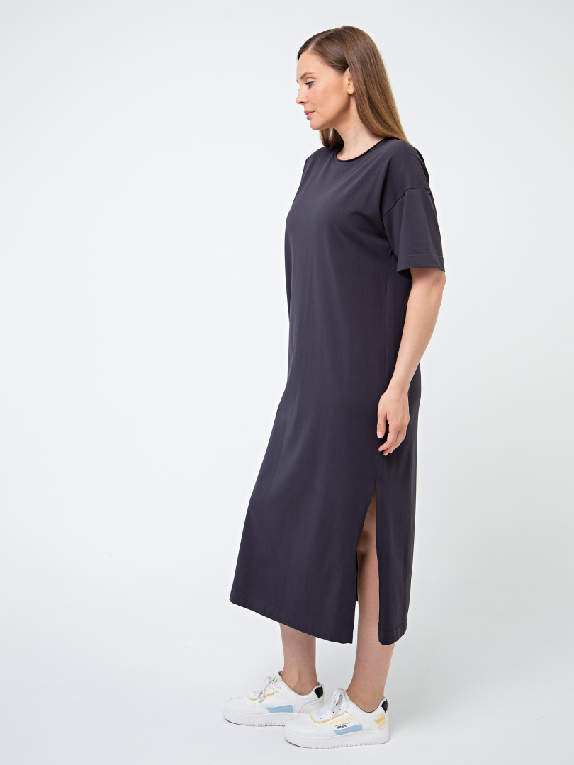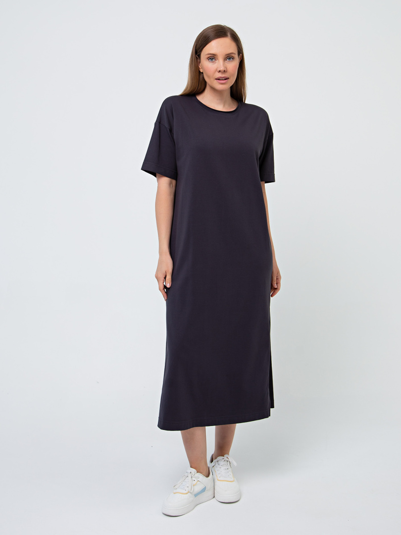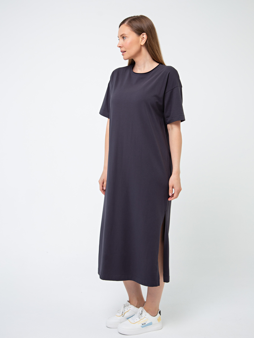 Удлинённое платье прямого силуэта с разрезами по низу боковых швов. Изделие имеет круглый вырез горловины с обтачкой с необработанным срезом. Платье со спущенным плечом и коротким рукавом.