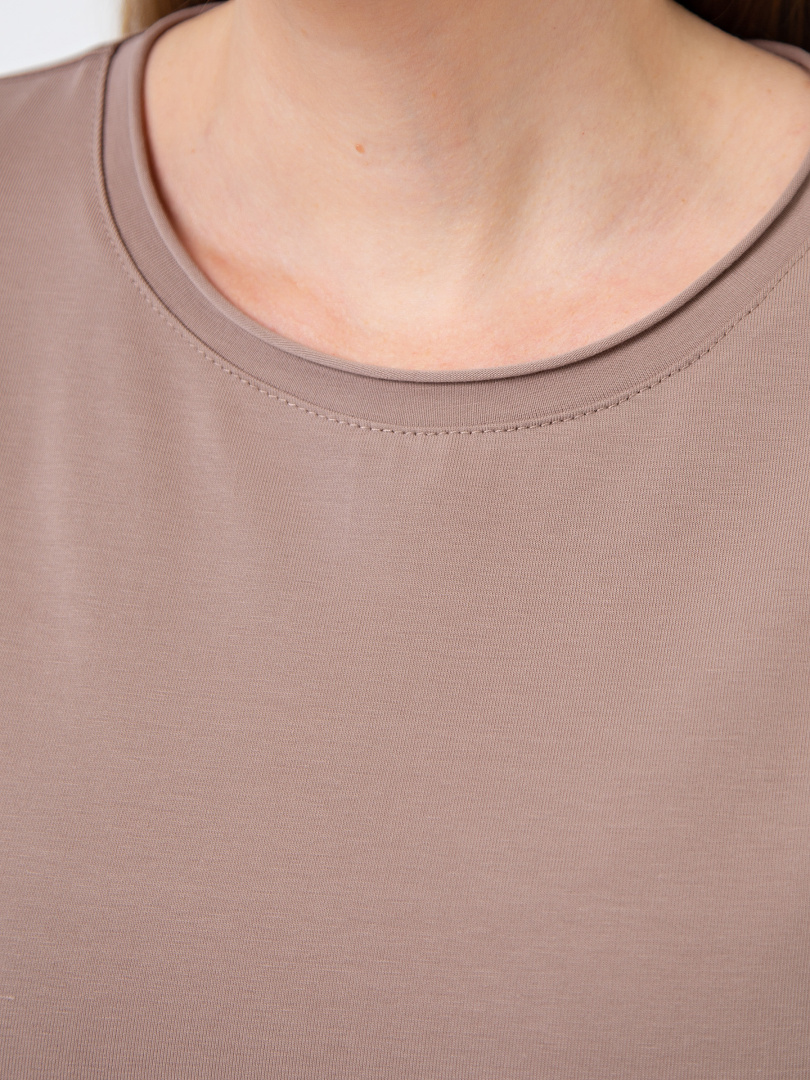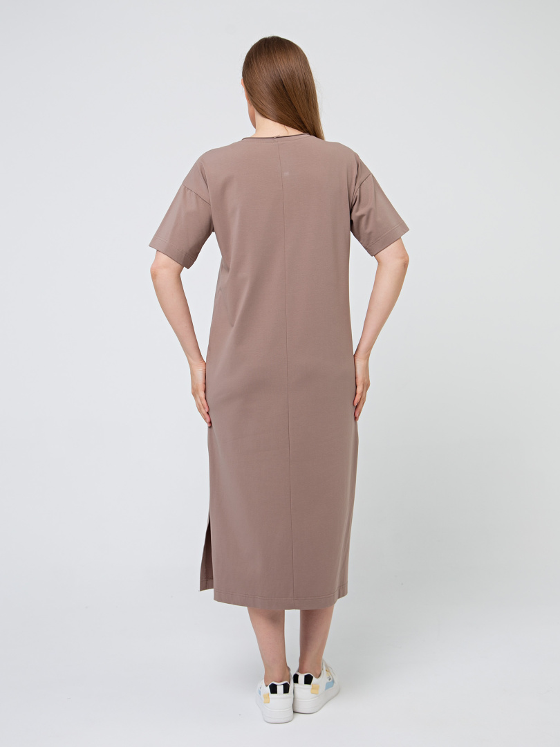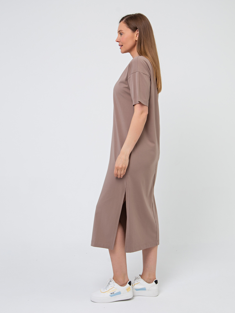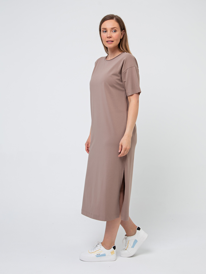 Удлинённое платье прямого силуэта с разрезами по низу боковых швов. Изделие имеет круглый вырез горловины с обтачкой с необработанным срезом. Платье со спущенным плечом и коротким рукавом.