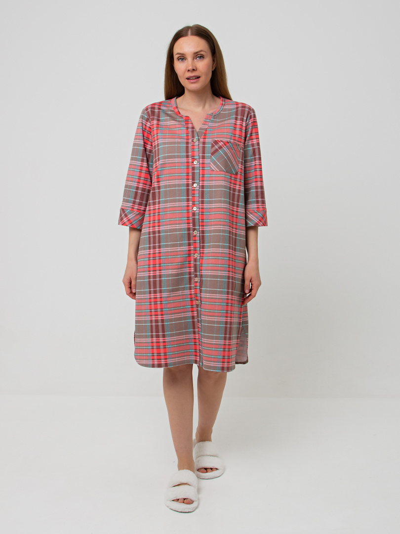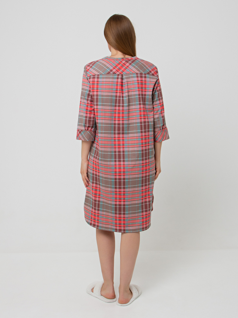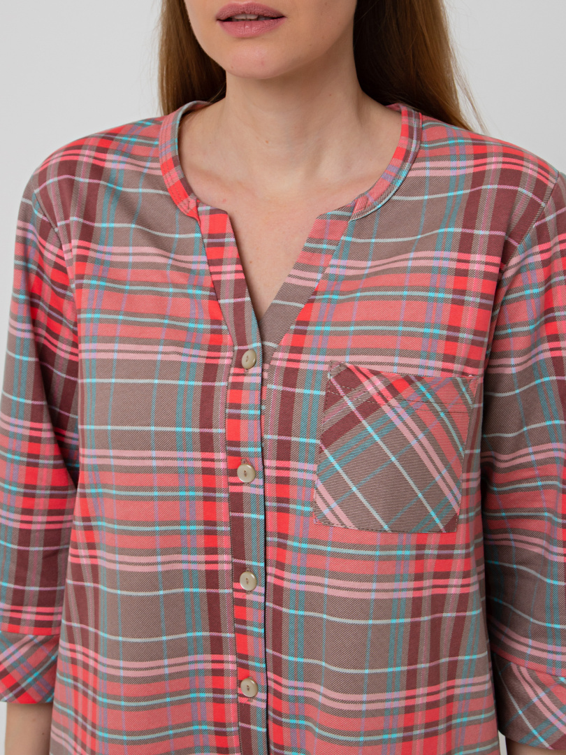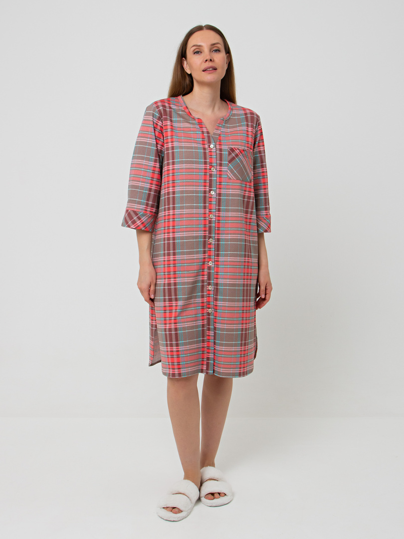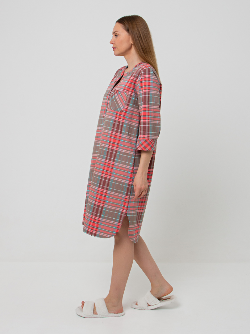 Женское трикотажное платье свободного рубашечного покроя с втачным рукавом длиной 3/4. По низу рукава притачные манжеты. Длина изделия – миди. У модели - боковые разрезы с закругленными краями. По спинке платье имеет кокетку. На груди накладной кармашек и планка с застежкой на 7 петель и пуговиц.