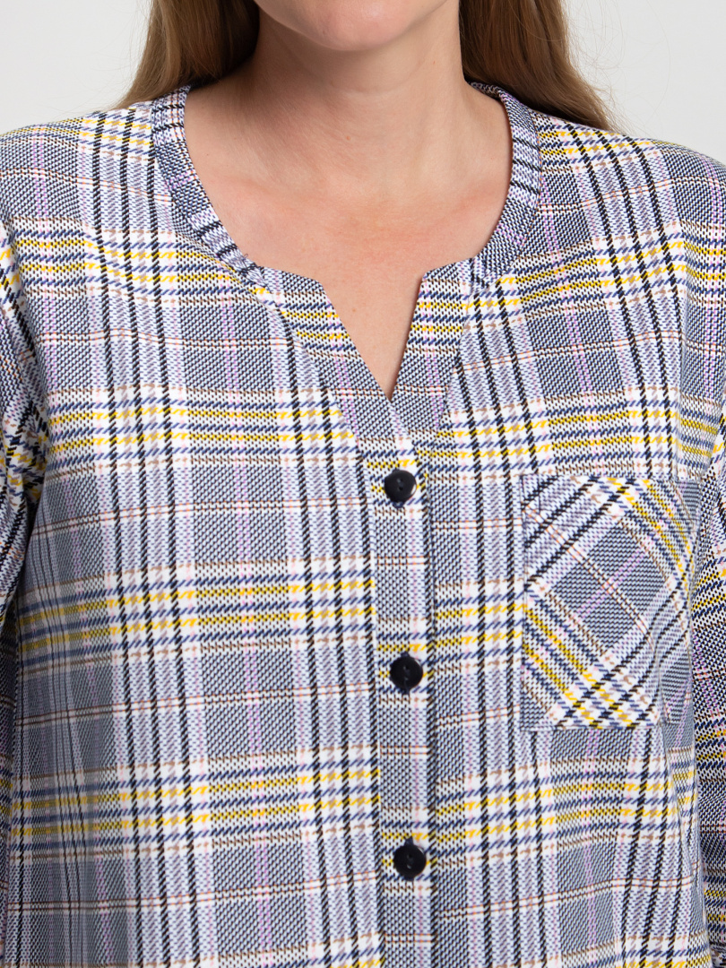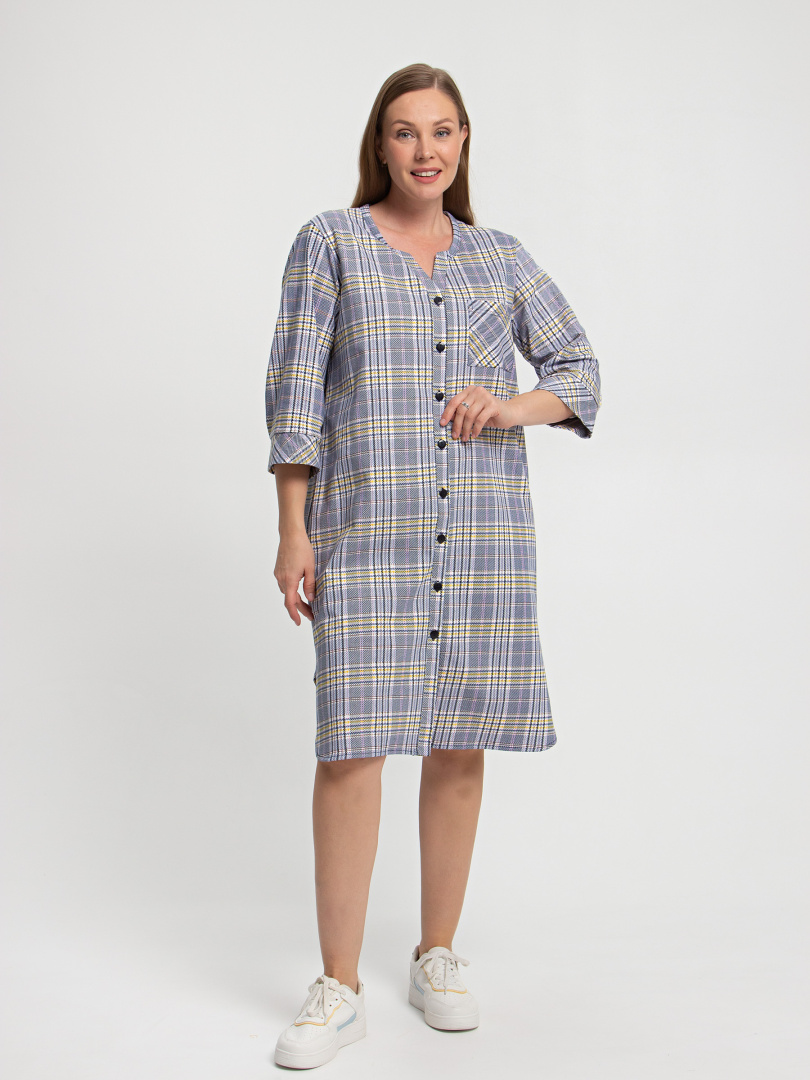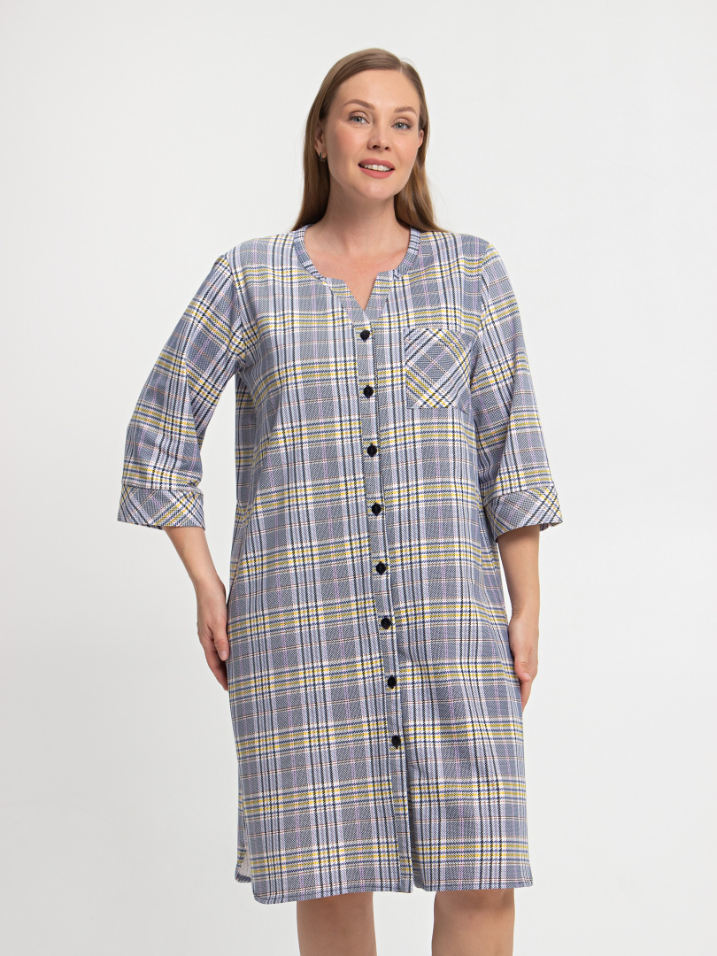 Женское трикотажное платье свободного рубашечного покроя с втачным  рукавом  длиной 3/4. По низу рукава притачные  манжеты.  Длина изделия – миди.  У  модели - боковые разрезы с закругленными краями.  По спинке платье имеет кокетку. На груди  накладной кармашек и планка с застежкой на 7 петель и пуговиц.