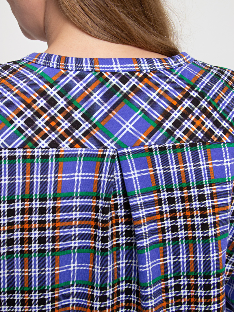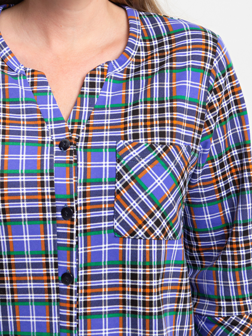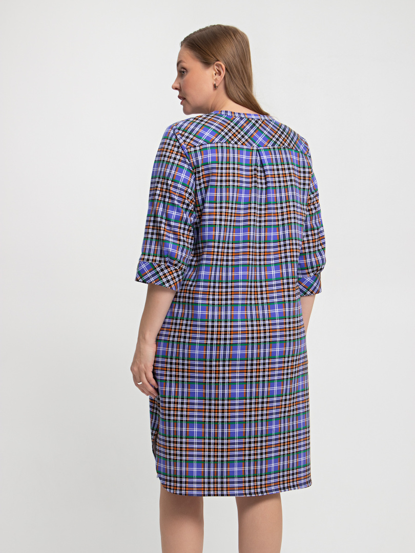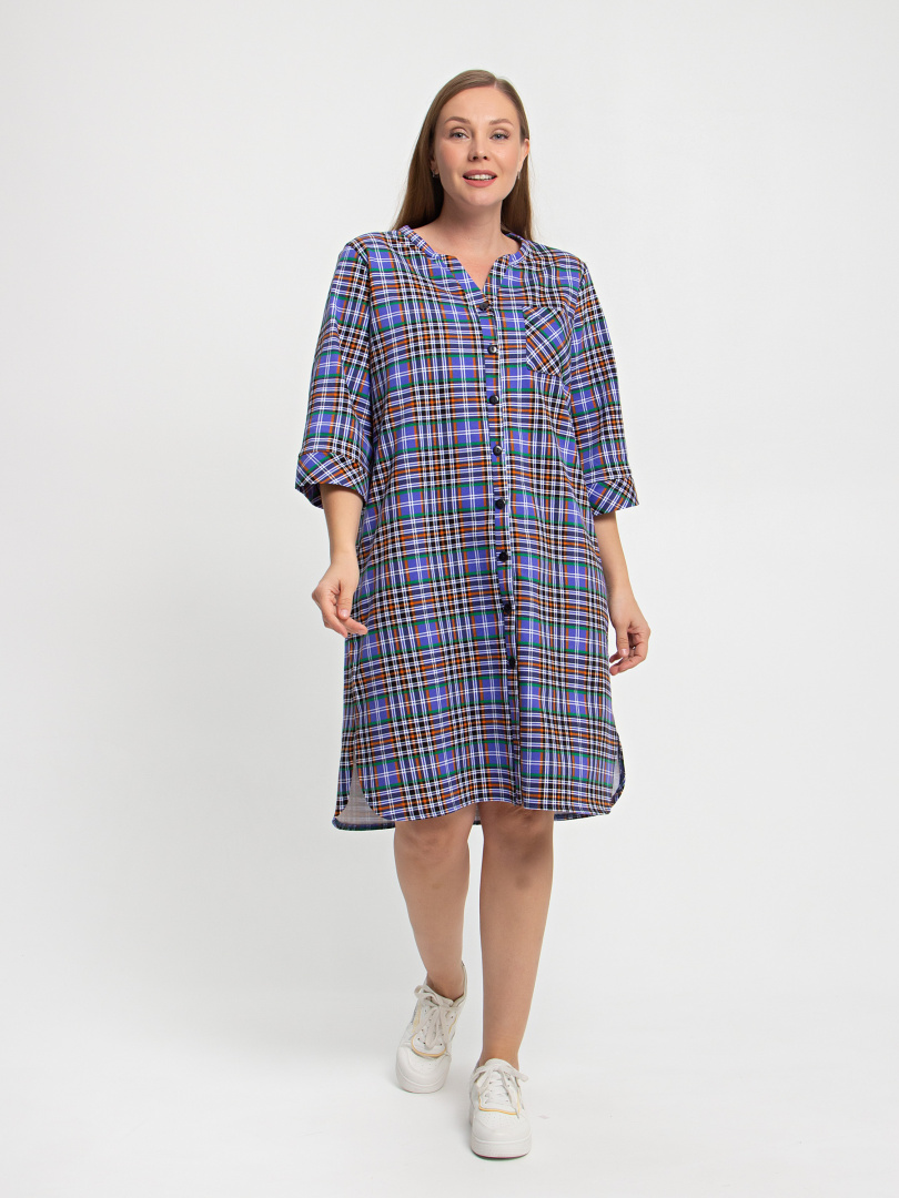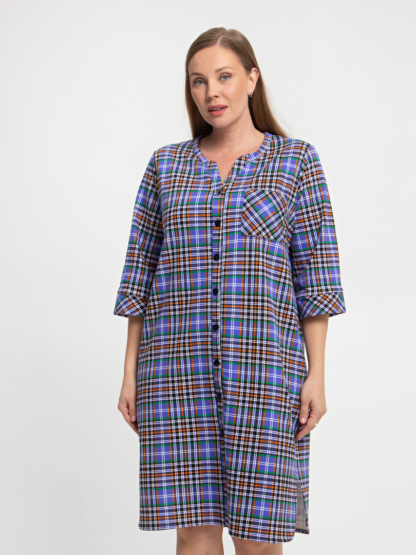 Женское трикотажное платье свободного рубашечного покроя с втачным  рукавом  длиной 3/4. По низу рукава притачные  манжеты.  Длина изделия – миди.  У  модели - боковые разрезы с закругленными краями.  По спинке платье имеет кокетку. На груди  накладной кармашек и планка с застежкой на 7 петель и пуговиц.