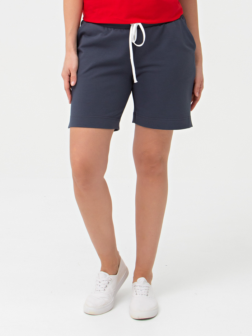 Шорты средней длины, выполненные из плотного трикотажного полотна - футер. Модель с удобной средней посадкой. Пояс на широкой резине со шнуром. На передних половинках боковые карманы с наклонным входом. По боковым швам – небольшие разрезы.
