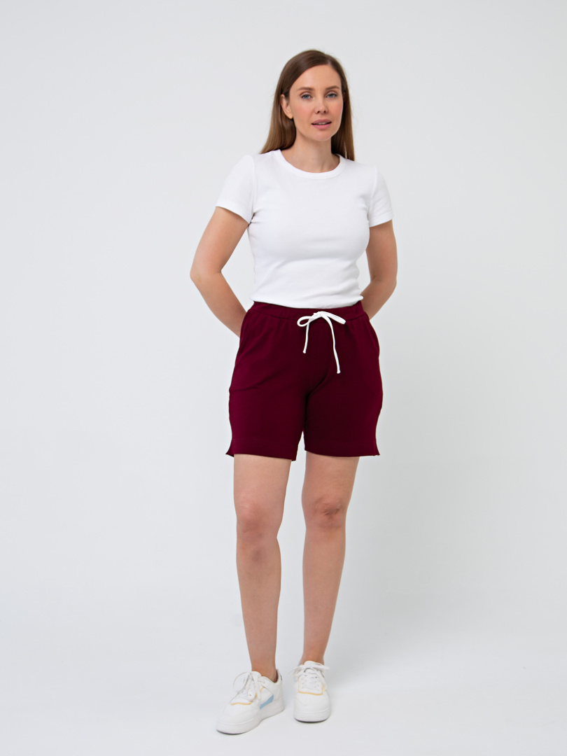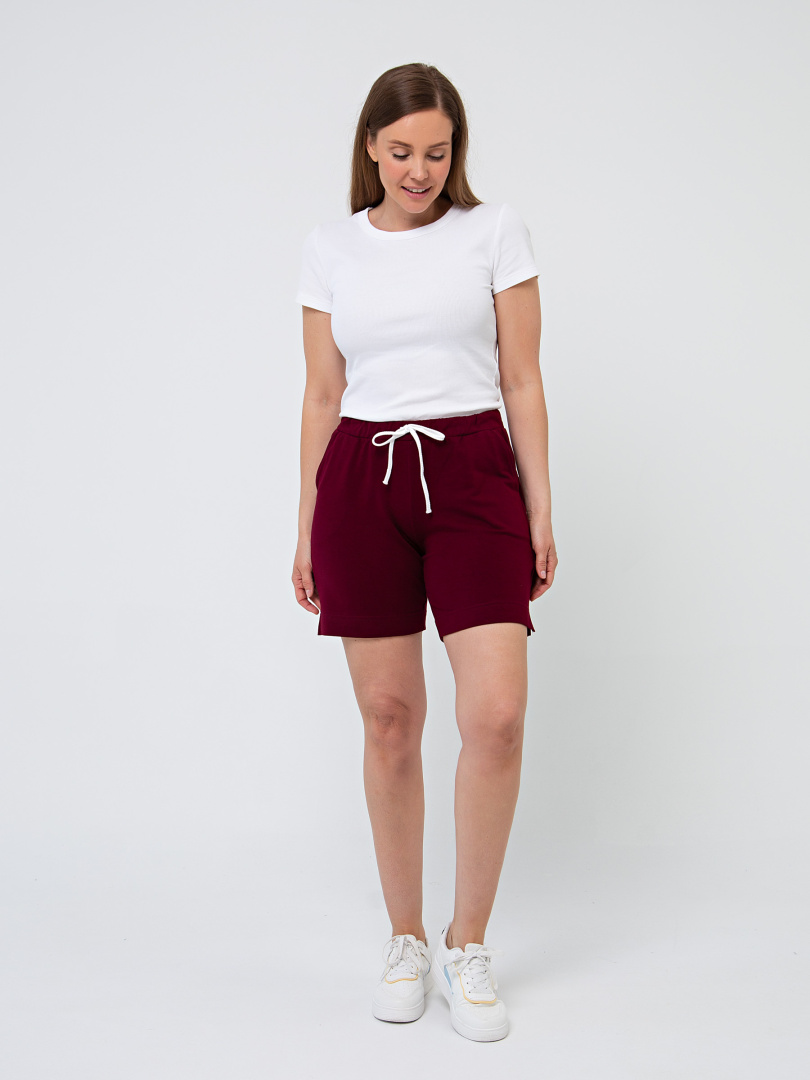 Шорты средней длины, выполненные из плотного трикотажного полотна - футер. Модель с удобной средней посадкой. Пояс на широкой резине со шнуром. На передних половинках боковые карманы с наклонным входом. По боковым швам – небольшие разрезы.