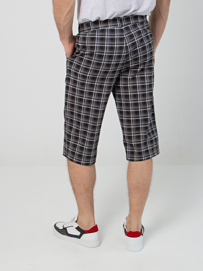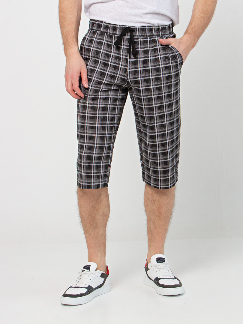 Хлопковые трикотажные бриджи длиной до середины икры. Модель прямого покроя слегка заужена книзу. Притачной пояс с широкой резинкой и шнуром. На передней половинке боковые карманы.